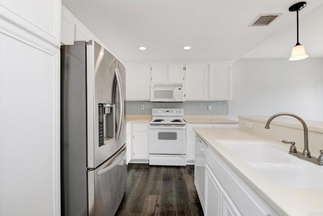 RARE Bottom Floor Unit- No Stairs! Additional perks- HOA covers water (No water bill), multiple pools, spas, a tennis court, fitness center, club house, and a really cool play area! Great location and great amenities. This 2-bedroom, 2-bath condo features an open floor plan with vaulted ceilings, recessed lighting, private patio, fireplace and in-unit washer and dryer. Primary bedroom includes a huge walk in closet! Both bedrooms offer plenty of space, and will even comfortably fit a work space if needed. The modern kitchen offers lots of storage with refinished, wall-to-wall cabinetry. You even have your own private patio with an extra storage area. . The location is perfect- close to beaches, shopping, hiking, and amazing dining options - all within a top-rated school district!