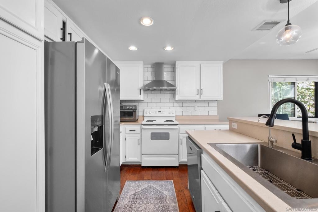 Welcome to this stunning upper end-unit condo in the highly desirable Bernardo Pines community! This light-filled 2 bed/ 2 bath home features soaring vaulted ceilings in the family room, creating a spacious and airy atmosphere.The beautifully updated kitchen showcases crisp white cabinetry, stainless steel appliances, a modern range hood, subway tile backsplash, recessed lighting, and stylish pendant lights over the bar top. Additional highlights include laminate flooring throughout, a convenient full-size laundry closet, and abundant natural light. Perfectly located near freeways, shopping, dining, and recreation, this home offers the ideal blend of comfort and convenience.