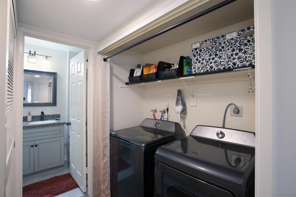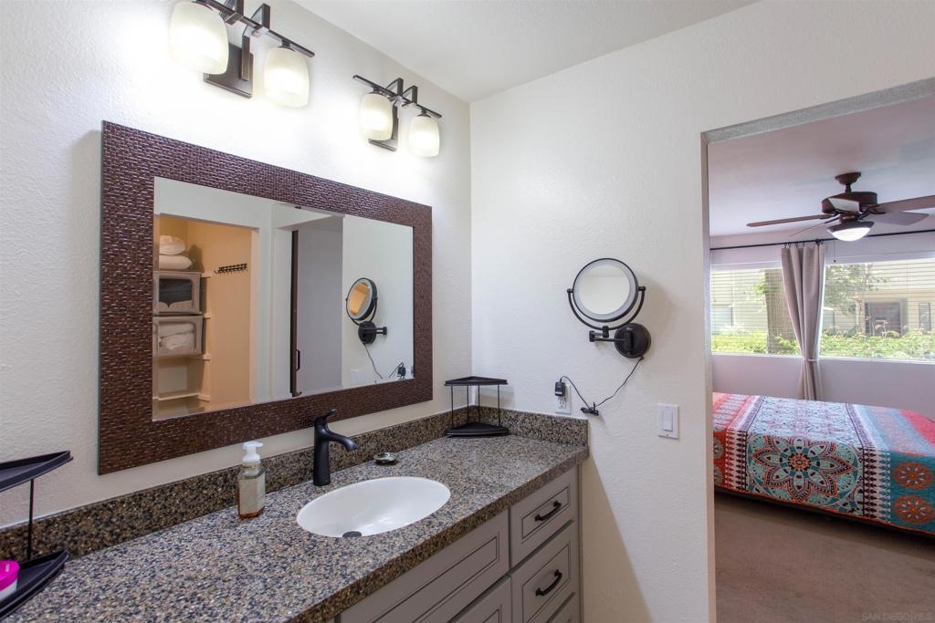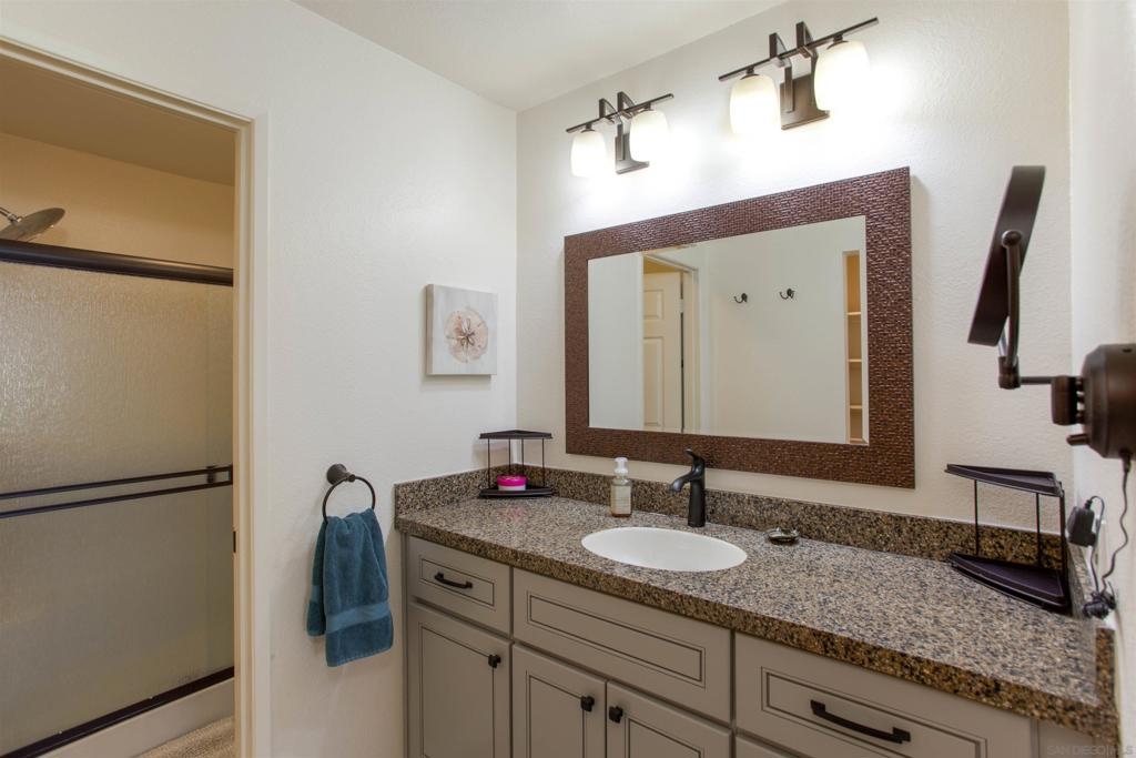 HUGE PRICE IMPROVEMENT!! Priced to Sell! This beautifully updated, “gently used” lower-level two-bedroom condo in the highly sought after Bernardo Pines community won't last long! Open and spacious layout, two bedrooms, two full baths with matching upgraded cabinetry and shower/tubs, plantation shutters in the dining area plus newer luxury vinyl flooring throughout living areas. The primary bedroom includes an en-suite bathroom and walk-in closet (w/built-ins), exceptional privacy surrounded by beautiful mature pine trees. The second bedroom includes multiple closets and direct access to the full guest bathroom. The kitchen features cultured granite countertops and natural bright wood cabinetry. Enjoy an afternoon on the private patio. This floor plan flows beautifully and practically with plenty of storage and full-size in-unit laundry. A wonderful home in a wonderful community. This property was primarily used as a second home. Bernardo Pines is known to be well-maintained, full of mature trees and lush greenery, where residents can enjoy two pools, a spa, a tennis court plus a fitness center. Conveniently located just minutes from freeway access, nearby Rancho Bernardo Inn Resort, a wide array of restaurants, all in the prestigious Poway Unified School District. HOA fees (includes water, trash, A/C unit maintenance plus common area maintenance), two parking spaces (one of which is covered), this home offers everything you need for convenient and comfortable living. Don’t miss out on calling this amazing property home!