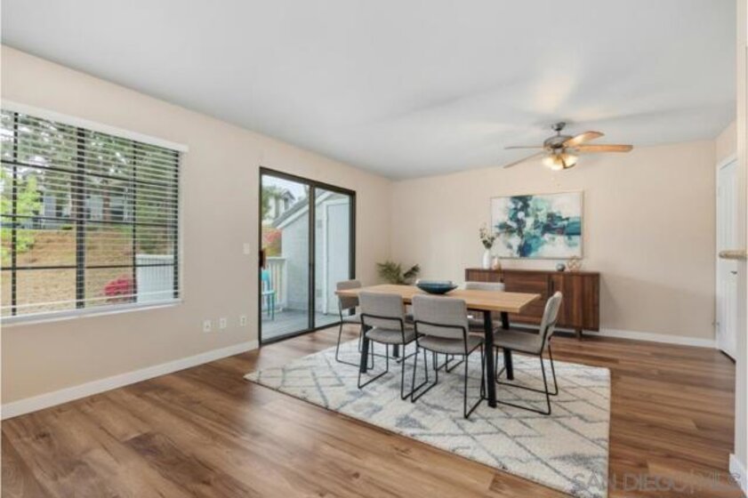Enjoy peace and privacy in this upper-level unit overlooking the greenbelt—balcony has no direct views of other units or streets. Located in the highly desirable Carmel Trails community, close to top schools, shopping, freeway access, and recreation. The interior has been thoughtfully updated, featuring stylish vinyl plank flooring throughout the main living areas. The kitchen boasts stainless steel appliances, including a recently replaced refrigerator. The spacious bedroom includes two full-length mirrored closets and a charming window seat. The bathroom offers a tub/shower combo with a sleek glass enclosure. Additional highlights include new window blinds, a ceiling fan in the dining area, full-sized in-unit washer and dryer, and ample storage space—including an exterior locking closet on the balcony. One assigned, covered parking spot and ample guest parking available. Complex Amenities include; 2 Pools, spa, fitness center, sauna, BBQ's, tennis & basketball courts, and clubhouse that can be used for private events. Poway Unified Schools - zoned for Highland Ranch Elementary, Bernardo Heights Middle School & Rancho Bernardo High School.