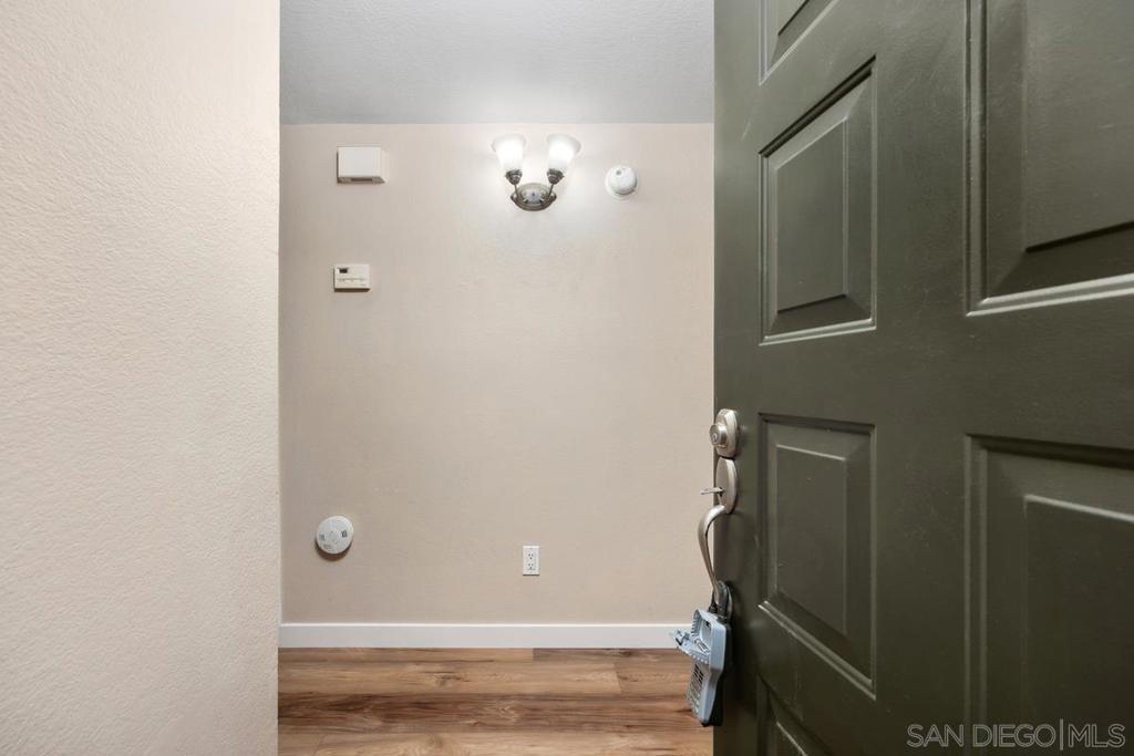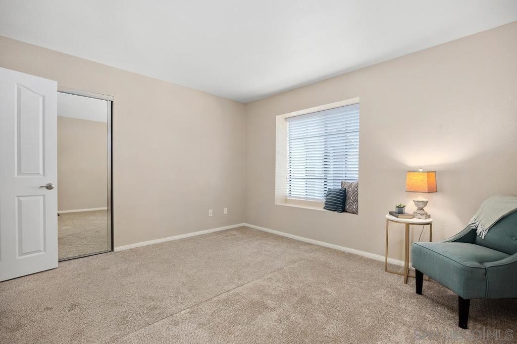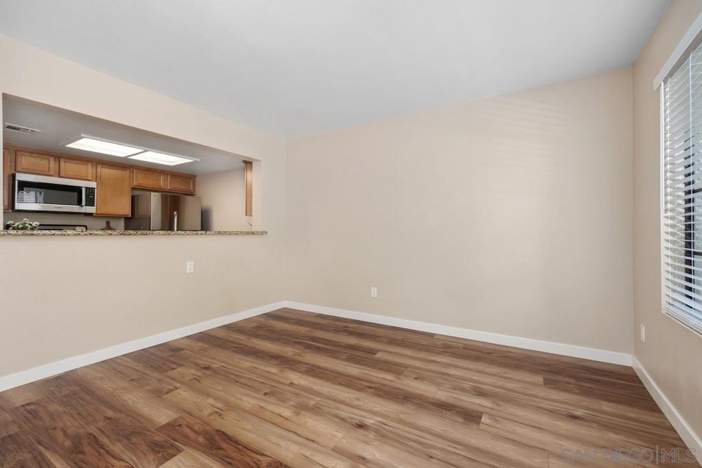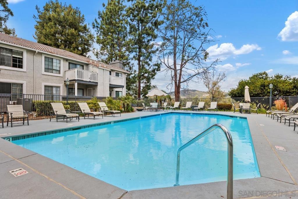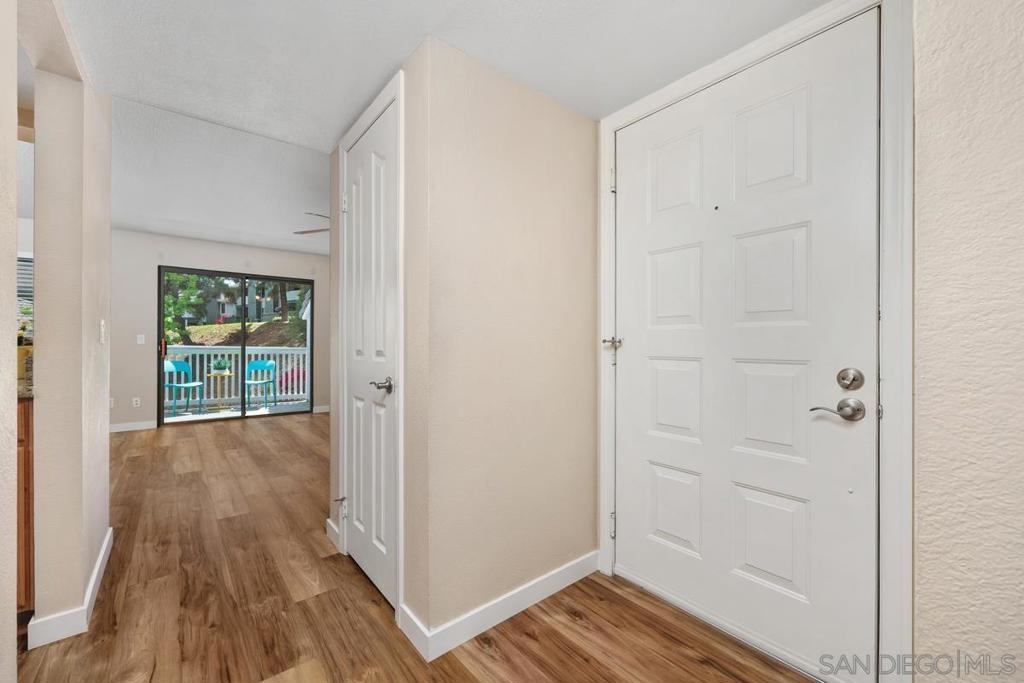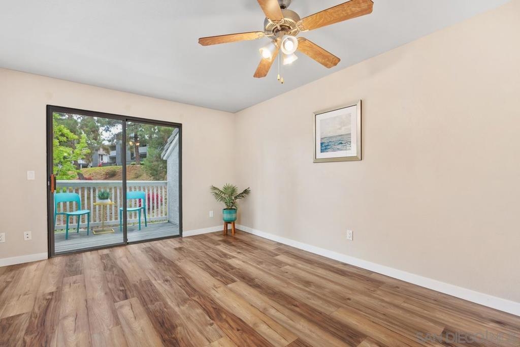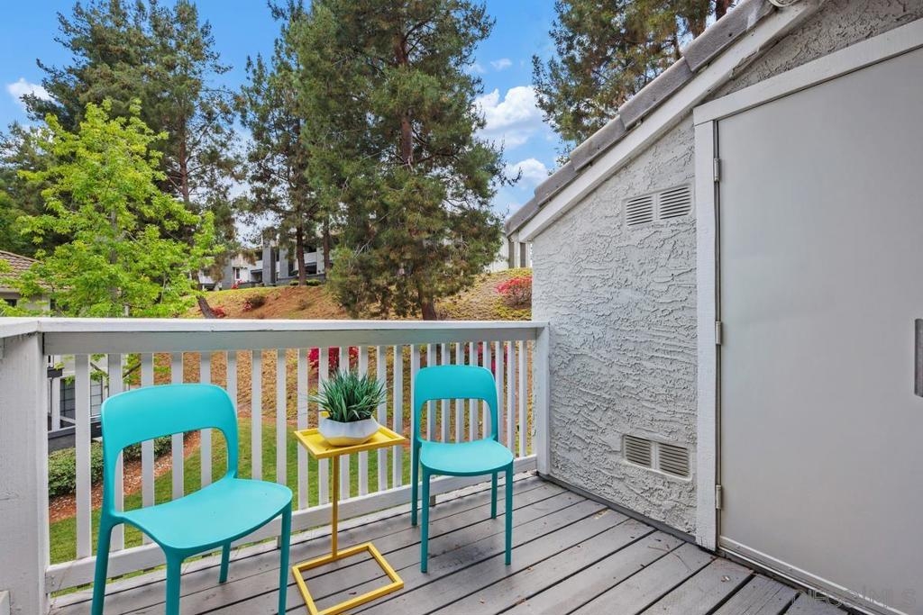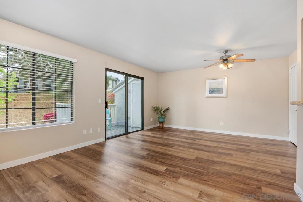 Enjoy peace and privacy in this upper-level unit overlooking the greenbelt—balcony has no direct views of other units or streets. Located in the highly desirable Carmel Trails community, close to top schools, shopping, freeway access, and recreation. The interior has been thoughtfully updated, featuring stylish vinyl plank flooring throughout the main living areas. The kitchen boasts stainless steel appliances, including a recently replaced refrigerator. The spacious bedroom includes two full-length mirrored closets and a charming window seat. The bathroom offers a tub/shower combo with a sleek glass enclosure. Additional highlights include new window blinds, a ceiling fan in the dining area, full-sized in-unit washer and dryer, and ample storage space—including an exterior locking closet on the balcony. One assigned, covered parking spot and ample guest parking available. Complex Amenities include; 2 Pools, spa, fitness center, sauna, BBQ's, tennis & basketball courts, and clubhouse that can be used for private events. Poway Unified Schools - zoned for Highland Ranch Elementary, Bernardo Heights Middle School & Rancho Bernardo High School.