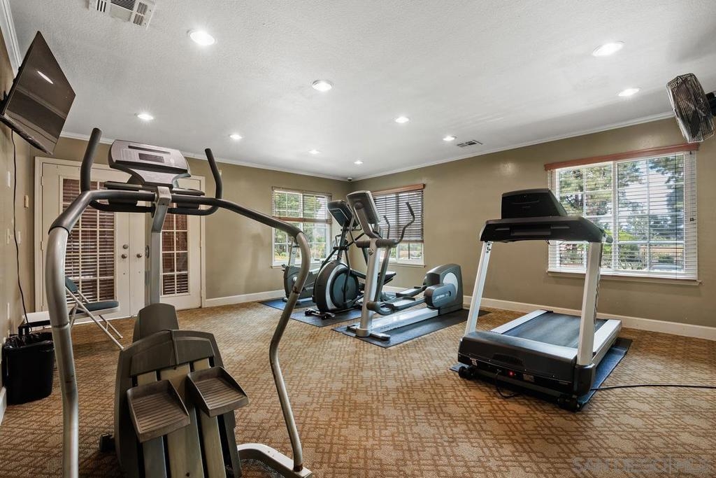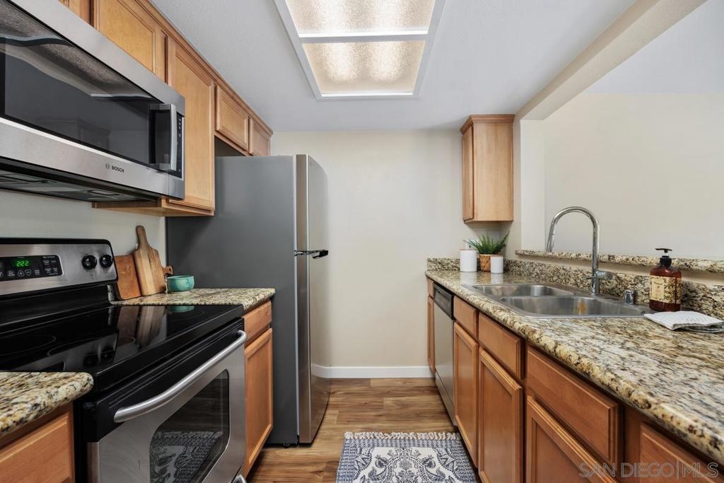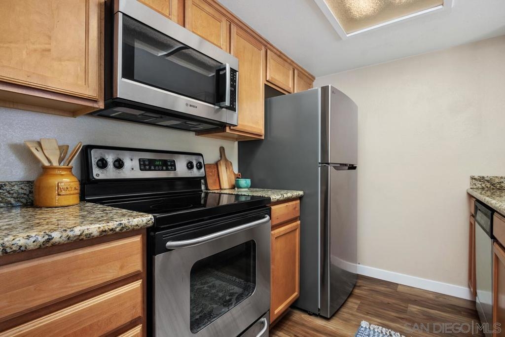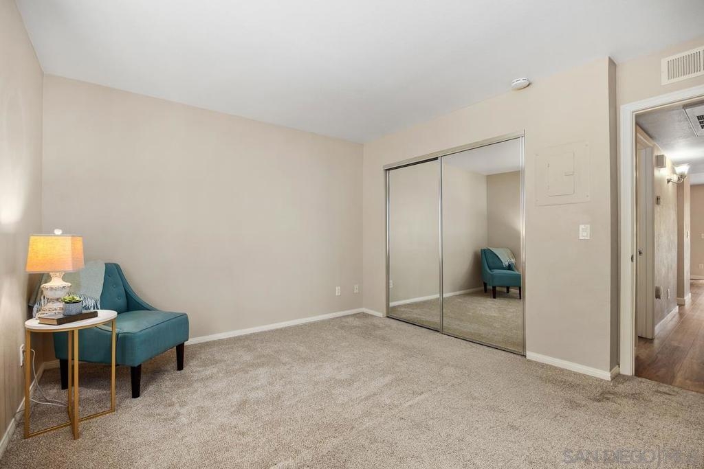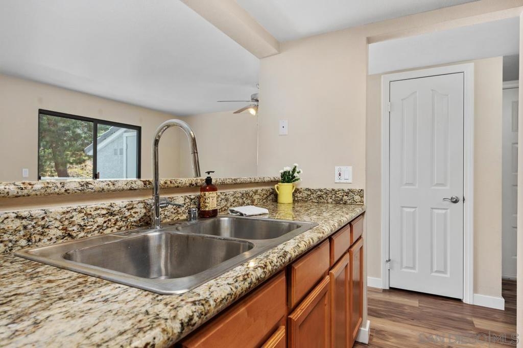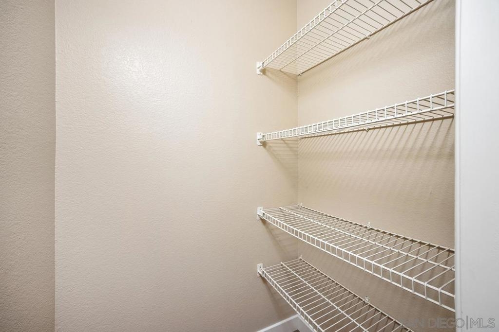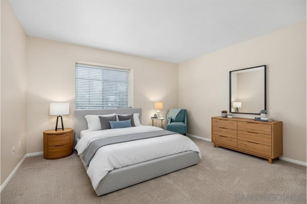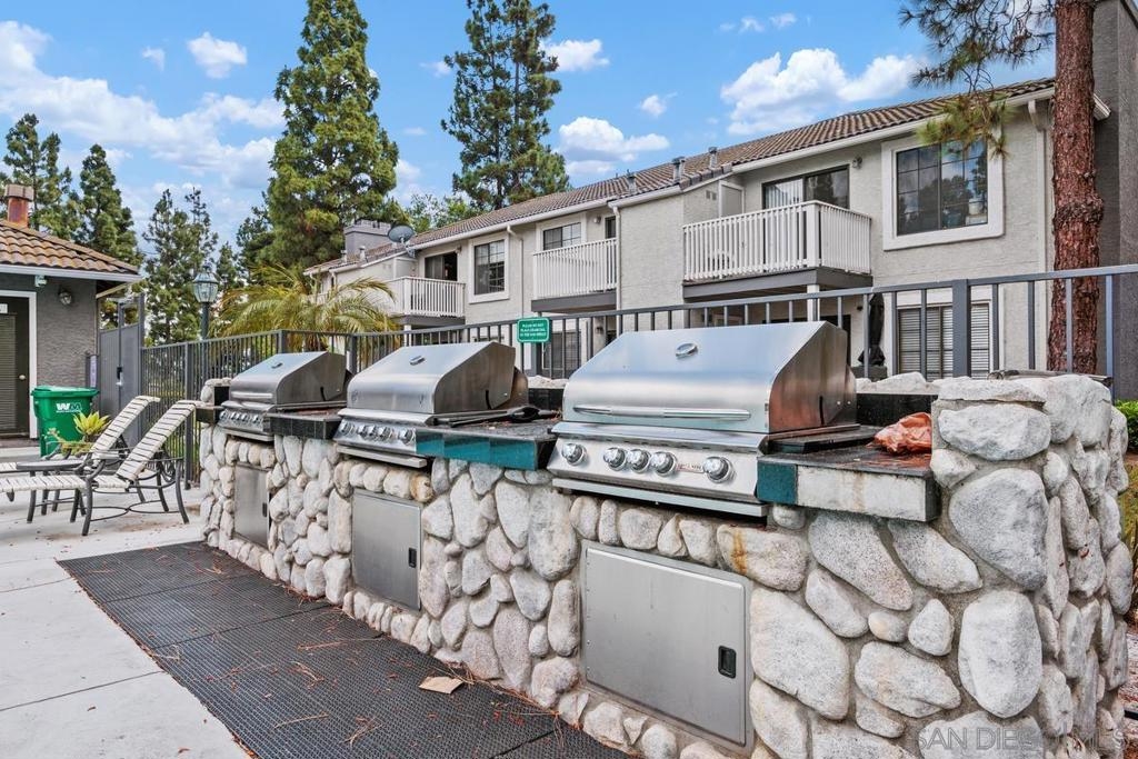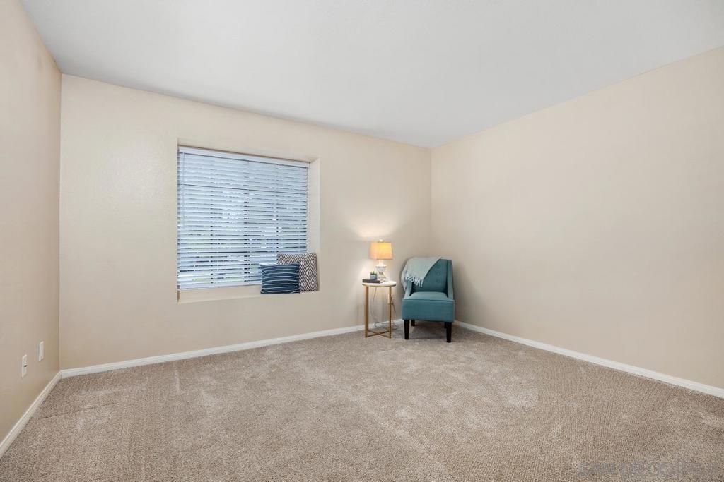 Enjoy peace and privacy in this upper-level unit overlooking the greenbelt—balcony has no direct views of other units or streets. Located in the highly desirable Carmel Trails community, close to top schools, shopping, freeway access, and recreation. The interior has been thoughtfully updated, featuring stylish vinyl plank flooring throughout the main living areas. The kitchen boasts stainless steel appliances, including a recently replaced refrigerator. The spacious bedroom includes two full-length mirrored closets and a charming window seat. The bathroom offers a tub/shower combo with a sleek glass enclosure. Additional highlights include new window blinds, a ceiling fan in the dining area, full-sized in-unit washer and dryer, and ample storage space—including an exterior locking closet on the balcony. One assigned, covered parking spot and ample guest parking available. Complex Amenities include; 2 Pools, spa, fitness center, sauna, BBQ's, tennis & basketball courts, and clubhouse that can be used for private events. Poway Unified Schools - zoned for Highland Ranch Elementary, Bernardo Heights Middle School & Rancho Bernardo High School.