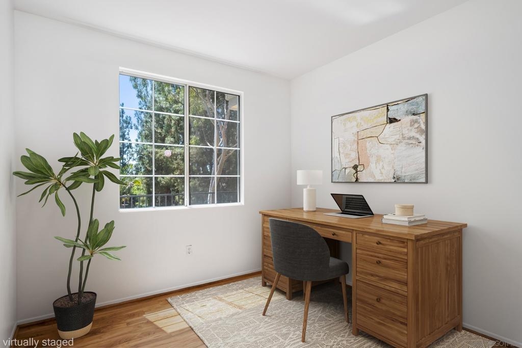Experience the ultimate privacy with stunning, secluded views. This elegant 2-bed, 2-bath condo, offers 1,076 sq. ft. of thoughtfully designed space —all on one level. Step inside to polished hardwood floors that enhance the open-concept living and dining areas, seamlessly blending functionality with comfort. Filled with natural light, this area becomes an inviting space perfect for both relaxation and entertaining. The upgraded kitchen features granite countertops, stainless steel appliances, and ample cabinetry. See Supplement for more info. The primary bedroom offers the En Suite bathroom, a walk-in closet with built-in cabinetry, and direct access to a large private balcony. A separate laundry area has built-in cabinetry and an extra coat closet for space and convenience. The attached one-car garage provides direct access, while the community amenities—including two pools, a spa, a playground, and a BBQ area—offer a true resort-like experience. Walking distance from shopping, dining, and entertainment, this exceptional condo is located in the award-winning Poway Unified School District and less than 20 minutes from Del Mar Beach. Experience comfortable living in this elegant 2-bedroom, 2-bathroom condo, offering 1,076 sq. ft. of thoughtfully designed space —all on one level. Step inside to polished hardwood floors that enhance the open-concept living and dining areas, seamlessly blending functionality with comfort. Filled with natural light, this area becomes an inviting space perfect for both relaxation and entertaining. The upgraded kitchen features granite countertops, stainless steel appliances, and ample cabinetry. The primary bedroom offers the En Suite bathroom, a walk-in closet with built-in cabinetry, and direct access to a large private balcony. A separate laundry area has built-in cabinetry and an extra coat closet for space and convenience. The attached one-car garage provides direct access, while the community amenities—including two pools, a spa, a playground, and a BBQ area—offer a true resort-like experience. Walking distance from shopping, dining, and entertainment, this exceptional condo is located in the award-winning Poway Unified School District and less than 20 minutes from Del Mar Beach. Don’t miss this incredible opportunity!
