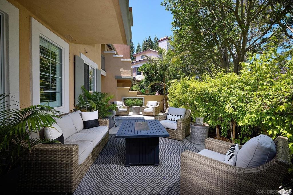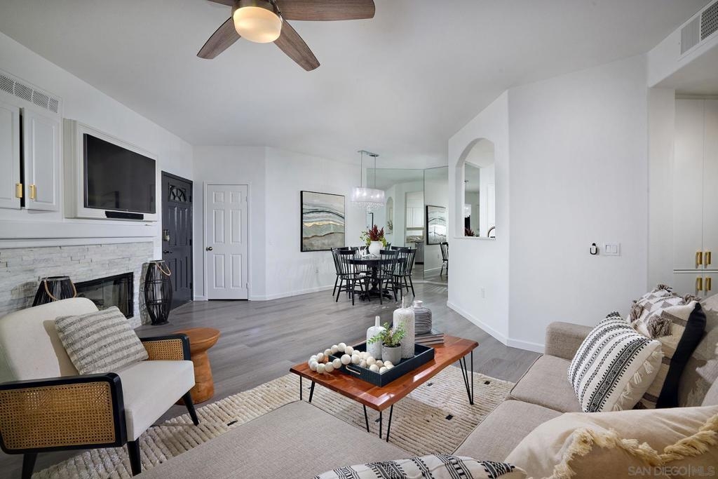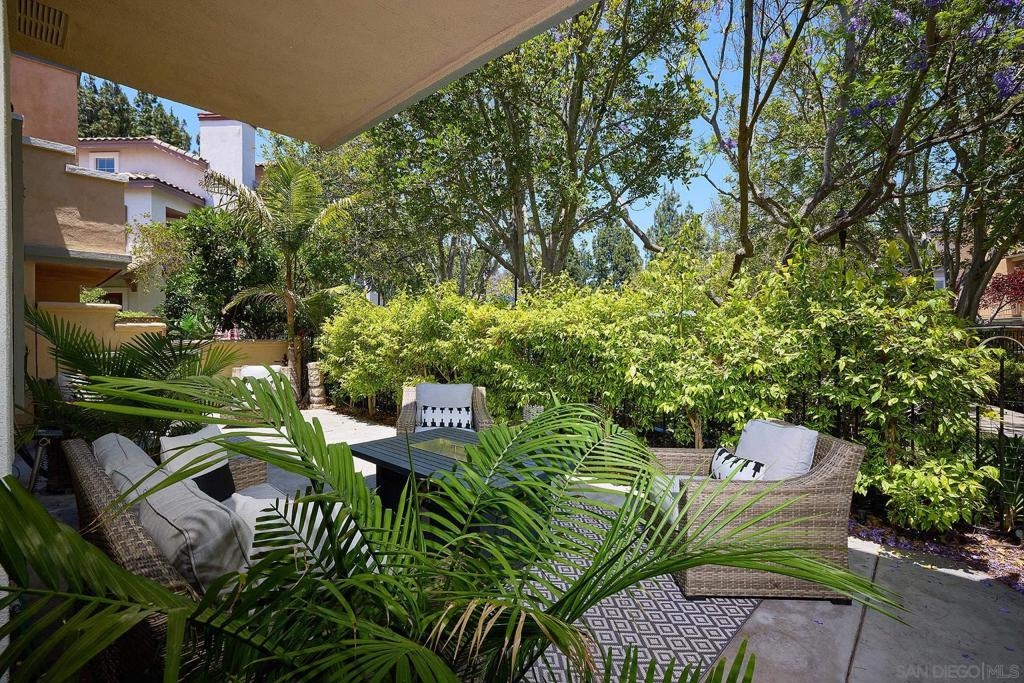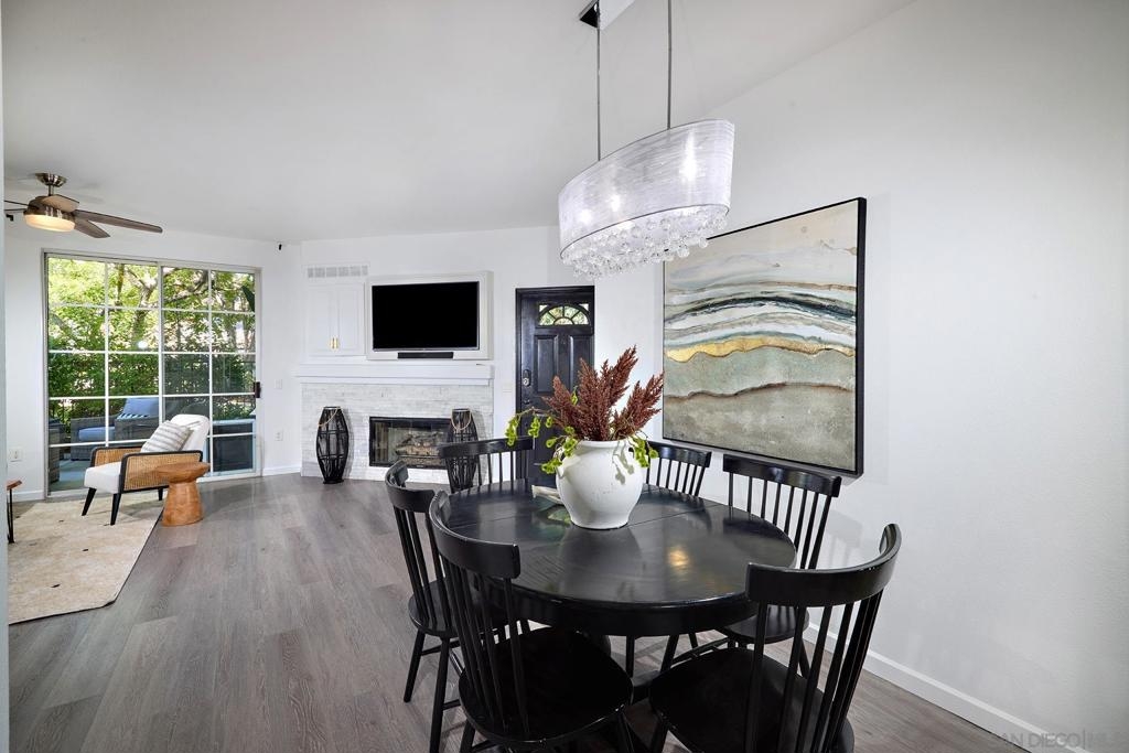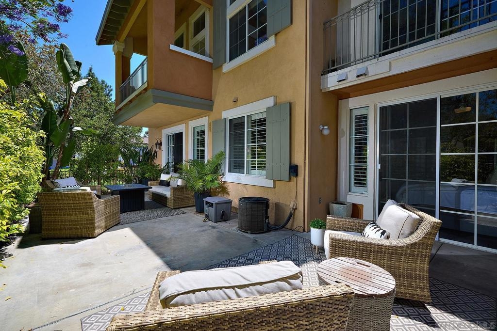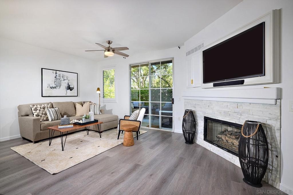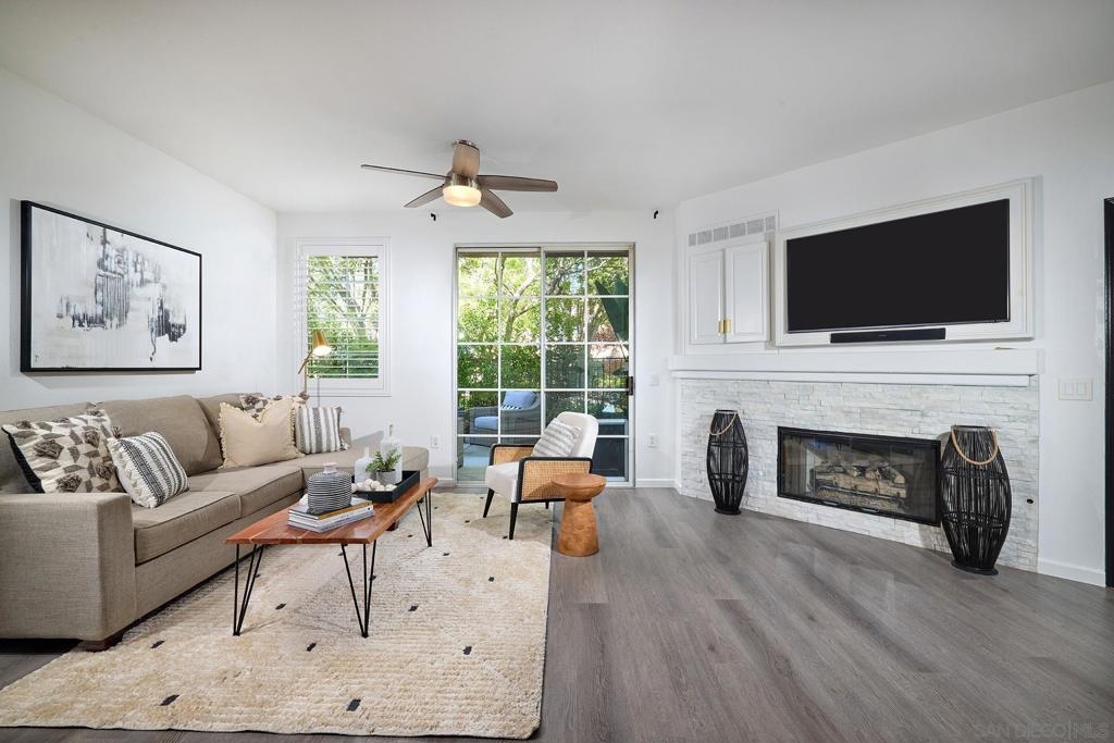 A new look! Freshly painted interior! Move-in ready! Stylish and chic 2 bed, 2 bath gem in Collage of Carmel Mountain Ranch. Step into 1076 sq ft of comfort featuring newer luxury vinyl plank flooring and updated baths. Living room boasts a fireplace with stacked stone facade and slider to private outdoor patio. Need to beat the heat? No problem with central air conditioning! Private 1-car garage and interior, full-size laundry. But the real showstopper? An expansive, private patio area for gathering or relaxing! Poway Unified Schools. The outdoor space is perfect for al fresco dining or your morning coffee. Enjoy the convenience of indoor laundry. And when it's time to unwind, take a dip in the community pool. This home is a rare find – stylish, functional and just waiting for you to make it yours. See floor plan in documents section below photos.