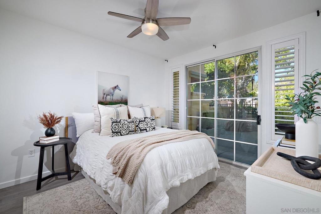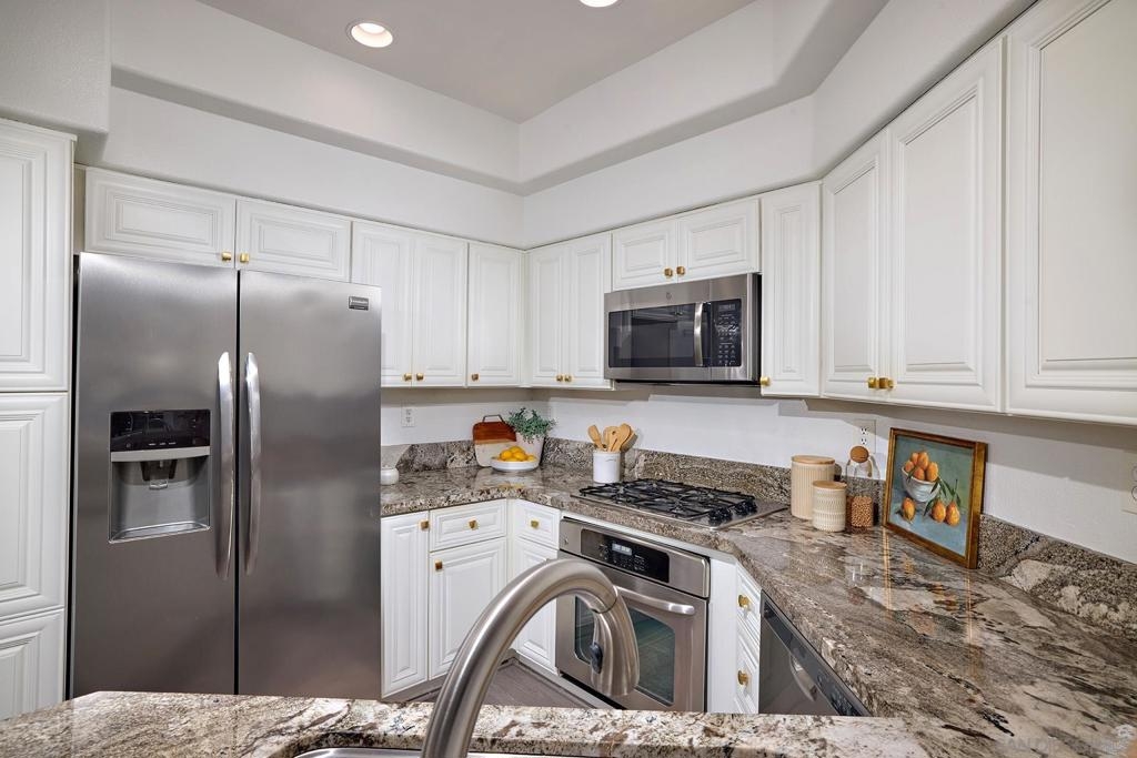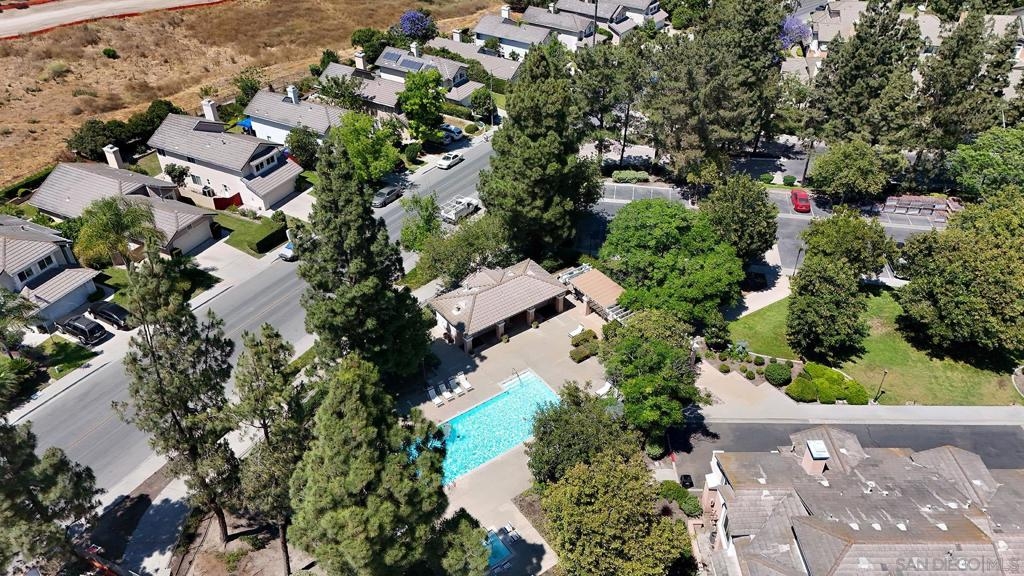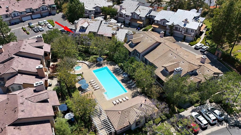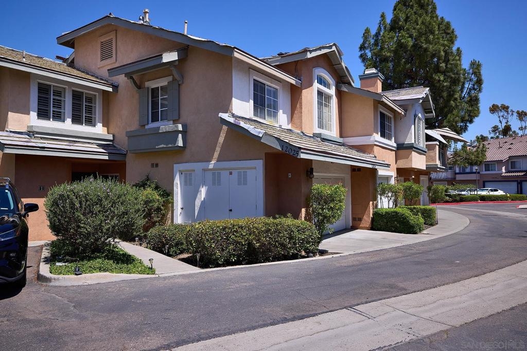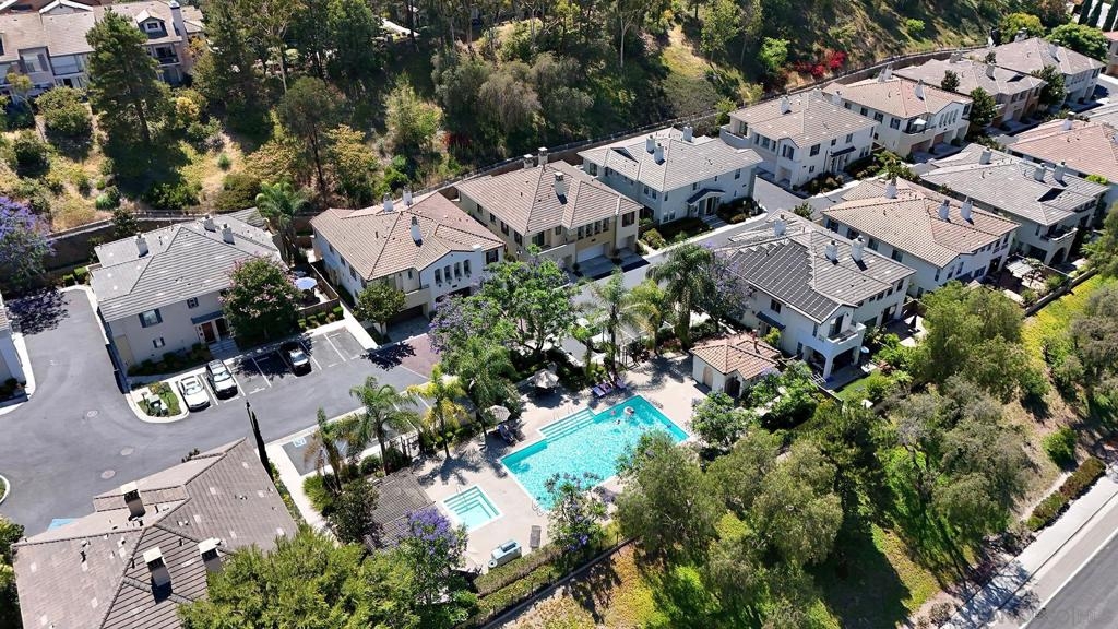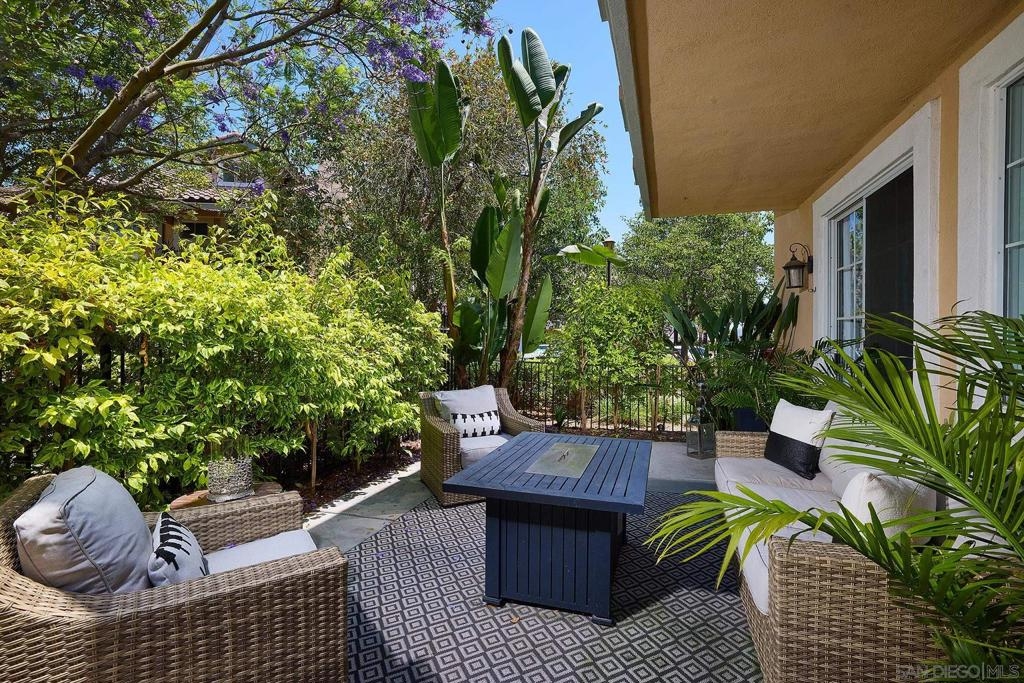 A new look! Freshly painted interior! Move-in ready! Stylish and chic 2 bed, 2 bath gem in Collage of Carmel Mountain Ranch. Step into 1076 sq ft of comfort featuring newer luxury vinyl plank flooring and updated baths. Living room boasts a fireplace with stacked stone facade and slider to private outdoor patio. Need to beat the heat? No problem with central air conditioning! Private 1-car garage and interior, full-size laundry. But the real showstopper? An expansive, private patio area for gathering or relaxing! Poway Unified Schools. The outdoor space is perfect for al fresco dining or your morning coffee. Enjoy the convenience of indoor laundry. And when it's time to unwind, take a dip in the community pool. This home is a rare find – stylish, functional and just waiting for you to make it yours. See floor plan in documents section below photos.