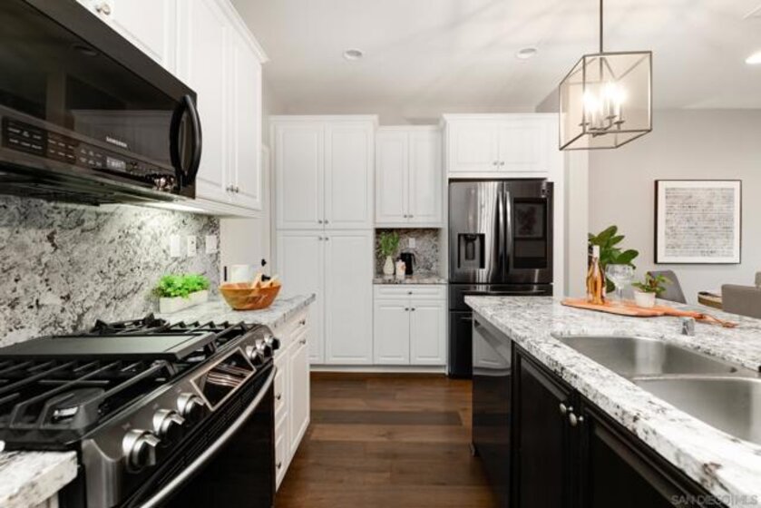 Experience the Del Sur lifestyle in this tastefully updated 3-bedroom, 2.5-bath townhome in the highly desirable Del Sur San Diego community, featuring bright open-concept living, wide-plank wood flooring, a designer kitchen with Samsung stainless appliances, and a private gated patio perfect for enjoying San Diego evenings. Bright, modern, and move-in ready, this home offers stylish finishes and comfortable living in one of North County San Diego’s most sought-after neighborhoods. Enter through the private gated front patio into a spacious living area designed for both everyday living and entertaining. The living space is highlighted by an architectural arched window that creates a warm and inviting atmosphere. The kitchen showcases white cabinetry, granite countertops, upgraded Samsung appliances, designer pendant lighting, and a large center island with bar seating, flowing seamlessly into the dining and living areas. Recent updates include fresh interior paint, newer Samsung appliances, and updated bathroom lighting, giving the home a clean, contemporary feel throughout. Additional features include plantation shutters throughout, enhancing both style and privacy, along with a dedicated Tesla charger in the garage. Upstairs you'll find a versatile loft workspace, ideal for a home office, study area, or reading nook. The primary suite retreat features a beautifully organized walk-in closet with built-ins and an upgraded spacious ensuite bathroom with dual vanities and a walk-in shower. Living in the Del Sur master-planned community means enjoying one of North County San Diego’s most beloved neighborhoods, featuring 14 parks, 11 solar-heated pools, miles of hiking and biking trails, dog parks, and year-round community events. Residents also enjoy being walkable to neighborhood shops, restaurants, coffee spots, and community parks. Located within the award-winning Poway Unified School District, including Del Sur Elementary (National Blue Ribbon School) and Del Norte High School.