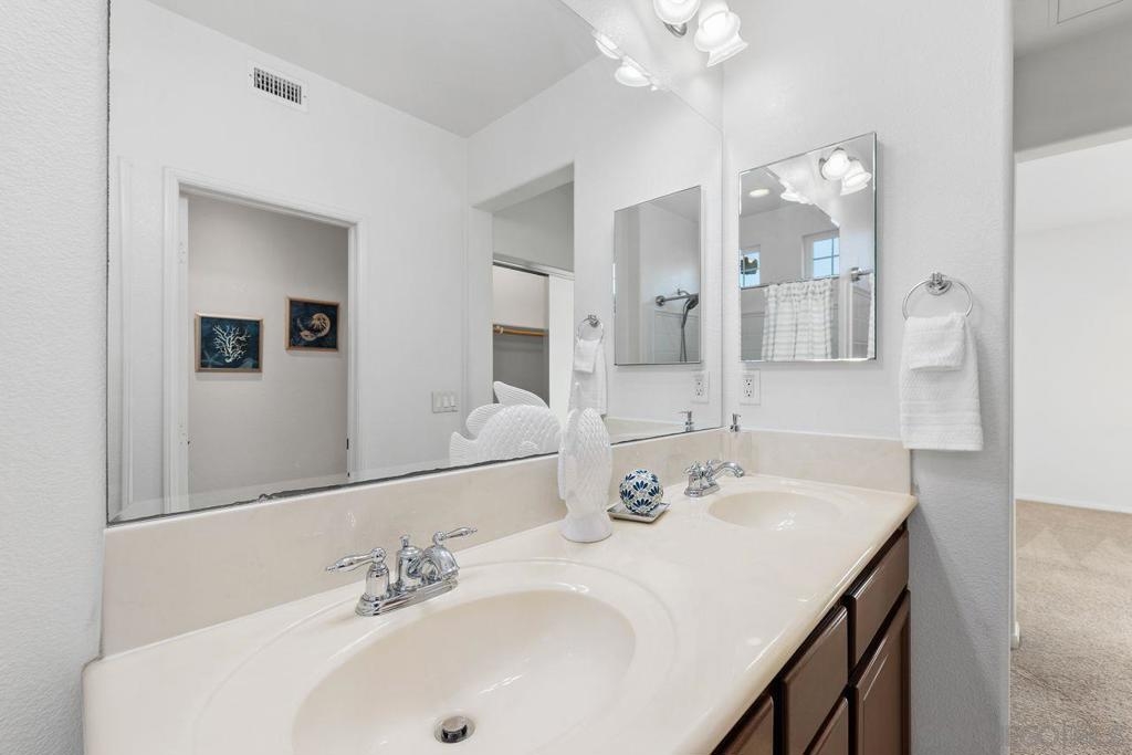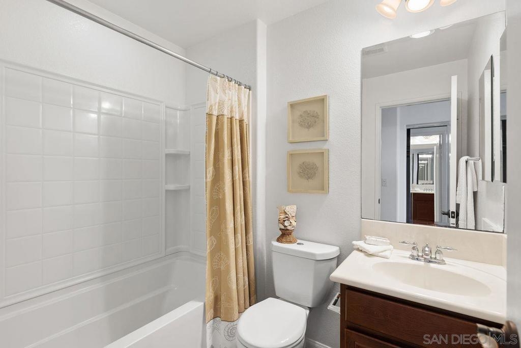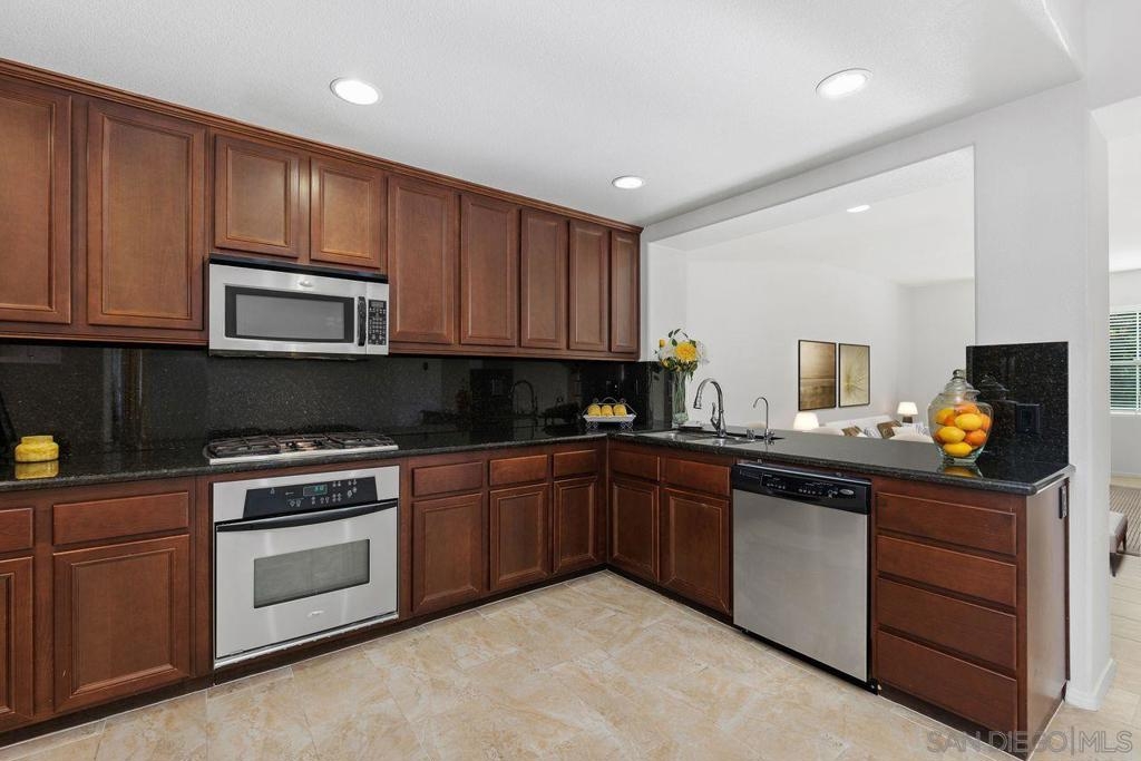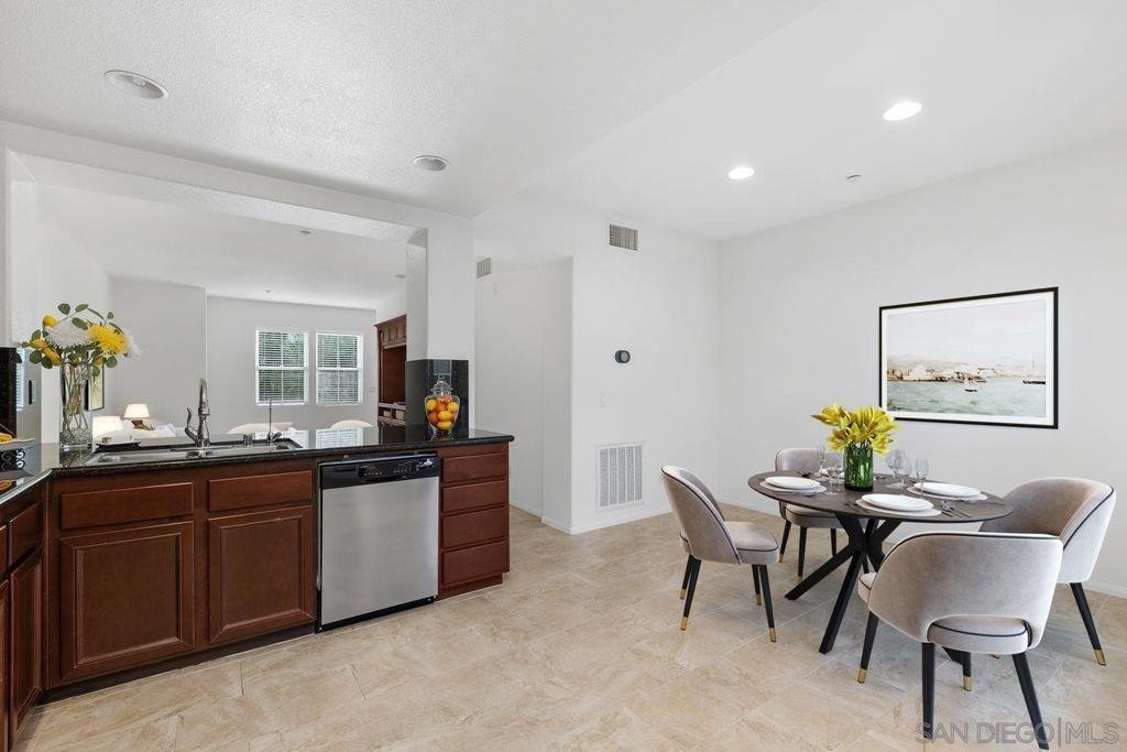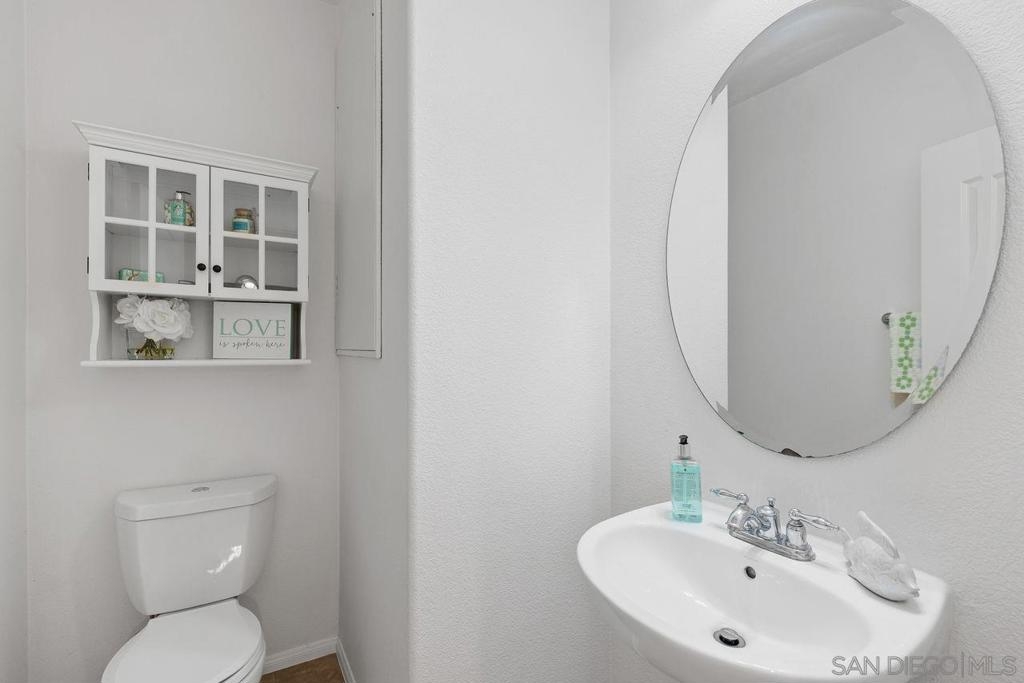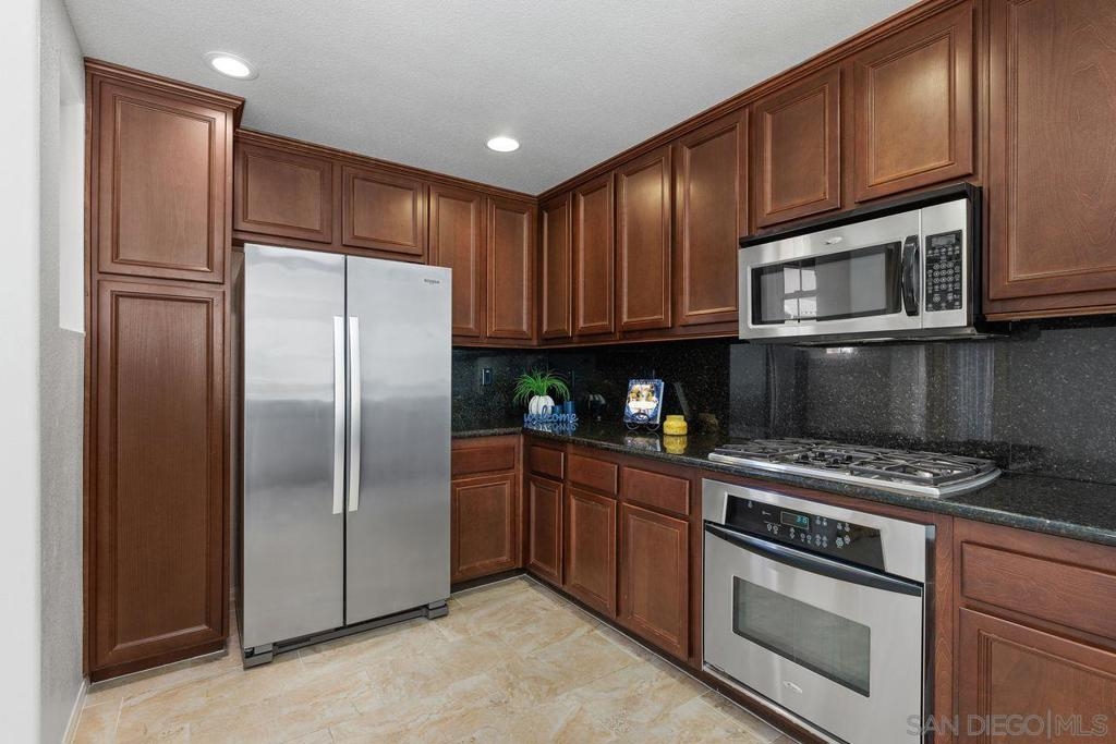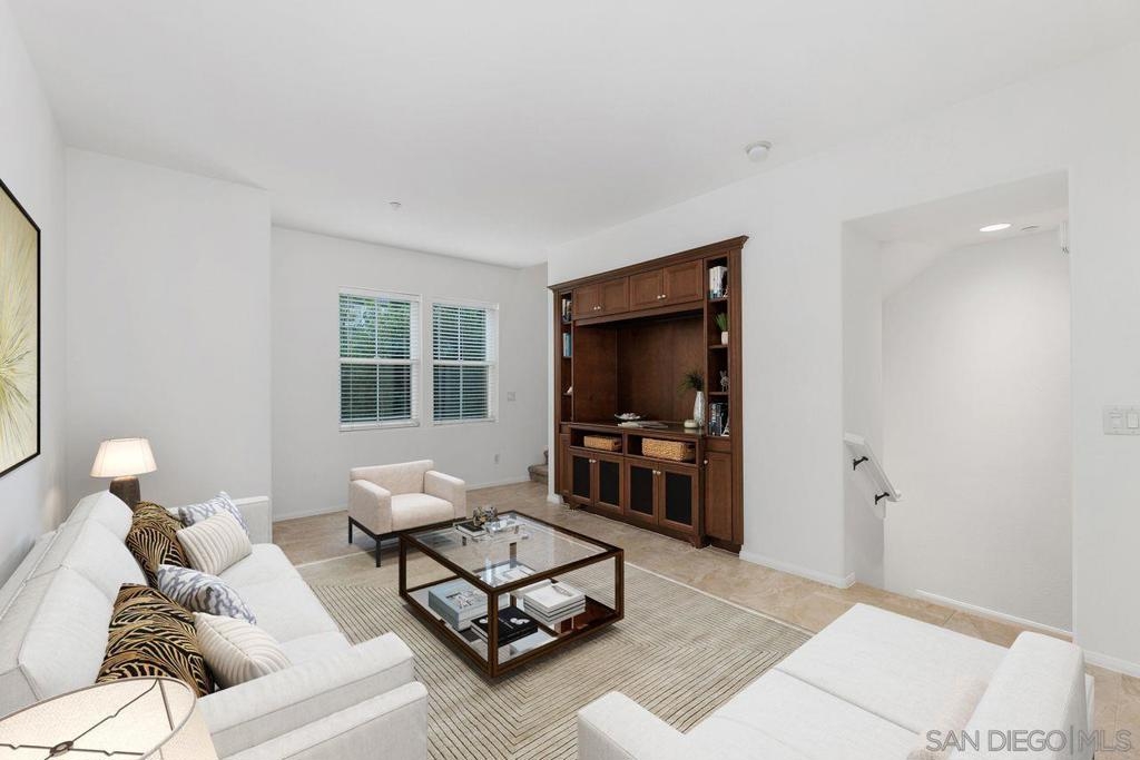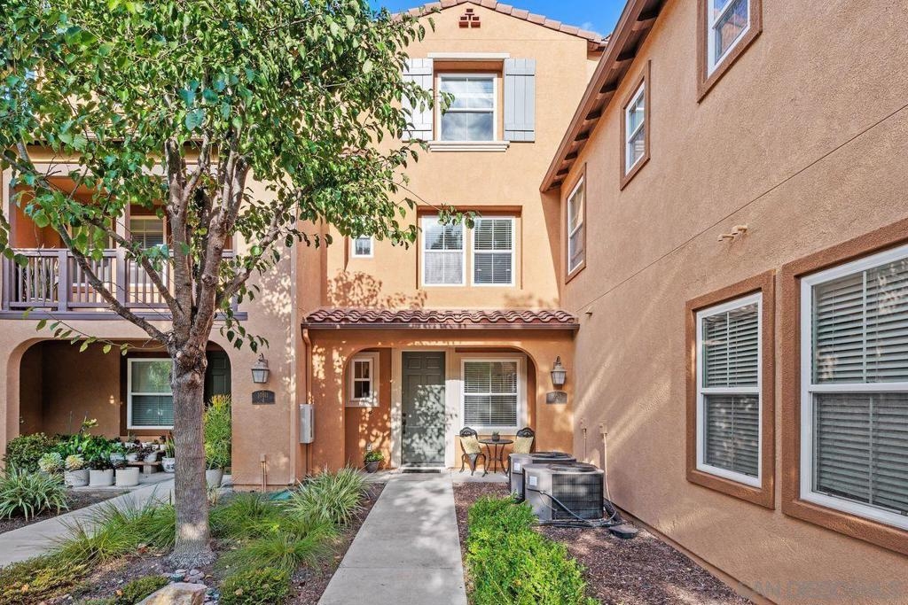 Welcome to this thoughtfully designed and centrally located gem in Gianni at 4S Ranch. Nestled behind a peaceful greenbelt, this 3-story townhome combines convenience and privacy. The entry-level features a bedroom with ensuite bath, a laundry room with built-in cabinetry, and direct access to the 2-car attached garage. Heading up the stairs, past the powder room, you will find the bright and inviting family living spaces. The integrated kitchen and dining area with a private balcony offers a seamless space for entertaining family and guest. The kitchen is a chef’s delight with rich dark wood cabinets, black granite countertops, stainless steel appliances, and durable tiled flooring. The adjacent family room provides a generous gathering area centered around a built-in media niche. On the third level, you’ll find two spacious bedrooms with en-suite bathrooms. The bathrooms showcase sleek tile flooring, chrome fixtures, white countertops, and dark wood cabinetry for a timeless look. Additional features include HVAC, fire sprinklers, and a reverse osmosis water filtration system under the kitchen sink. Gianni at 4S Ranch is a highly sought-after community, centrally located near parks, shopping, dining, hiking, and biking trails. Residents enjoy a host of HOA amenities, including a community pool, spa, BBQ area, and ample open spaces. Located within the award-winning Poway Unified school district, don’t miss this opportunity to call Gianni your home.