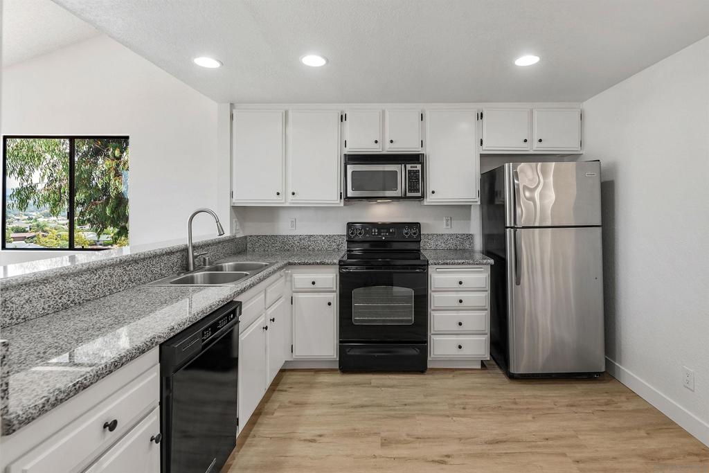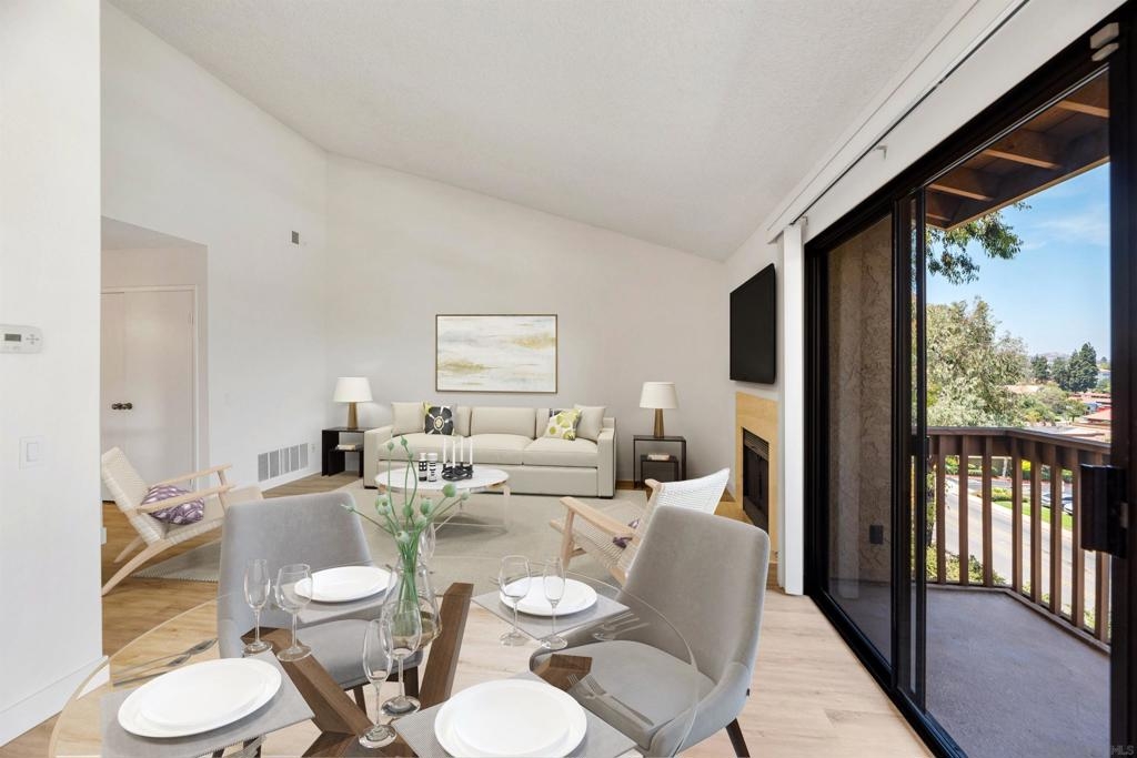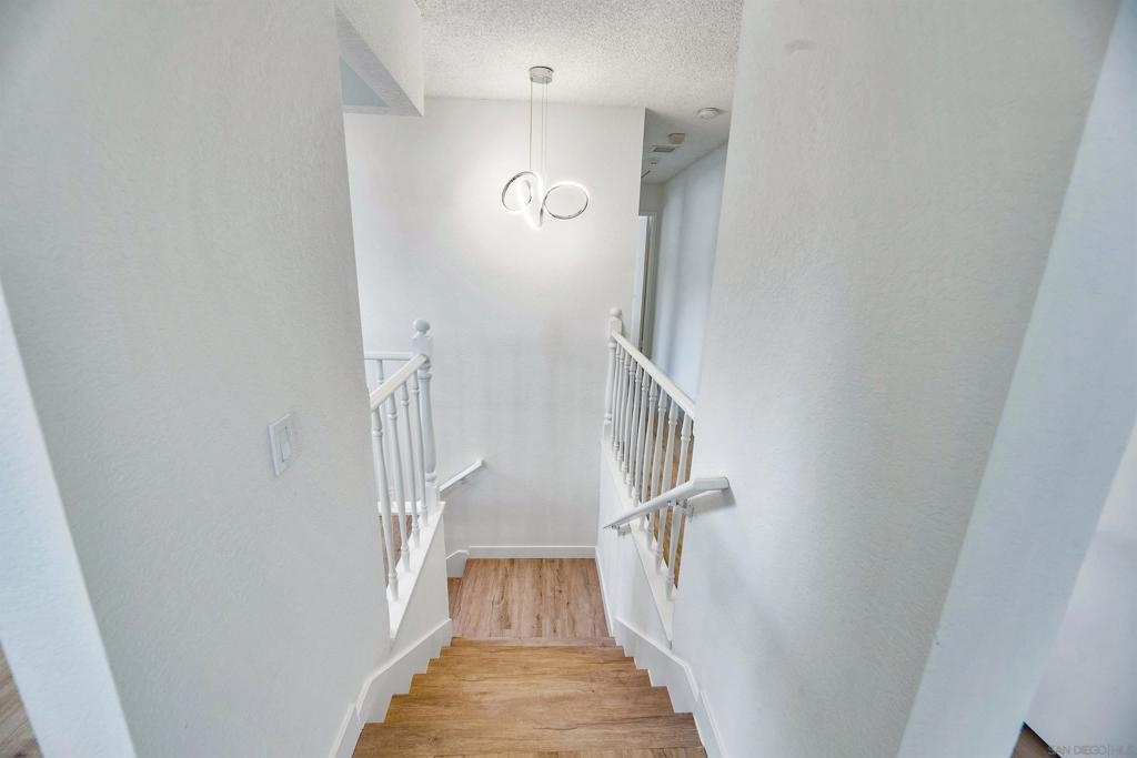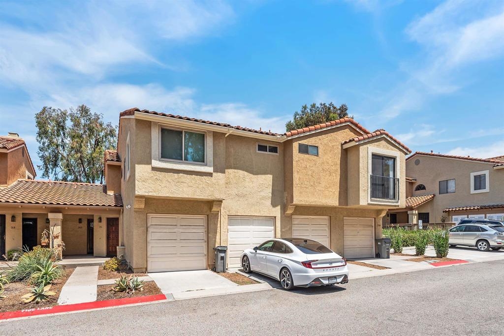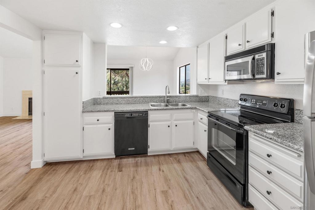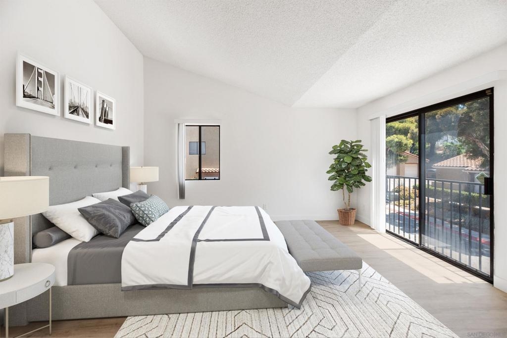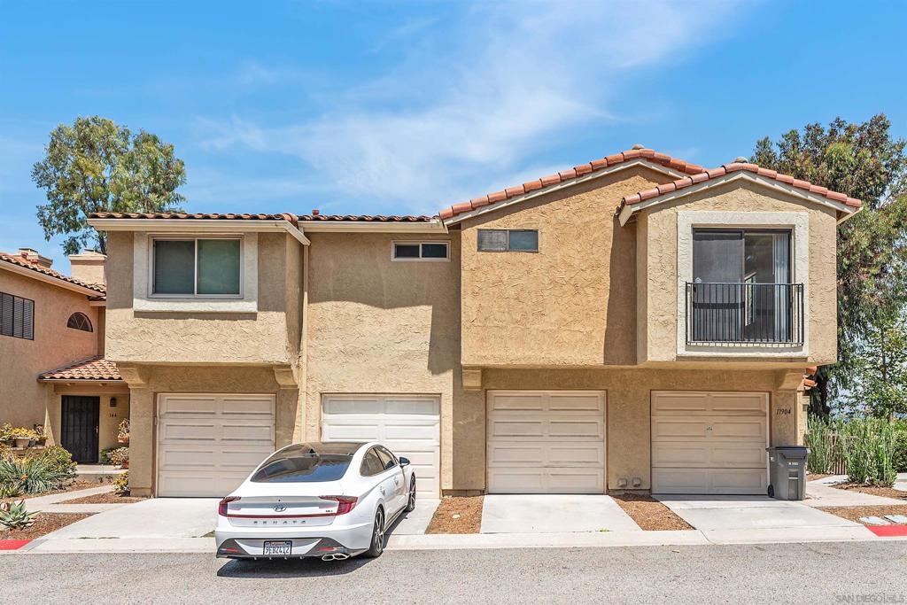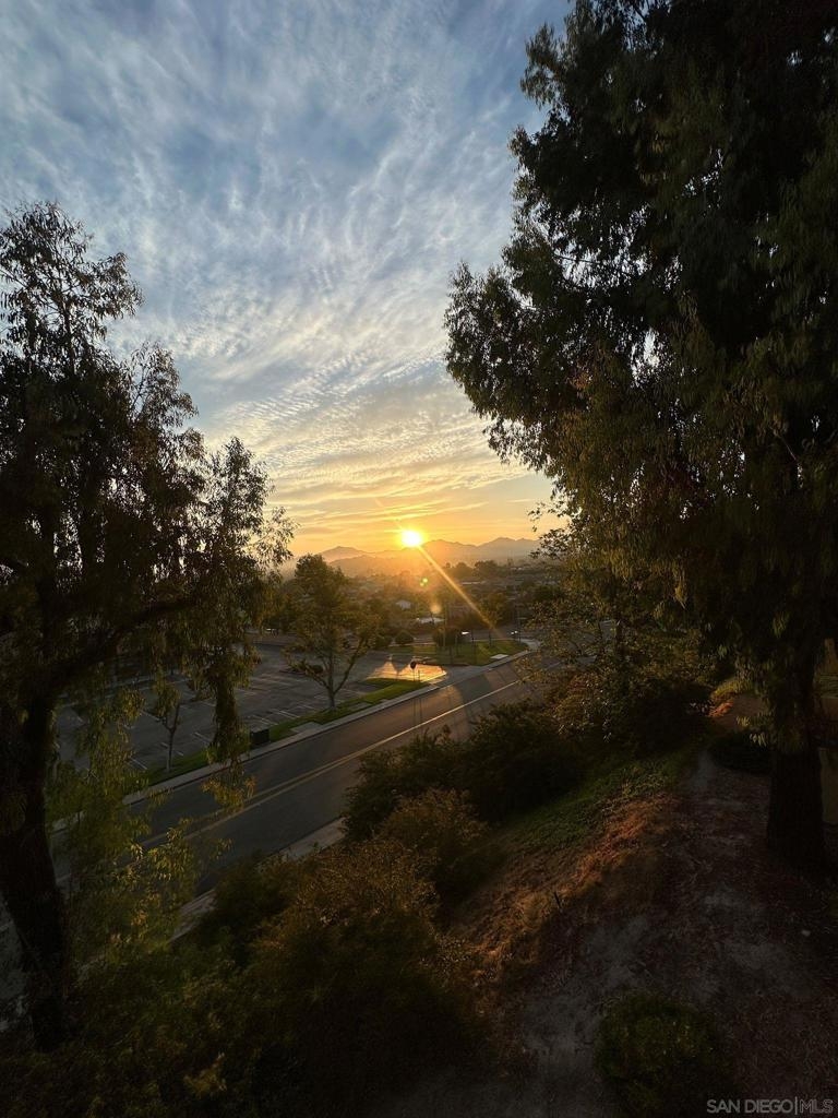 Rarely Available! Have your morning tea, with the breathtaking sunrise over Poway with panoramic mountain and city views from your living room and outside deck. Lots of natural light streams through all windows of this home. Vaulted ceilings in the living room and master bedroom give this home an expanded and large feeling. Freshly painted with new greyish/beige luxury vynyl plank flooring added throughout. Granite countertops and black front appliances, with all new hardware and knobs added will make your kitchen enjoyable to try new recipes in. Enter your home from your bottom floor or your one car garage, with a washer and dryer and dual overhead hanging storage system. The top floor is your sanctuary, where you may relax and entertain in a spacious large living and dining room area and soak in panoramic views from your private deck. The new exquisite hanging avant-garde lighting in the hallway and dining area is sure to be enjoyed by you and your friends and family and spark conversations. At the end of the hall is where you will relax in this large but cozy vaulted ceiling master suite, that boasts of a separate bath and shower area with a matching double sink surrounded by granite. No water bill. High walkability score for this area, shopping right across the street along Bernardo Center drive. This community contains a pool tennis courts, and hot tub. Use all the facilities of the Bernardo Heights Community Center, Olympic sized pool, tennis courts, fitness facilities & private Lucido Park. Award winning schools a short distance away, and a 3-minute drive to 1-15. Second parking spot allowed in front of garage and 2 parking permits for spaces outside. Don't miss out on this rare chance to call this condominium your new home! This Is An All Ages Community Not 55+