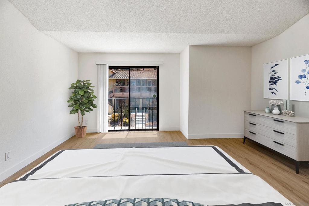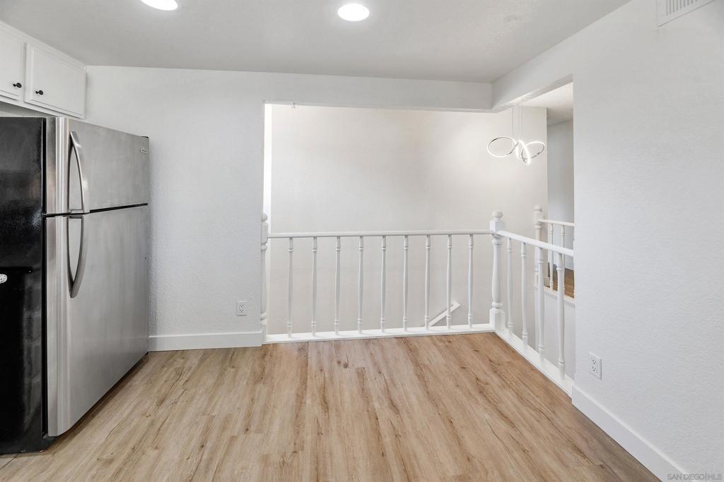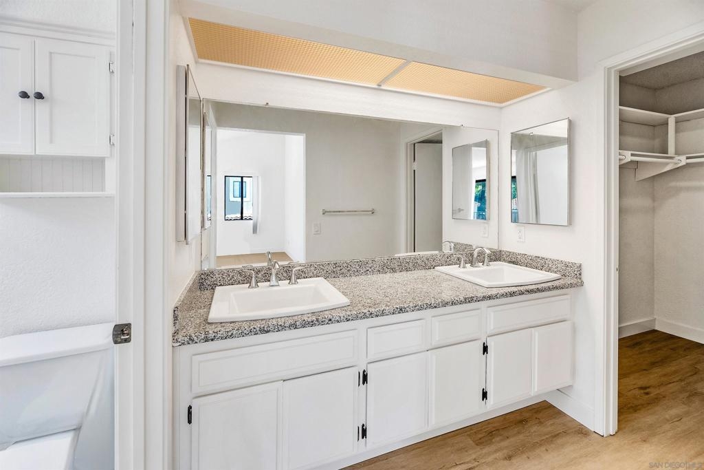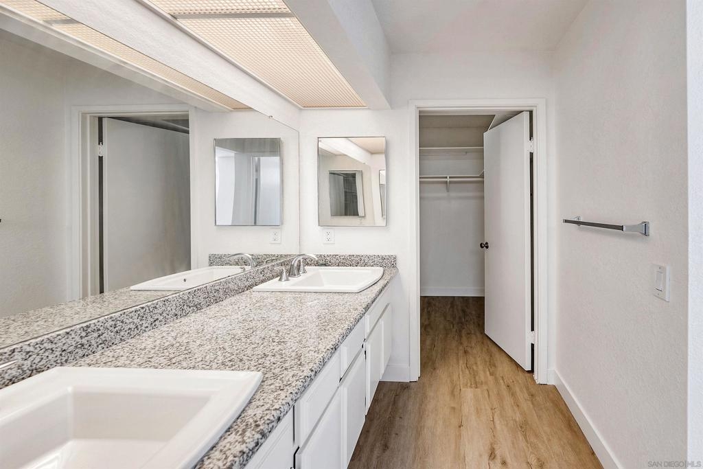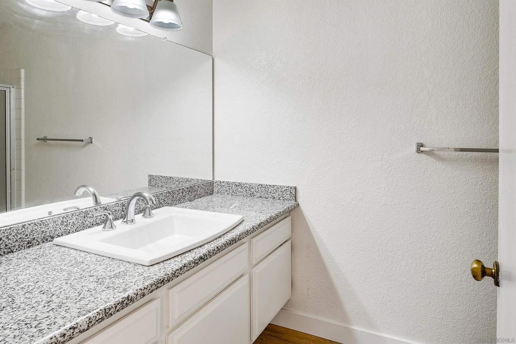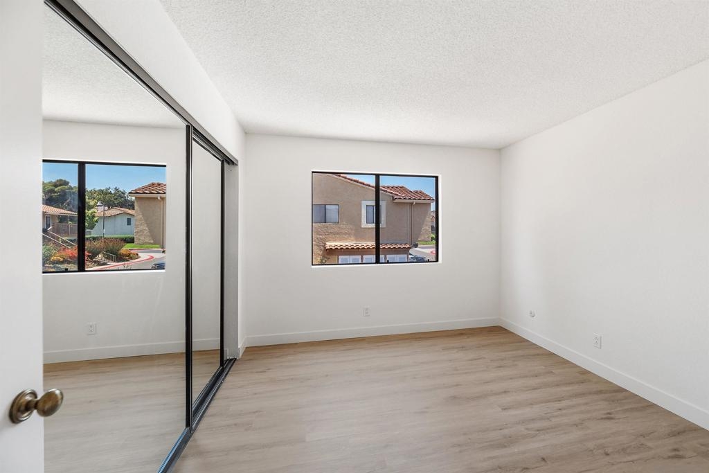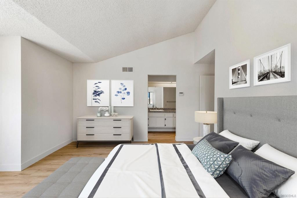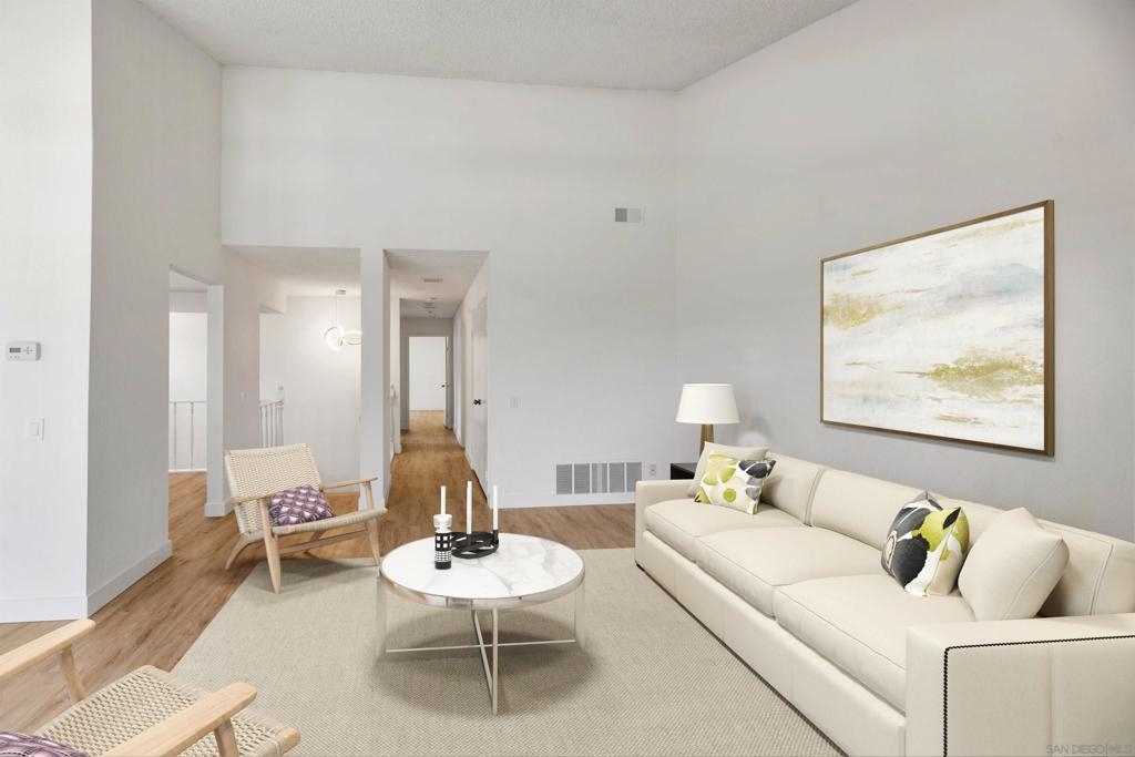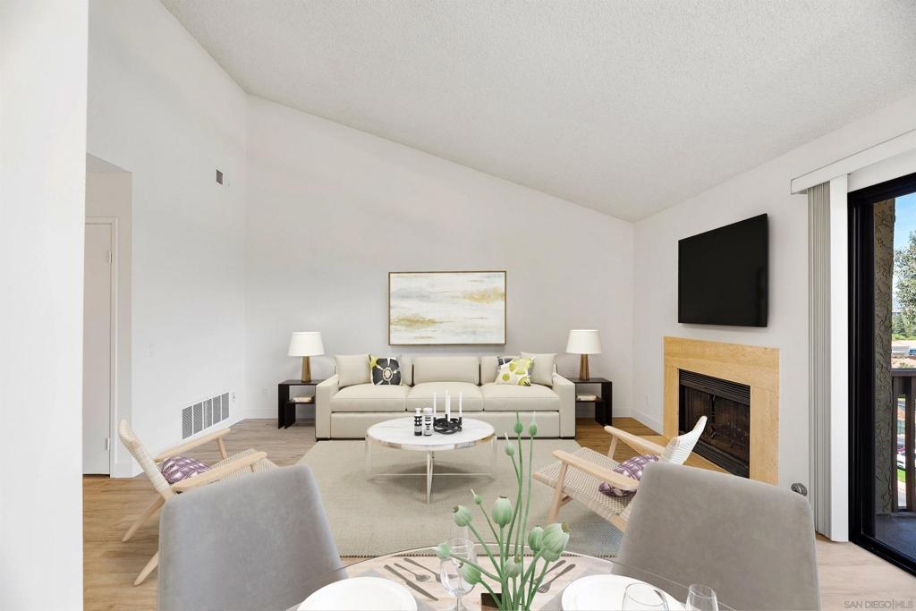 Rarely Available! Have your morning tea, with the breathtaking sunrise over Poway with panoramic mountain and city views from your living room and outside deck. Lots of natural light streams through all windows of this home. Vaulted ceilings in the living room and master bedroom give this home an expanded and large feeling. Freshly painted with new greyish/beige luxury vynyl plank flooring added throughout. Granite countertops and black front appliances, with all new hardware and knobs added will make your kitchen enjoyable to try new recipes in. Enter your home from your bottom floor or your one car garage, with a washer and dryer and dual overhead hanging storage system. The top floor is your sanctuary, where you may relax and entertain in a spacious large living and dining room area and soak in panoramic views from your private deck. The new exquisite hanging avant-garde lighting in the hallway and dining area is sure to be enjoyed by you and your friends and family and spark conversations. At the end of the hall is where you will relax in this large but cozy vaulted ceiling master suite, that boasts of a separate bath and shower area with a matching double sink surrounded by granite. No water bill. High walkability score for this area, shopping right across the street along Bernardo Center drive. This community contains a pool tennis courts, and hot tub. Use all the facilities of the Bernardo Heights Community Center, Olympic sized pool, tennis courts, fitness facilities & private Lucido Park. Award winning schools a short distance away, and a 3-minute drive to 1-15. Second parking spot allowed in front of garage and 2 parking permits for spaces outside. Don't miss out on this rare chance to call this condominium your new home! This Is An All Ages Community Not 55+