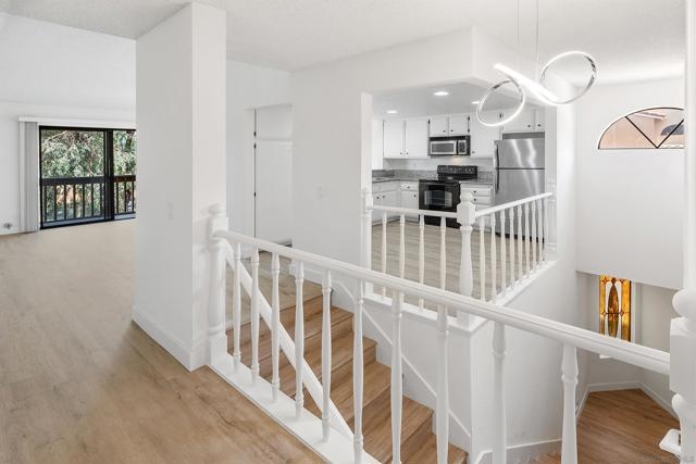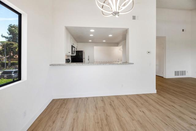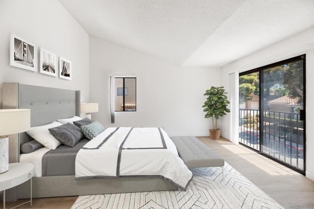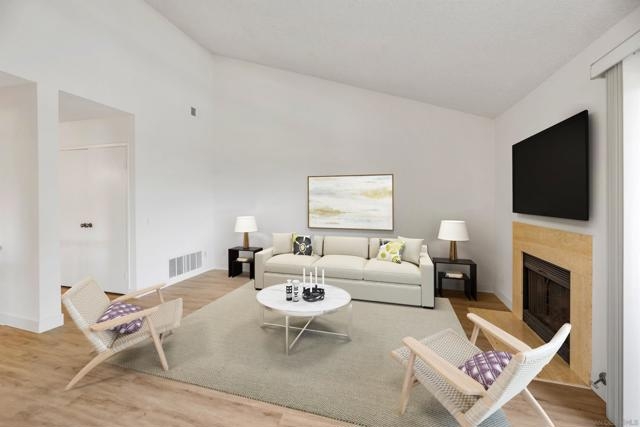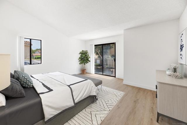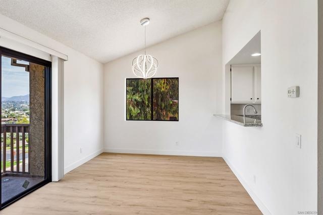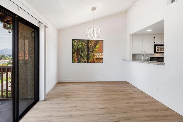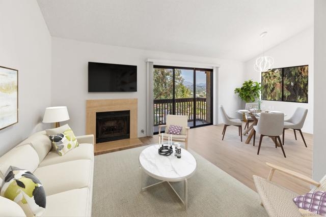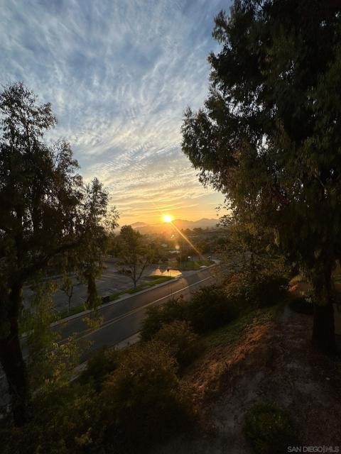 Rarely Available! Have your morning tea, with the breathtaking sunrise over Poway with panoramic mountain and city views from your living room and outside deck. Lots of natural light streams through all windows of this home. Vaulted ceilings in the living room and master bedroom give this home an expanded and large feeling. Freshly painted with new greyish/beige luxury vynyl plank flooring added throughout. Granite countertops and black front appliances, with all new hardware and knobs added will make your kitchen enjoyable to try new recipes in. Enter your home from your bottom floor or your one car garage, with a washer and dryer and dual overhead hanging storage system. The top floor is your sanctuary, where you may relax and entertain in a spacious large living and dining room area and soak in panoramic views from your private deck. The new exquisite hanging avant-garde lighting in the hallway and dining area is sure to be enjoyed by you and your friends and family and spark conversations. At the end of the hall is where you will relax in this large but cozy vaulted ceiling master suite, that boasts of a separate bath and shower area with a matching double sink surrounded by granite. No water bill. High walkability score for this area, shopping right across the street along Bernardo Center drive. This community contains a pool tennis courts, and hot tub. Use all the facilities of the Bernardo Heights Community Center, Olympic sized pool, tennis courts, fitness facilities & private Lucido Park. Award winning schools a short distance away, and a 3-minute drive to 1-15. Second parking spot allowed in front of garage and 2 parking permits for spaces outside. Don't miss out on this rare chance to call this condominium your new home! This Is An All Ages Community Not 55+