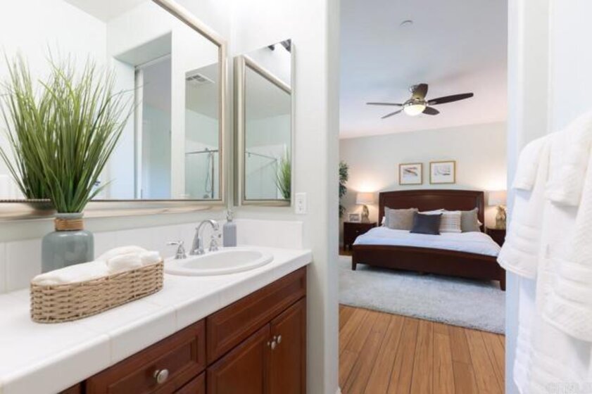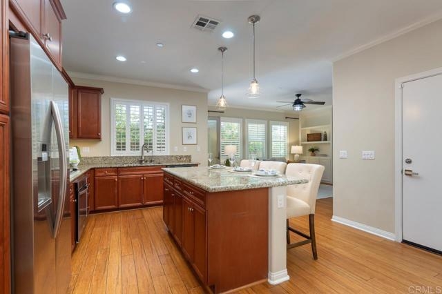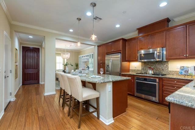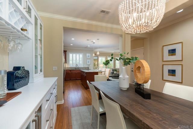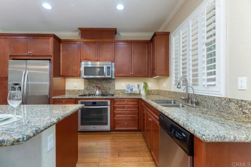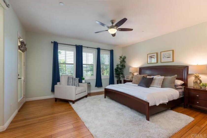 This home is in the Heart of a Del Sur Resort Style Community and has easy access to all Del Sur's luxurious amenities. It also has a great location just across from a community park and a quick walk to award-winning Del Sur Elementary School. This home offers great views, privacy and tons of natural light. As you enter the front door, a beautiful kitchen opens up to the dining room and the family room which also leads to a spacious & fully enclosed patio all on the main level! Heading upstairs, you can find 3 bedrooms, 2 baths, the laundry room and balconies. Master retreat on second floor includes private balcony access with views of parks and an ensuite bathroom featuring dual sinks, large glass shower, and walk-in closet. The 3rd floor is a privacy loft which is perfect for a work-from-home office or entertainment - your choice - with a great view of the nearby park. Interior upgrades include Bamboo flooring throughout, beautiful plantation shutters, tankless water heater, zoned AC/heat, electric car charger and more. The Del Sur community offers 11 solar-heated pools, 14 private parks, 18 miles of hiking trails, rentable recreation center, and is in the award-winning Poway Unified School District.
