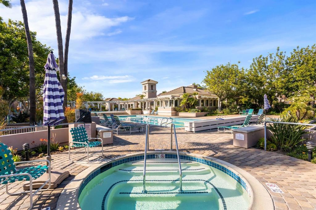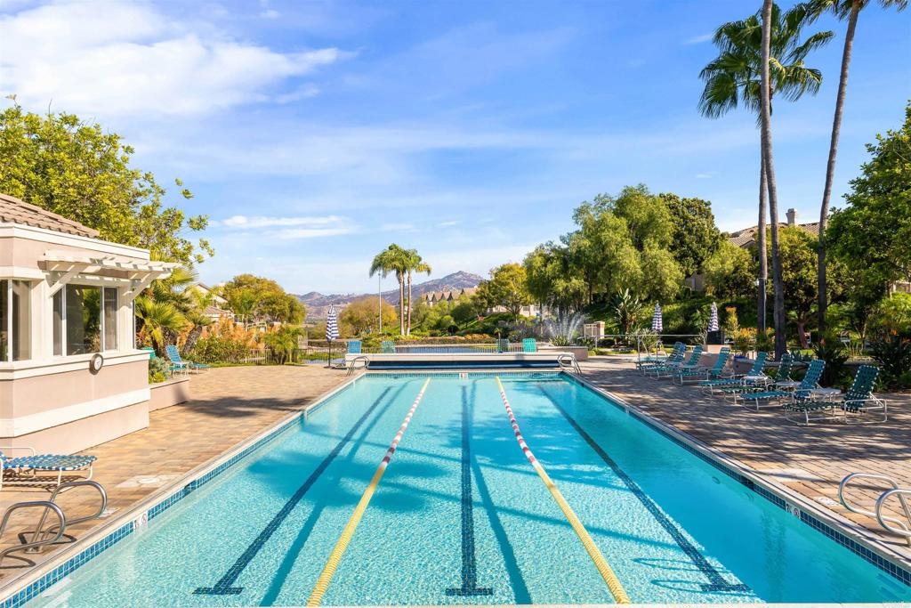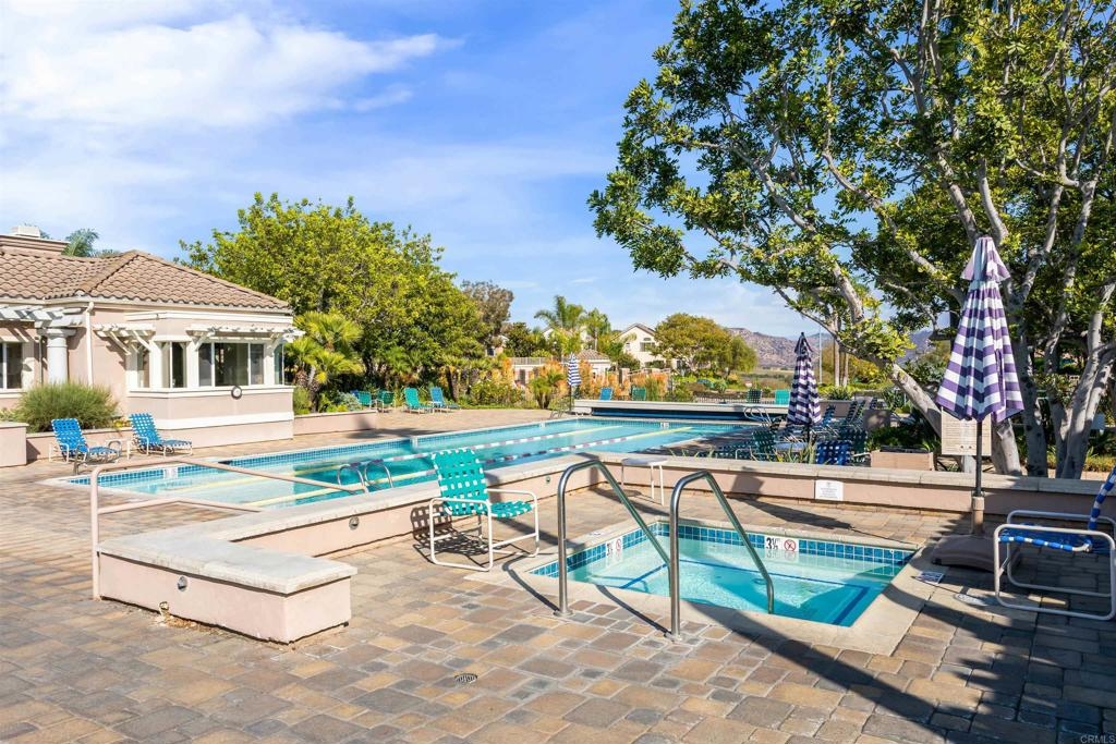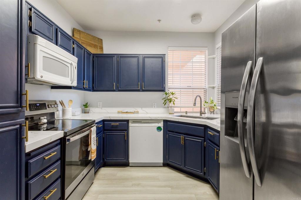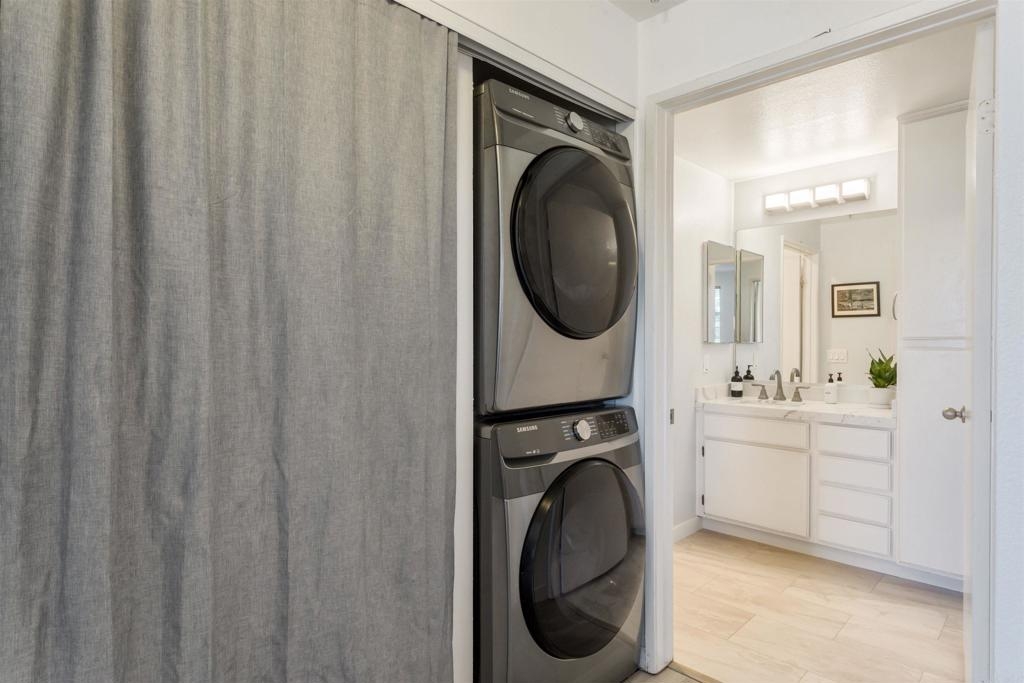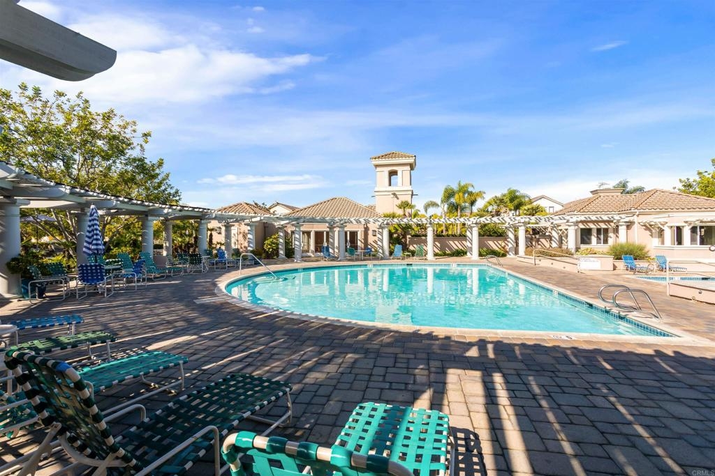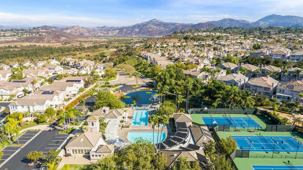 Fantastic open floorplan located in the popular Bernardo Vista Del Lago guard gated community. Modern upgrades throughout include luxury vinyl plank flooring, new paint, new appliances and 4 inch baseboards in this sunlit corner unit. Kitchen has new quartz counters, newer appliances, custom painted cabinets and new hardware. Large bathroom highlighted by new vinyl floor tile and new gleaming quartz slab countertops. Plenty of storage and full sized stackable washer and dryer. Convenient ground floor unit with spacious lush patio and mature landscaping. Complex features gorgeous resort style amenities including 3 pools, spas, clubhouse, fitness room, EV chargers, game room, 4 tennis courts, basketball courts, playground, feature pond with water feature and walking paths. Located in the highly acclaimed Poway Unified School. easy commuter access to I-15, shopping schools, restaurants and downtown.