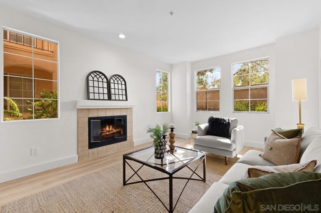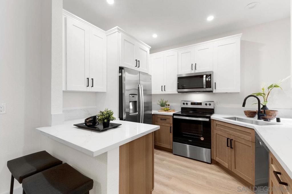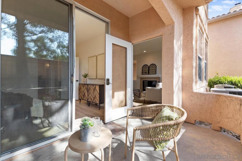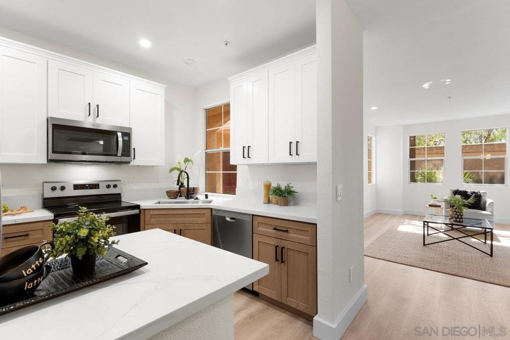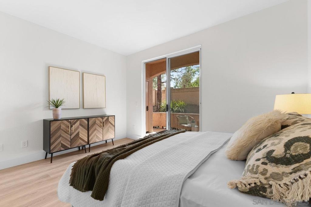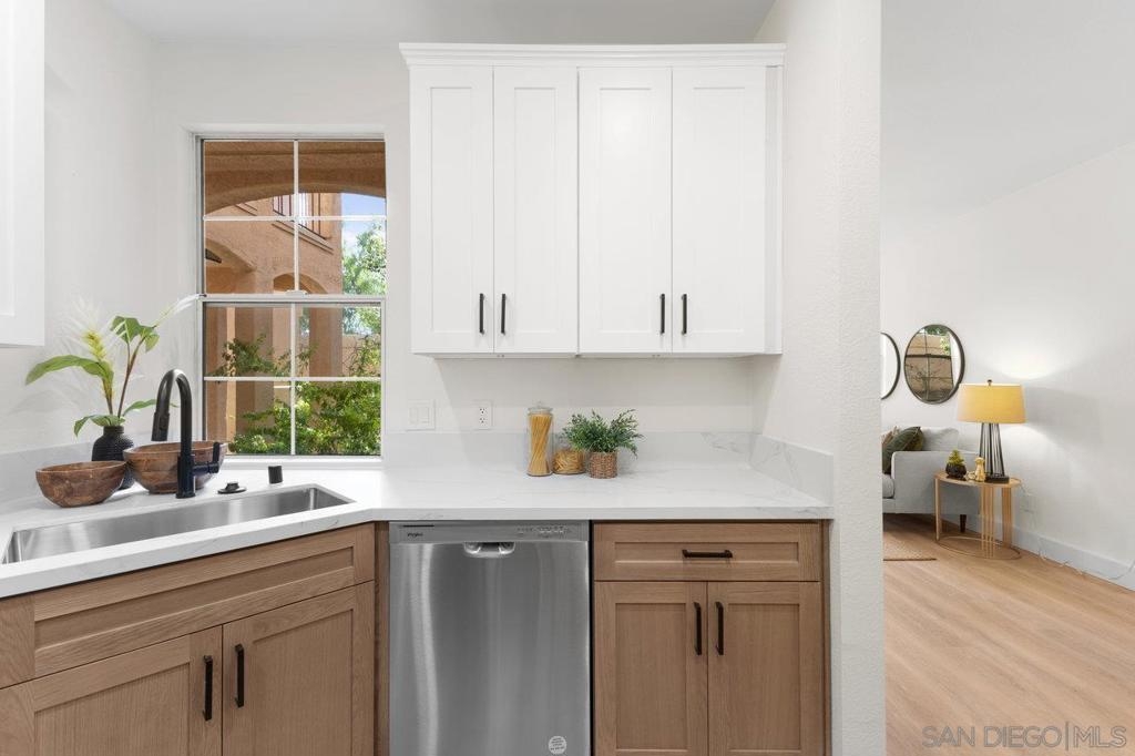 Enjoy resort-style living in beautiful home located in the desirable gated community of Morada at Bernardo Vista del Lago. Downstairs unit has expansive vaulted ceilings and tons of natural light and PARKING SPACE! Gorgeous luxury vinyl wood floors throughout the living room, dining area & spacious bedroom with walk-in closet. Access your private patio from the living room or your bedroom, and large storage closet on patio. In the hallway you'll find a full sized washer & dryer, and they convey along with all new appliances. Home was just renovated. Home includes a private garage with extra space for storage, where many only have an assigned spot in the carport. Additionally there is ample guest parking. The amenities are stupendous with 2 pools, tennis courts, an exercise room, billiard room & clubhouse. Conveniently located just off I-15, and 1 exit from the Westfield Escondido Mall with great restaurants. Explore nearby biking & hiking trails of Lake Hodges. HOA includes water & trash, exterior maintenance & all amenities.