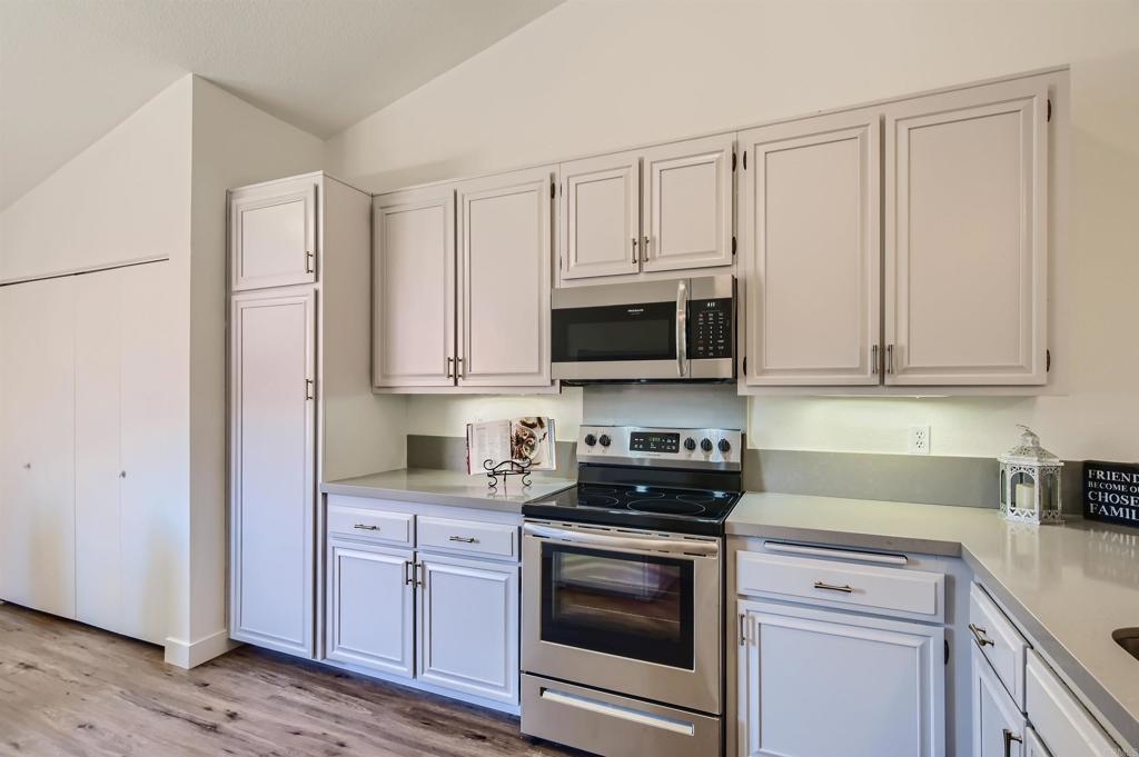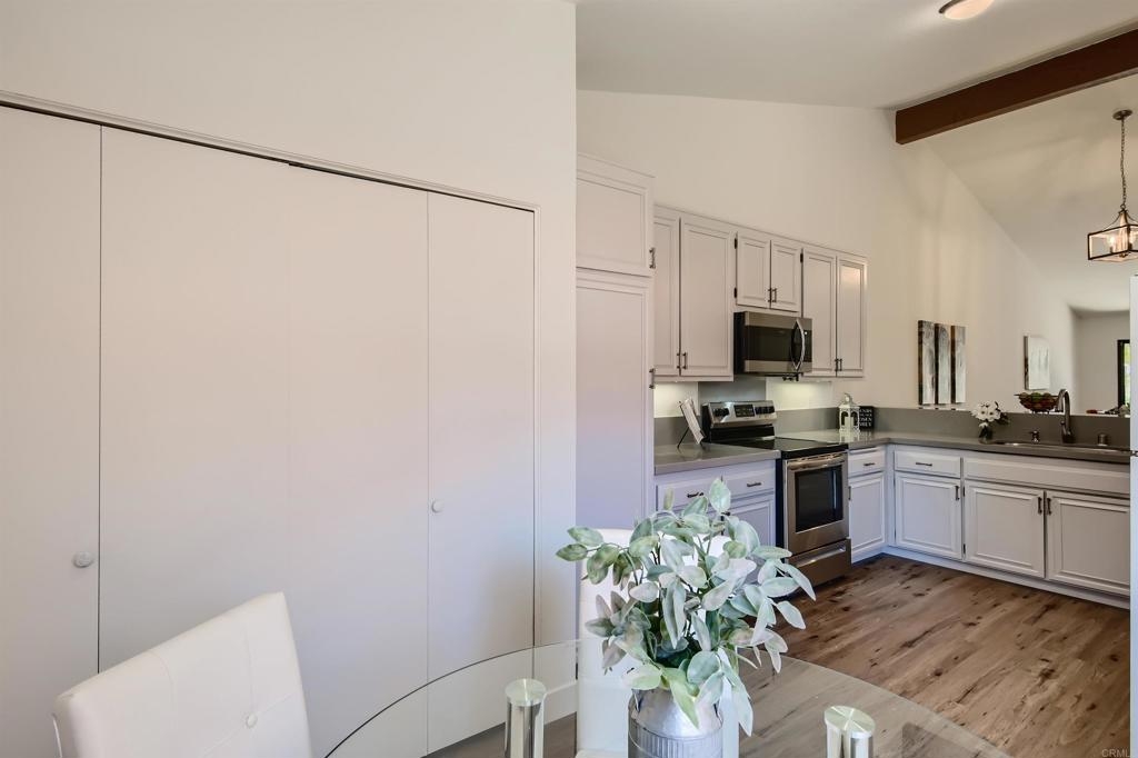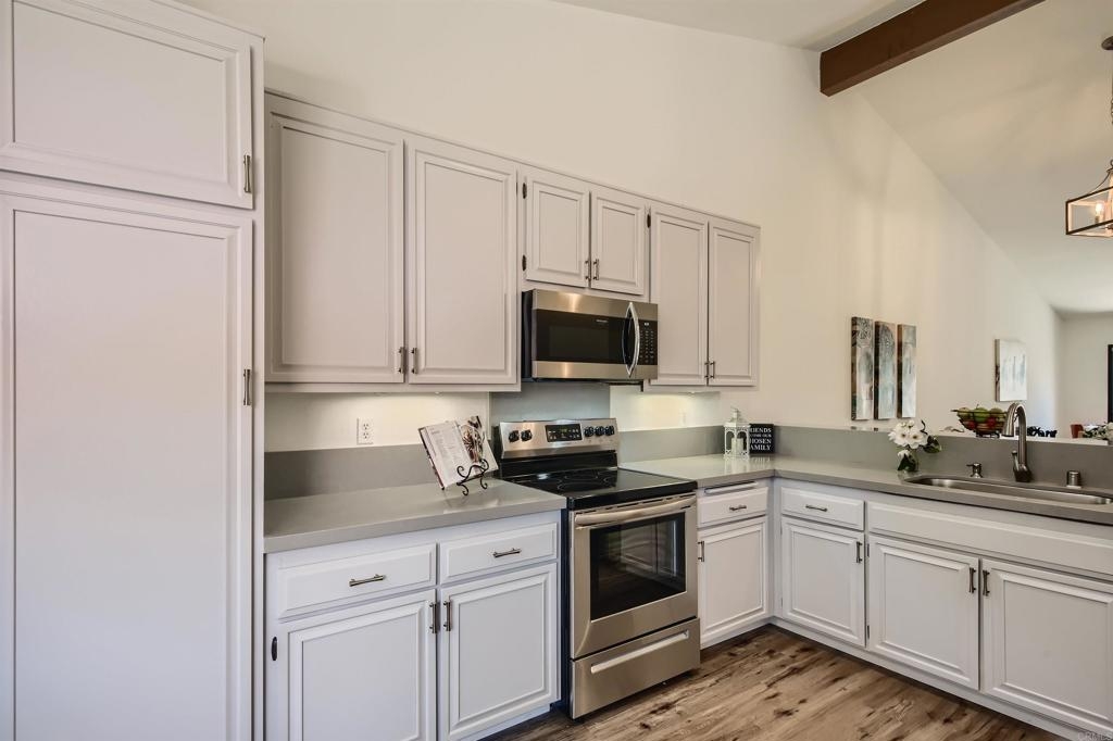 Serene single-story 2 bed/bath living in the wonderful North Oaks community. Freshly painted in warm white, new carpet and vinyl plank flooring. The kitchen is open to the vaulted living and dining areas with quartz countertops, new microwave and stove. Enjoy your private front courtyard or the views of the lush greenbelt from the back patio. Large primary bedroom and ensuite bathroom with a shower and solar tube for natural light. Three slider doors in the primary, secondary bedrooms and living area add a wonderful open feel to the home. Newer AC for the hot days will keep you cool when needed. Deep single car garage with storage shelving and direct entry to the kitchen area. Interior laundry area with stacked washer and dryer. Oaks North Community Center offers swim, tennis, pickleball, and many of the other activities as part of this 55+ community.