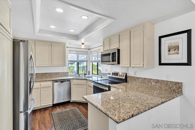 This lovely 3br / 2ba Single Story with an attached one-car garage is nestled at the end of a Premier cul-de-sac in the Senior (55+) Community of Oaks North in Rancho Bernardo. Updated and meticulously-maintained, the owner has recently added brand new flooring in the main living spaces. The bathrooms are tile. The Living Room features a gas fireplace, corner windows and a sliding glass door that opens onto the large patio that overlooks one of the larger Greenbelts in the community with mature trees and landscaping. The Kitchen boasts granite counters, crisp white cabinets, Newer Stainless-Steel Appliances include: Refrigerator, Dishwasher, Stove & Microwave. Primary Bedroom features a Large Walk-in Closet & direct access to the quaint private patio; perfect to enjoy a cup of coffee or glass of wine. The newly remodeled en-Suite Bathroom is gorgeous w/walk-in tile shower, New Vanity and Fixtures, Ultra-quiet ceiling vent fan w/built-in Bluetooth speaker. Additional features include: Vaulted Ceilings in the Living Room & Primary Bedroom, Solar Tube for additional natural light, New Window Coverings throughout; Interior Laundry Room w/Full-size (stackable) Washer/Dryer, updated fixtures. The entire interior (along with new baseboards) was painted within the last year. The Oaks North Community Center offers: Large Swimming/Lap Pool, Fitness Center, Pickleball, Tennis, Lawn Bowling, Woodworking Room, Multi-purpose Room and Library. The Rancho Bernardo Winery, with food, coffee & retail shops, weekly Farmers Market & RB History Museum, is located approximately one mile to the East and the Oaks North Golf Course is one mile to the South. Several other golf course options are also nearby. Come see ALL that this Fabulous Home & Community has to offer! All information is deemed reliable, but not guaranteed. Buyers/Selling Agent to satisfy themselves before contingency removal of all property details including, but not limited to easements, special assessments; permits, square footage; room dimensions & the like.