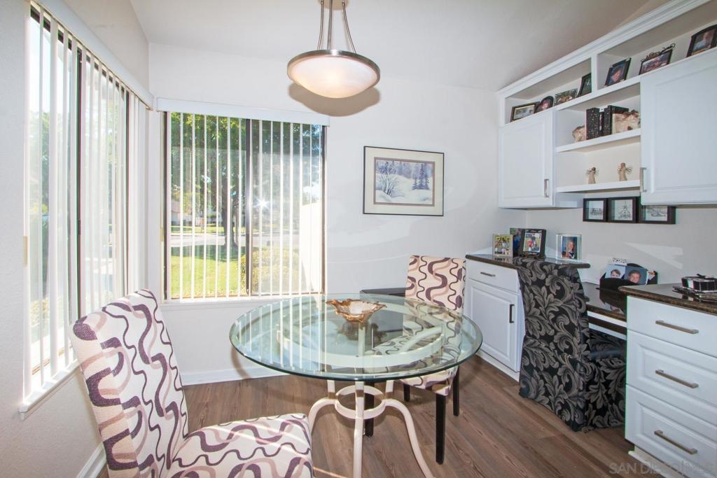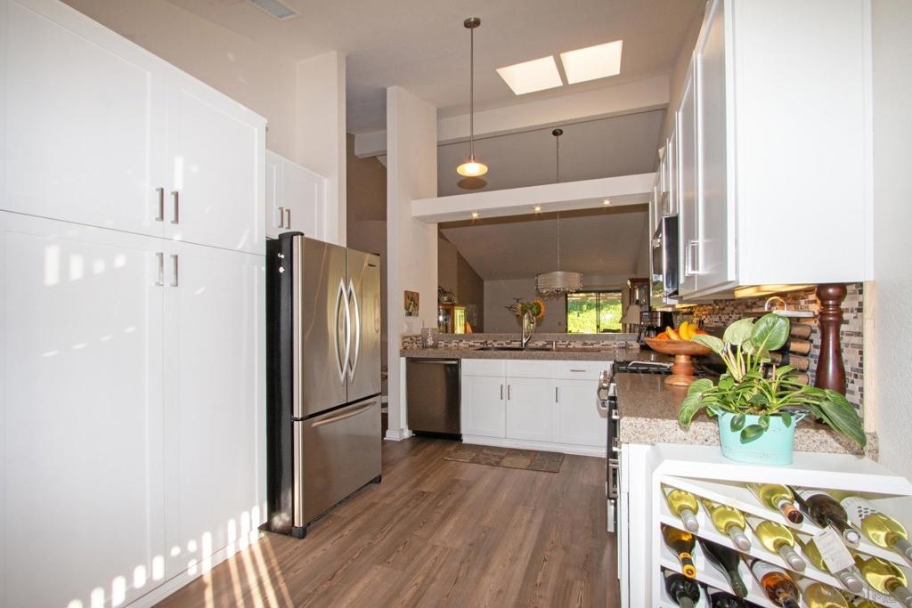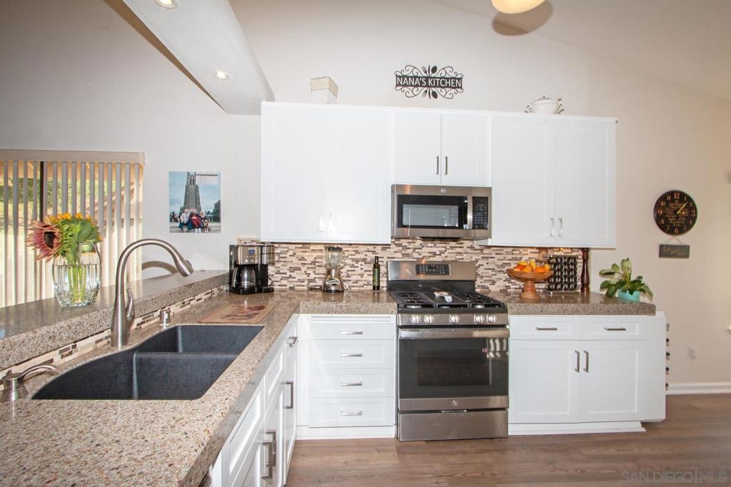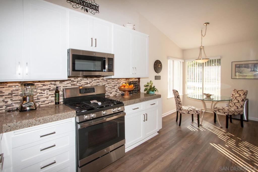 Stunning, upgraded, two-bedroom, two-bath home in popular Oaks North Villas! Light and bright, this end unit is private, and the back patio overlooks a green belt in a park-like setting. You will be cooking with gas in the eat-in kitchen with stainless steel appliances, crisp white cabinets, quartz countertops and a built-in desk with bookshelves. The formal dining room has sky lights in the vaulted ceilings. Luxury wide plank vinyl flooring throughout and carpet in both bedrooms. Curl up in front of the brick fireplace with mantle to read a good book or watch TV. The cheerful laundry area is enclosed in the garage with built-in cabinets and folding area. Updated baths with stone enclosures, upgraded cabinets and light fixtures and skylights. Enjoy coffee on the gated front patio or entertain friends and family on the large, covered back patio. Meet your friends at the Oaks North Community Center for a swim, a game of tennis, pickle ball, lawn bowling, movie night, travel club, holiday dances, fitness center or to get a book out of the library. Oaks North is a community for people 55 years old and older.