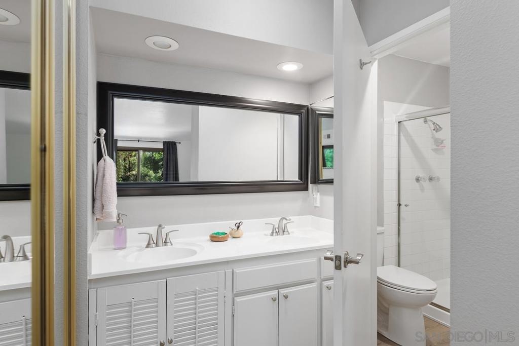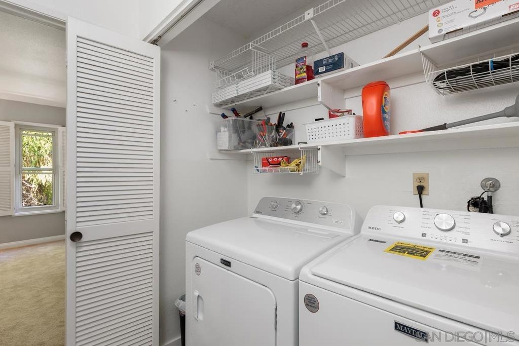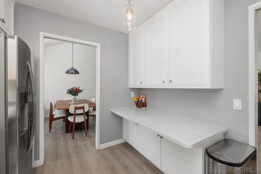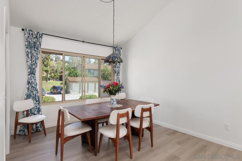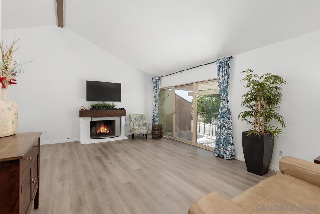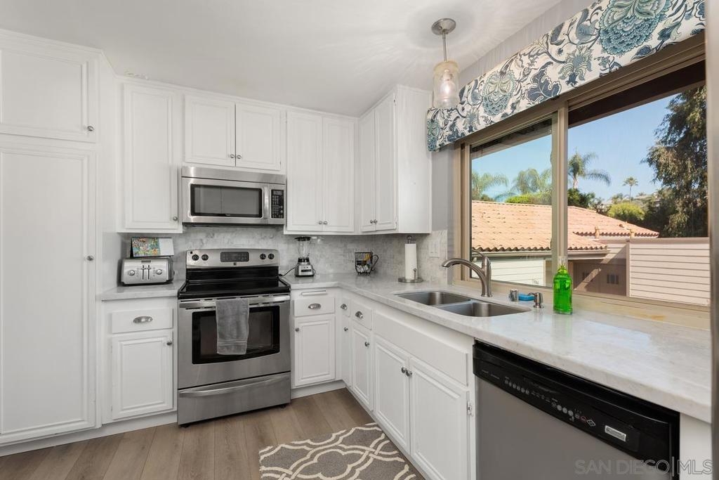 Beautiful Rancho Bernardo Oaks North community 55+ , this updated upstairs end unit offers 2 bedrooms, 2 full bathrooms, and a versatile den—ideal for a home office, guest room, or hobby space. The floor plan features vaulted ceilings, plenty of natural light, and a gas/wood-burning fireplace. A private balcony overlooks the golf course, providing a cozy outdoor space. The kitchen includes stainless steel appliances, Carrera marble countertops, and ample cabinet storage. Recent updates include newer flooring, carpet, dual-pane windows, and in-unit laundry. The 1-car garage stands out with a cubby suited for a workbench or extra storage—great for tools, hobbies, or gear. Oaks North offers community amenities like a pool, tennis courts, fitness center, and social clubs. HOA covers water, trash, internet, and cable. Conveniently located near Bernardo Winery, golf, trails, shopping, and dining.