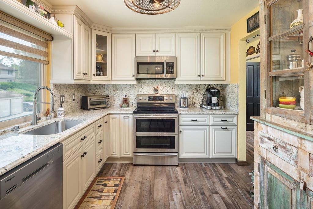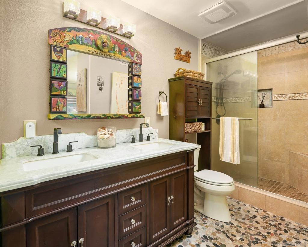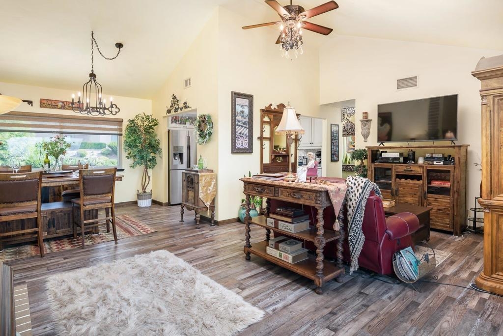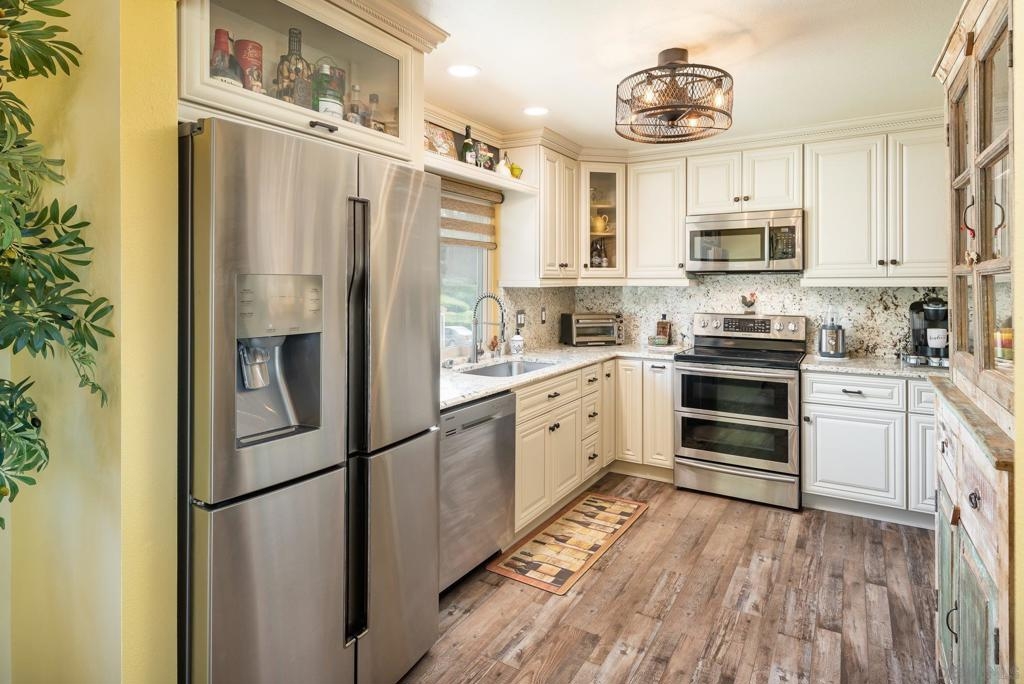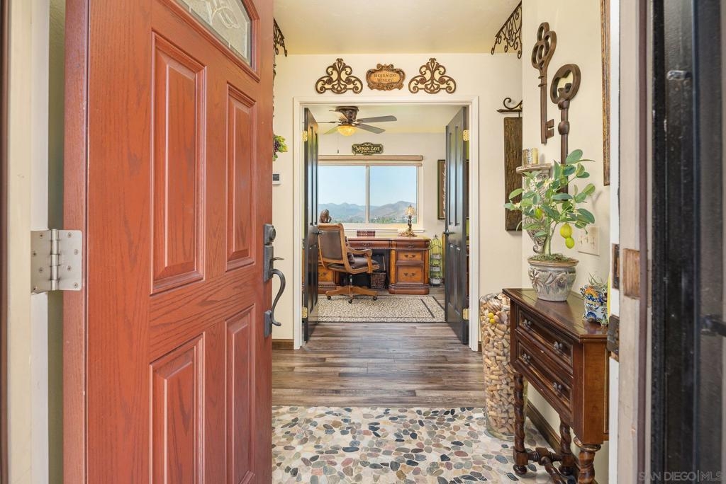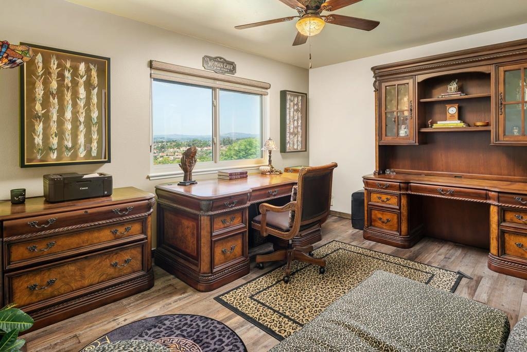 Range Priced $650,000-$675,000. PREMIUM VIEWS and LOCATION. Upper End-Unit elevated atop Plaza Maria is Highly Upgraded. Spacious plan has vaulted ceiling. Elegant custom renovations of the finest quality include systems, kitchen w/expanded entries, baths, plank floors, low-E windows, hardwood doors, Italian tile. 3rd bedroom use is office, prior was bedroom (no closet). Upscale Active 55+ living & Oaks North Community Center: pool/spas/tennis/fitness+ Some photos virtually painted.>SEE TOURS< MUST SEE in person to appreciate! Resort style living in sunny San Diego. Enjoy sunset, mountain and golf course views from the comfort of your home. Private View balcony feels heavenly. The premium location enjoys proximity to the winery & plentiful guest parking. The moment you step inside you’ll be surrounded by first-class upgrades. River rock stone entry leads to "Sonoma" luxury vinyl plank flooring that is waterproof/sound resistant & framed by hand-stained 3” wood baseboards.>The culinary custom kitchen is stunning. Solid wood cabinetry is accented by raised panel doors, crown/base molding & bronze pulls. Cabinet extension includes glass faces + upper curio shelf. Lazy Susan, spice drawer & pull-out dual eco trash bins utilize space. Sealed granite counters w/full backsplash makes for easy care. Stainless “Samsung Suite” appliance package includes double-oven, 4 burner glass cooktop + warmer & double-door refrigerator w/ filtered exterior water/ice dispenser. The deep Cascata under-mount single basin stainless sink boasts a high-arc chef’s faucet and filter switch.>All bathrooms were tastefully upgraded. The ensuite master now includes dual sink basins, Carrera marble countertops and stone shower surround to ceiling. The guest bath boasts authentic Italian tile flooring, stone counters and stone shower surround to ceiling with mosaic pattern accent.>Energy efficiency features include Low-E Windows & Slider, HVAC, Water Heater, Blown attic insulation, Whole house water softener and Solar Tubes in both bathrooms. Several doors are custom “Knotty Alder” solid wood. Electrical was added to the living room ceilings allowing for a light/fan fixture.>Membership to Oaks North Community Center, a 55+ exclusive private use recreational and social facility included. Residents can enjoy the Olympic size pool and spa with sunbathing deck, locker rooms with showers and sauna, and a fitness center. For the creative minded, there is a ceramics, art and wood shop room. Additional sports found here are tennis, lawn bowling, billiards and a game room. The large Auditorium, Library and meeting rooms complete the center. Other activities include well being classes, organized clubs, groups and gaming, and frequent entertainment events.>Oaks North public golf course and Rancho Bernardo Community Park is also nearby.