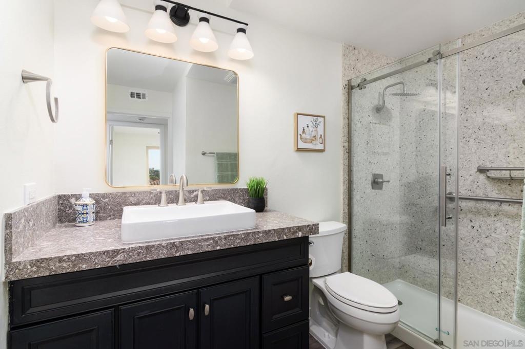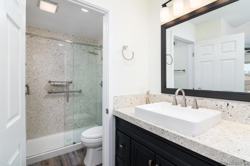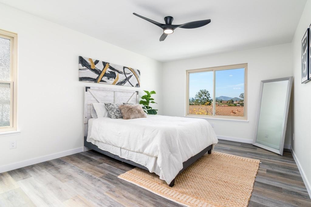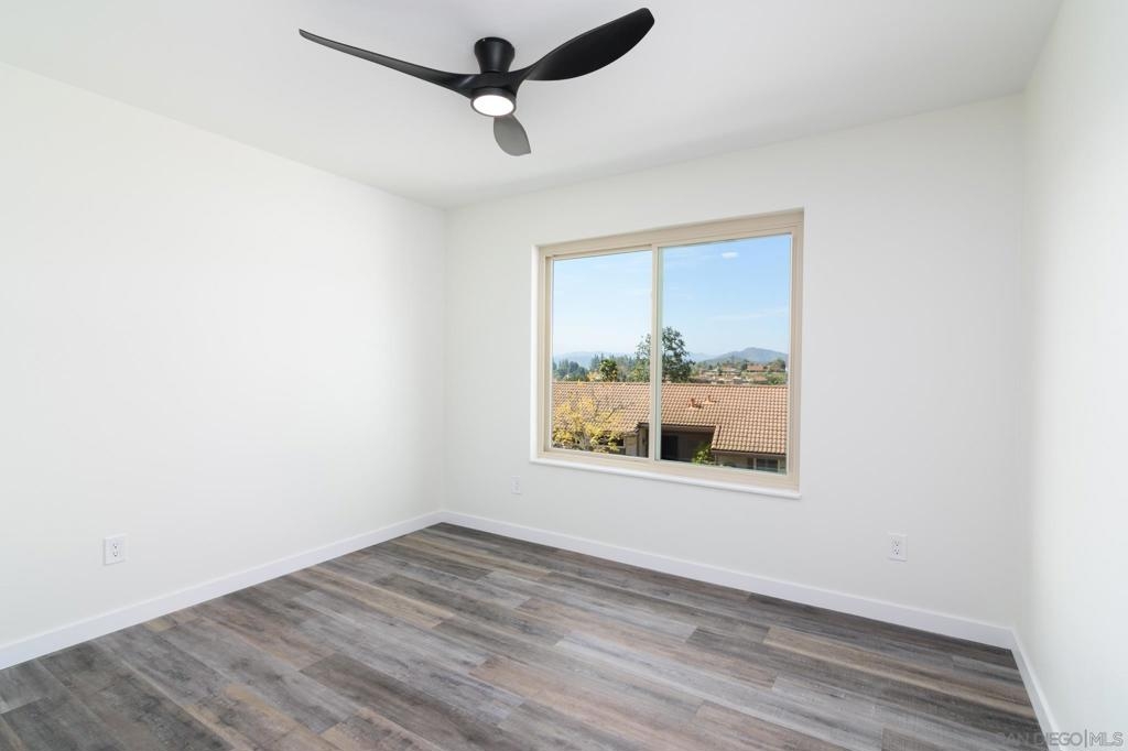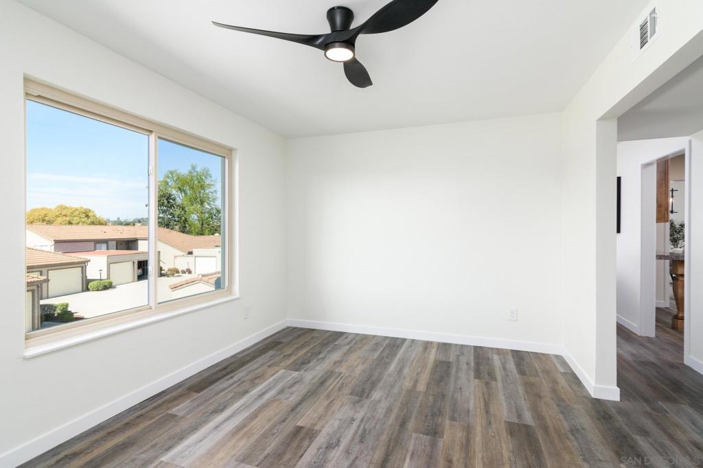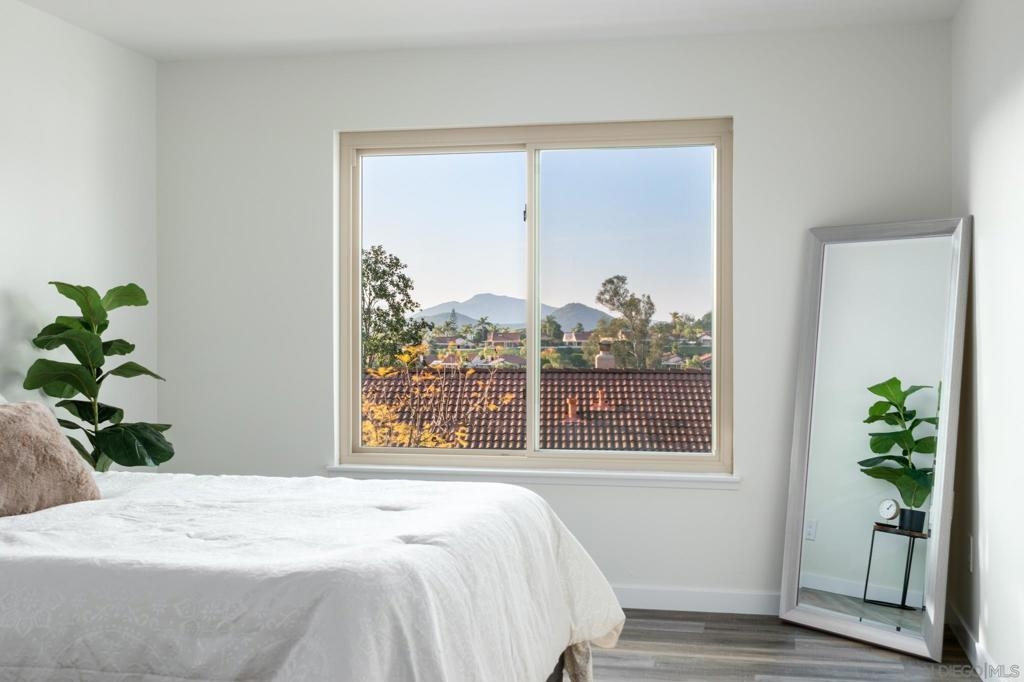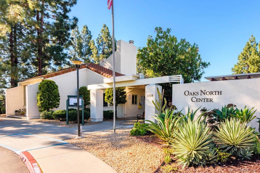 Beautifully renovated single level 2-bedroom home plus optional 3rd bedroom/office, **rare oversized 1-car garage, indoor laundry, and breathtaking panoramic mountain views!** Corner unit located in the highly desirable 55+ active community of Oaks North, this turnkey home offers both privacy and a prime location set high above the community. Full renovation includes **new oak kitchen cabinets, high-end sleek black stainless steel appliances, large deep sink, new central A/C with Nest thermostat, new dual pane vinyl windows**, new floor to ceiling designer tile fireplace with TV outlet and gas burning fireplace, luxury vinyl plank flooring throughout, upgraded baseboards and trim, modern doors, and closet organizers with new doors. Enjoy full-size indoor laundry and upgraded LED can lighting with a stylish “halo” feature throughout. Both bathrooms have been meticulously remodeled with full stone slab showers, premium "Delta" fixtures, "Kohler" sinks and toilets, new elegant vanities, and designer lighting. Enjoy gorgeous mountain and evening light views from the primary bedroom while lying in bed, complete with dual closets and a beautifully redesigned en suite bathroom. HOA dues include ***cable/internet, water, trash, and sewer,*** plus access to a resort-style community center with pool, spa, fitness center, tennis and pickleball courts, lawn bowling, social events, and more! Located in the highly desirable 55+ community of Oaks North in Rancho Bernardo, this neighborhood offers an unbeatable combination of active lifestyle, serene surroundings, and prime location. Residents enjoy resort-style amenities including a pool, spa, fitness center, tennis and pickleball courts, lawn bowling, library, and countless social clubs and activities. The community is beautifully maintained and offers stunning golf course and mountain views, along with peaceful walking paths and a friendly, welcoming atmosphere. With low HOA fees that include cable, internet, water, and access to the premier community center, Oaks North is perfect for those seeking a vibrant yet relaxed lifestyle. Just minutes from shopping, dining, golf, wineries, and the freeway, it's the ideal blend of comfort, convenience, and community.