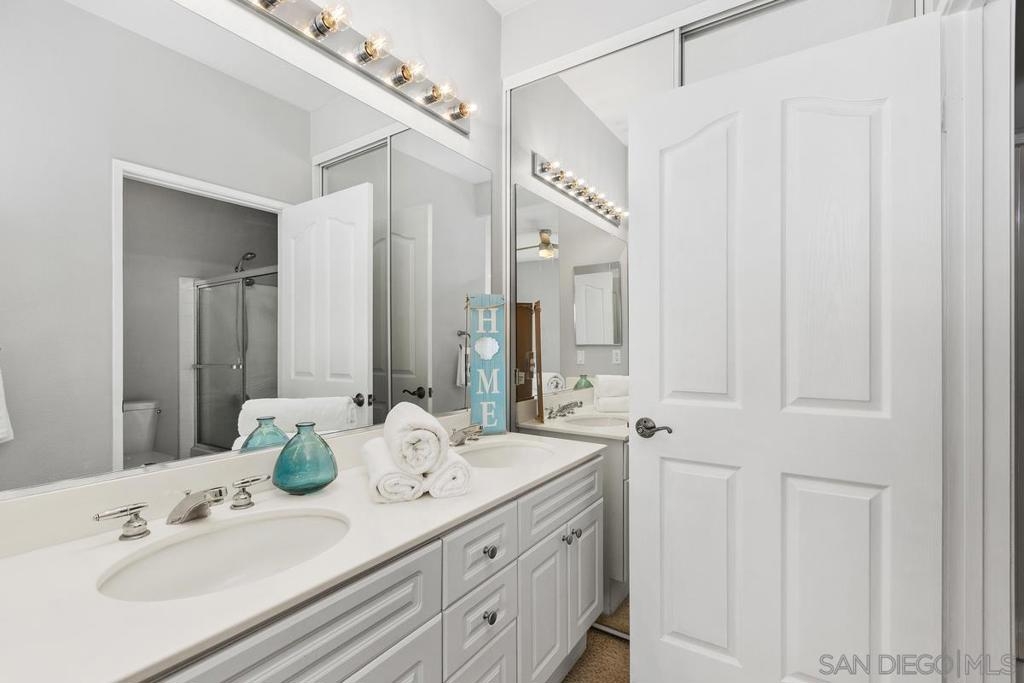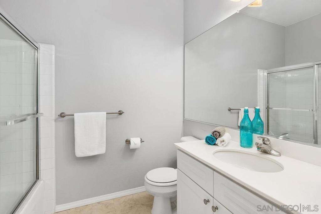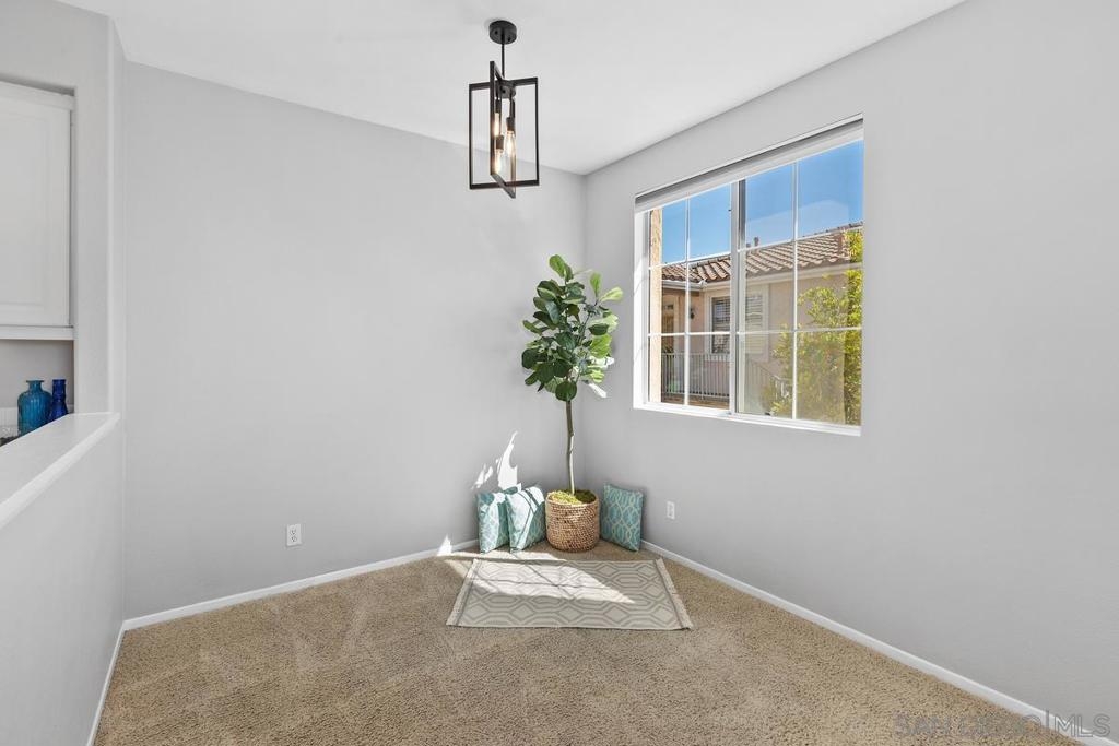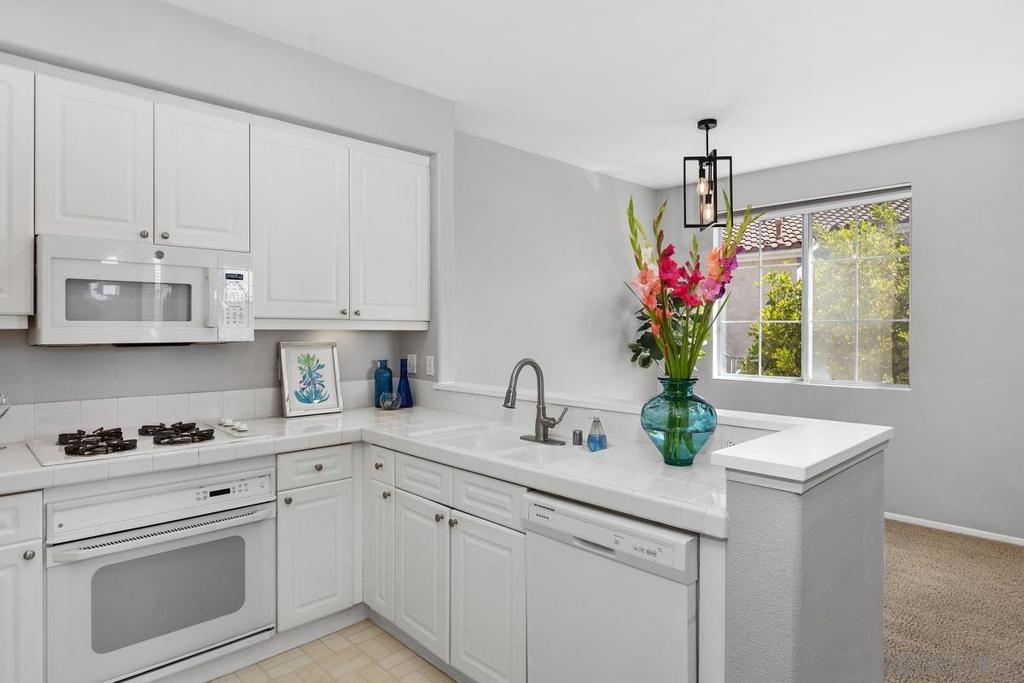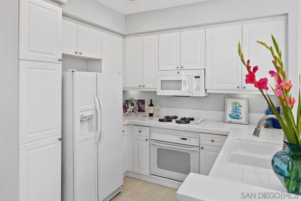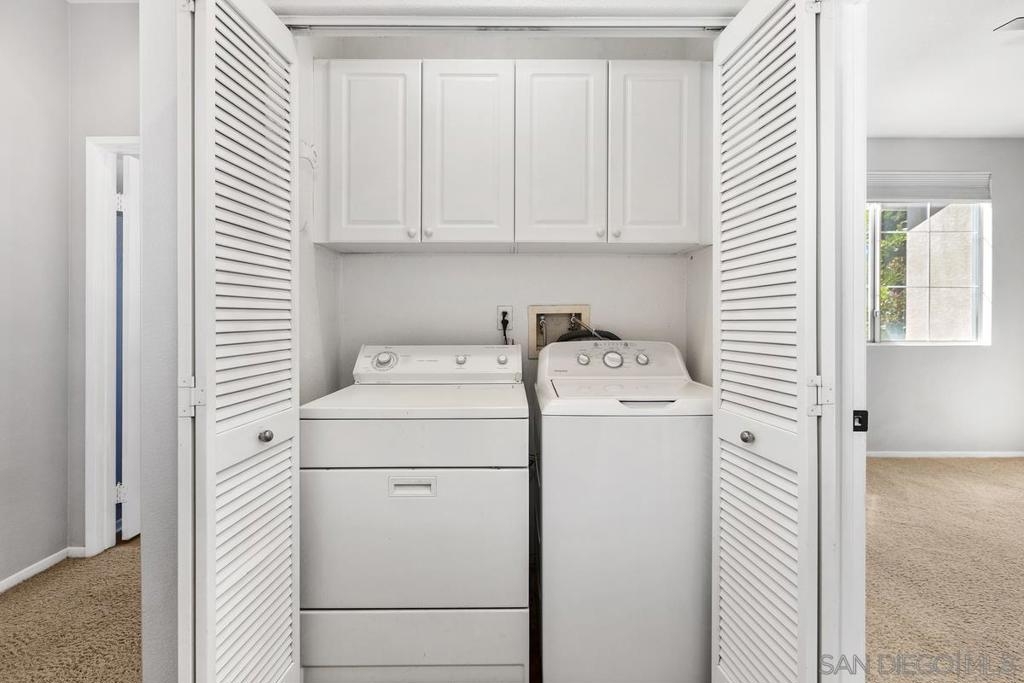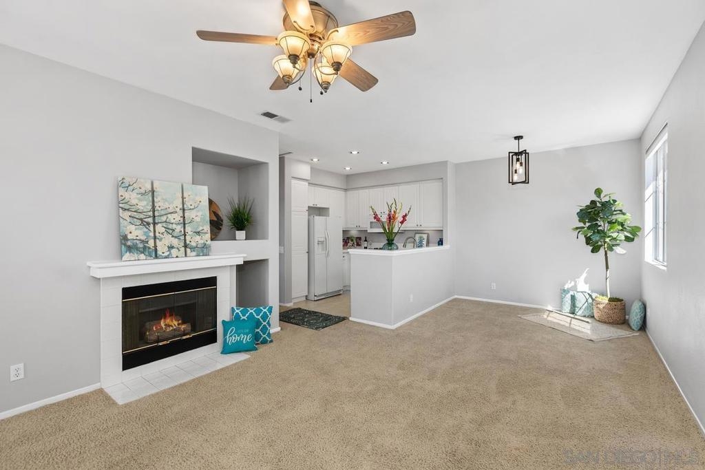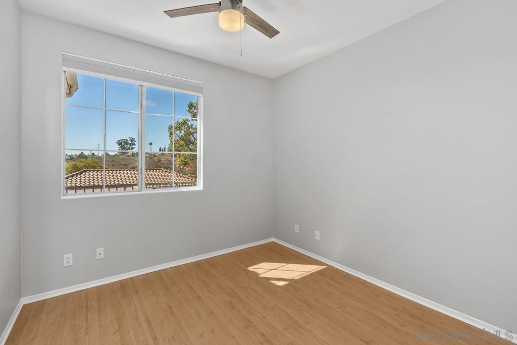 SPARKLING & SPACIOUS 2bd/2ba with sun filled rooms, a private patio and a detached garage with storage! Desirable floor plan w/a gas burning fireplace, ceiling fans, air conditioning, spacious rooms, white cabinetry and 2 full baths! This upstairs unit was recently painted and has views toward the canyons and attractive landscape throughout the complex. Enjoy cooking in your kitchen which includes energy saving appliances, gas stove and ample storage! Primary bedroom features plenty of natural light, generous closet space and a beautifully lit vanity. Hall bath with shower over tub and single sink vanity. 2nd bedroom can be used as an office or workout room with its modern plank flooring and energy saving ceiling fan. Conveniently situated in-unit washer & dryer convey. Inviting community pool and spa are ideal for water activities and the fitness center is centrally located. Enjoy nearby parks & trails Plus top rated Poway School District.