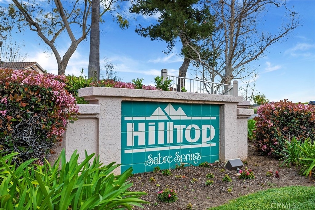 Move in ready! A MUST SEE. Well-maintained second story end unit in the beautiful Hilltop Community of Sabre Springs. This unit has modern touches throughout. The kitchen features a full size refrigerator separate dining and living room. Upgraded bathrooms in hallway and master bedroom. Master and second bedroom are large with Ample storage throughout the unit. Plenty of cabinet space in the bathrooms, kitchen, and an additional storage & water heater closet located on the balcony. Full size Washer and Dryer are inside the unit. The balcony is large with room for a full sized gas grill, patio furniture, and plants. This unit is situated behind matured trees and is in a private second-level location. The location is perched on top of Sabre Hill Drive and is located near an abundance of beautifully maintained parks and hiking trails. Located in the renowned Poway School District.End unit privacy, on second floor, pool and spa in community. NO Mello roos. Close to shopping, restaurants, freeways, Biking, hiking trails, Costco, Best Buy & major military insulations.