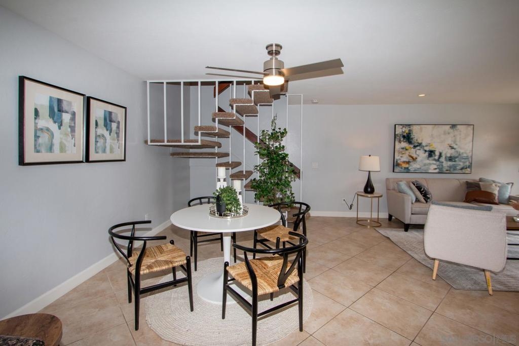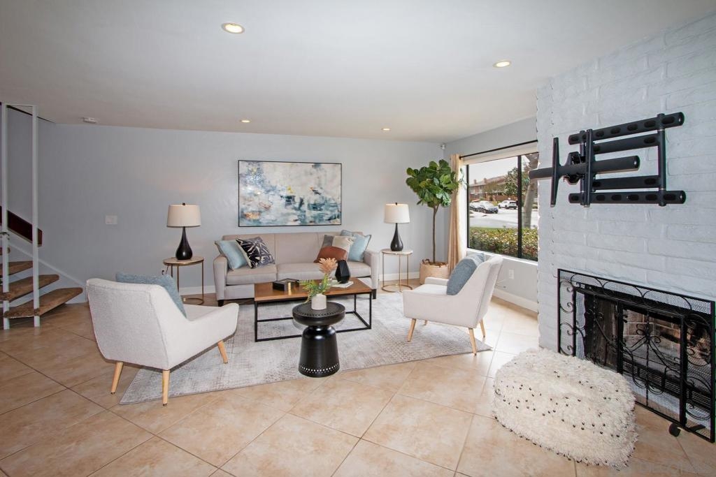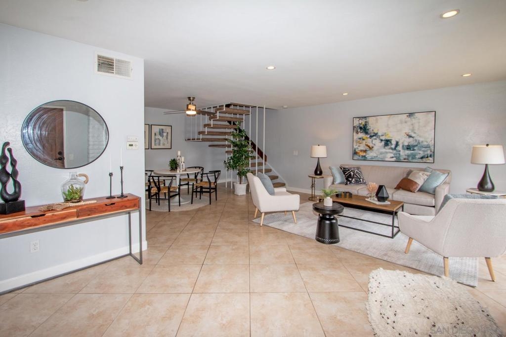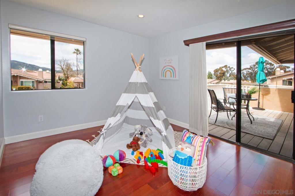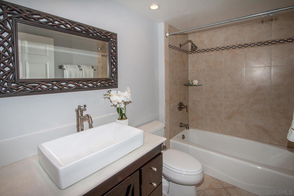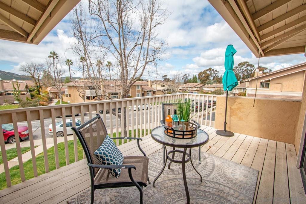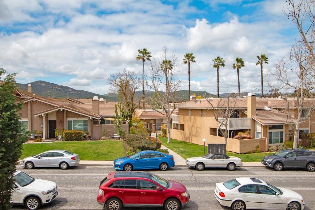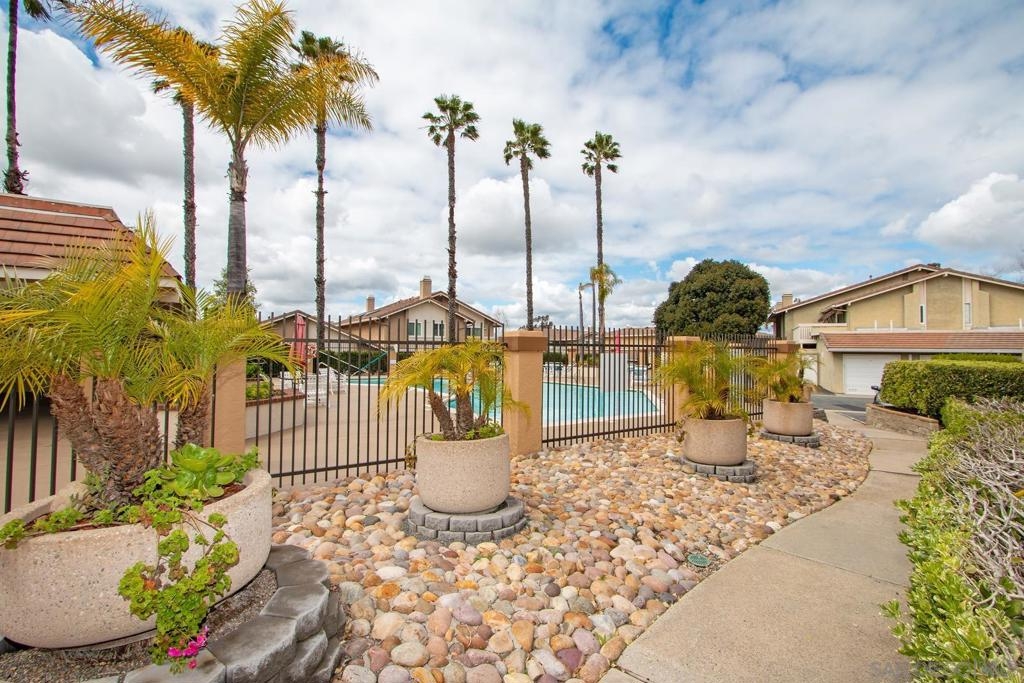 This is a delightful two-story condominium located in the San Diego neighborhood of Rancho Bernardo. The area is surrounded by hills and beautiful views of the nearby mountains. The neighborhood is close to shopping, dining, churches, schools, public transportation, and entertainment. It is also conveniently located near the freeways 56, 163, and 15, making it easy to get around the city, and about 20 miles to the beach, and three lakes, for boating, hiking, and biking. This home has an upstairs balcony off the Primary and second bedrooms, with a view of the nearby hills and gorgeous Sunsets! The primary bathroom sports dual closets with shelves, double elegant sinks, and a Jacuzzi bathtub. Downstairs, besides the front door, you can enter through a spacious fenced in patio – ideal for tykes with bikes – through French doors into the Living room or the Kitchen/utility area – so convenient for hauling groceries! Here you will find the closeted washer and dryer, newer furnace and water heater, plus numerous pantry cupboards. The complex sports 2 swimming pools with Jacuzzis, a tennis court, and basketball court, all included with low HOA fees. No Mello-Roos. The living room screams entertainment with a wide-open floor plan to dining room and kitchen. Think, Super Bowl Games, Academy Awards, and other special events, around the cozy fireplace. This is a home you can continue to grow into over the years! And it’s ideal for a home business! Come on by!