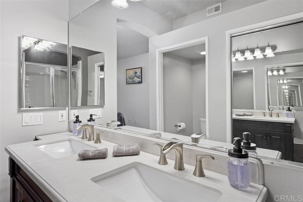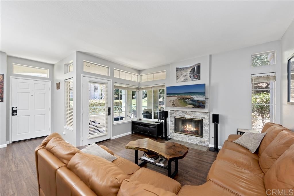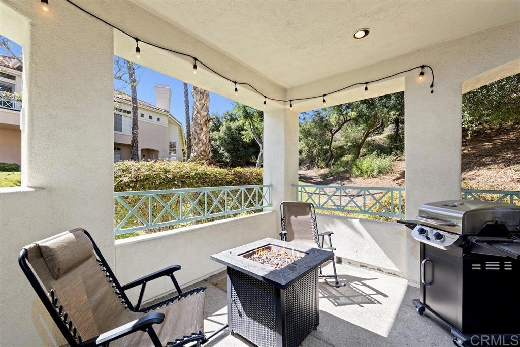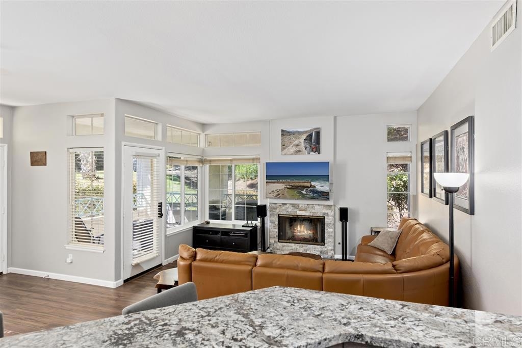 This first floor private corner unit at San Tropico is impressive! Remodeled kitchen w/new stained wood cabinetry, granite countertops, decorative backsplash, recessed lighting, tile flooring & GE stainless appliances. New laminate wood flooring & baseboards throughout add a contemporary flare. Both bathrooms showcase new vanities, light fixtures & soft grey tile flooring. Stacked stone fireplace is the focal point of the living room. Walk out covered patio for indoor/outdoor living. See supplement. [Supplement]: ** View the 3D Matterport virtual tour for all details** Entire unit has been recently repainted. New dual paned windows installed in 2018. Oversized one car attached garage with 220V outlet provides for lots of storage space and direct unit access. Ring camera and smart door lock for added security will convey. There is room to park one vehicle in the driveway, another assigned parking space and guest pass for additional parking space. San Tropico, a beautifully maintained community with a a pool and spa. Located within the Poway Unified School District. Complex is FHA approved.