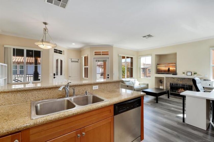Luminescent top floor unit located in a great, private location within the highly desirable community of Savannah Terrace in Sabre Springs. Enter to gaze upon gorgeous crown molding, a cozy fireplace and neutral colors throughout. An open concept floor plan allows the living room, dining area and kitchen to flow seamlessly together. Large windows bathe the interior in soft, warm natural light. Grab your favorite beverage to sip and sit on the serene balcony to soak in the idyllic San Diego weather all year round. The updated kitchen features plenty of cabinet space, granite countertops, stainless steel appliances and an eat-at counter. The in-unit laundry includes the washer and dryer too! Relax and unwind in your large primary suite which includes an en-suite bathroom and walk-in closet. A detached one car garage makes parking a breeze, plus one additional guest space. Savannah Terrace offers its residents resort-quality amenities including tennis and basketball courts, a sparkling pool, spa, picnic areas with BBQ’s and an outside fireplace. Ideally located only minutes from biking/hiking trails, award-winning schools, shopping, dining and entertainment venues. Easy freeway access too! This is a must see!
