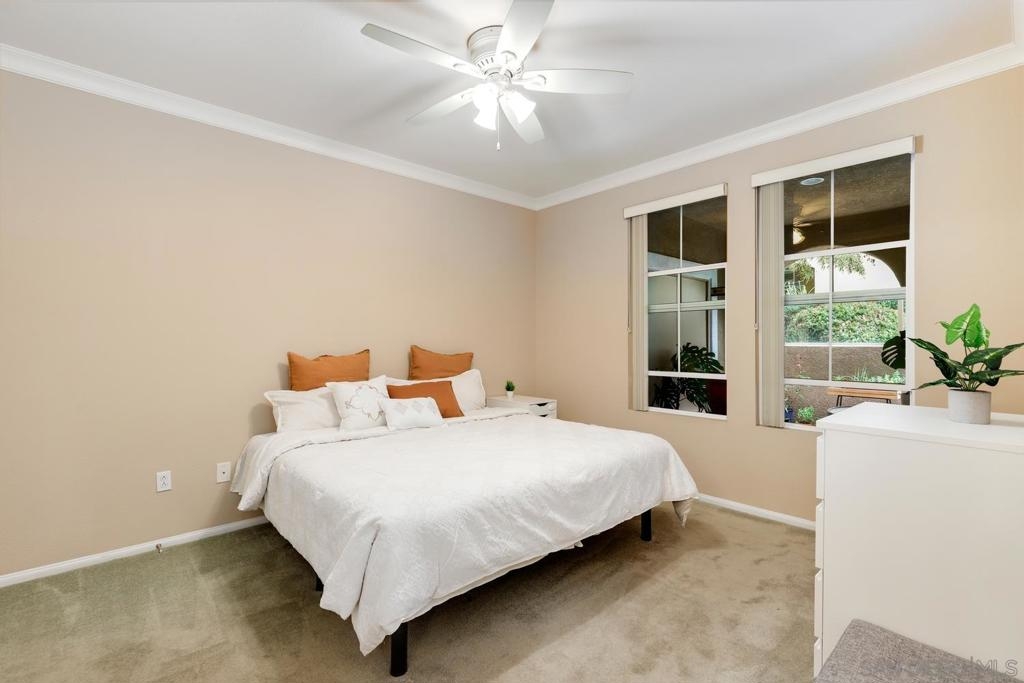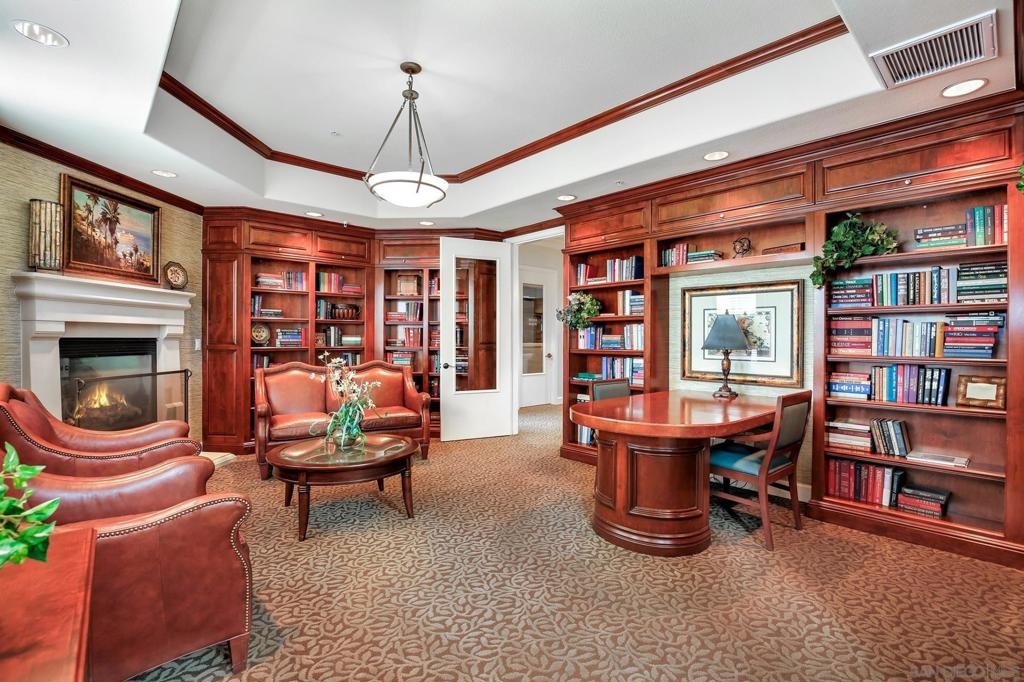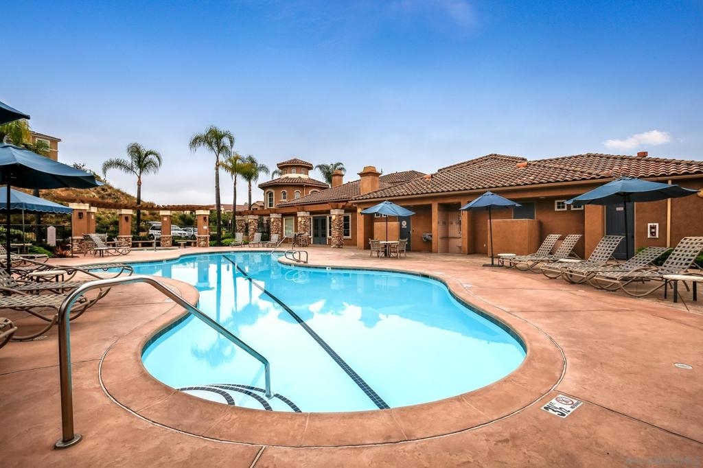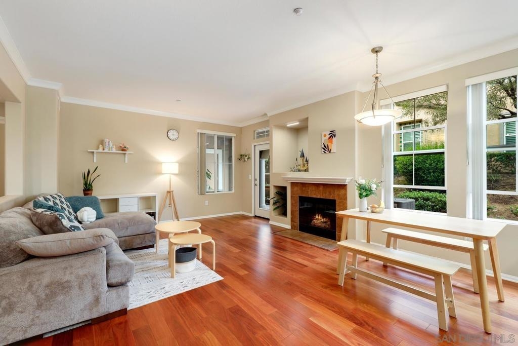 Spacious Ground-Level Condo in Desirable Sabre Springs – Poway School District! Enjoy a well-designed floorplan featuring an open living room with a cozy fireplace that flows seamlessly to a private patio—perfect for indoor-outdoor living. The kitchen offers stainless steel appliances, granite countertops, warm honey-hued cabinetry, and breakfast counter seating, creating a functional and inviting space for everyday living and entertaining. Beautiful wood flooring runs throughout the entry, living room, kitchen, and hallway, complemented by crown molding in both the living room and spacious primary bedroom. Additional highlights include central A/C, a dedicated laundry room, and an attached 2-car garage. Located in the sought-after Savannah Terrace community, residents enjoy access to resort-style amenities including a pool, spa, sauna, steam room, gym, tennis and racquetball courts, a media room, library, barbecue areas, and a party room with kitchen available to rent. All this within the highly rated Poway Unified School District, with shopping, dining, parks, and freeway access nearby in the Sabre Springs neighborhood. This is San Diego living at its best!