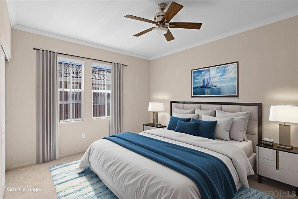 Price reduced! Gorgeous, move-in ready 2 bedroom, 2 full bath condo with garage in the peaceful and desirable Sabre Springs community of Savannah Terrace. Surrounded by beautiful hillside views, but just minutes to the 15 and 56 freeways, it's easy to enjoy all the best of San Diego living with parks and trails right outside your door and the beach only a short drive away. Step inside to gleaming laminate flooring and a light-filled open floor plan. The living room features a gas fireplace, while the dining area right off the kitchen is spacious with room enough for a table & storage. The kitchen boasts handsome wood cabinetry, granite counters, and stainless steel appliances. The dishwasher is brand new, while the fridge and microwave were replaced approx. 2022. The balcony is peaceful and private with views of the nearby hillside and open space. The condo includes 2 bedrooms and 2 full baths, with the primary suite featuring an ensuite with a double-sink vanity and tub/shower combo. A stacking closet washer/dryer (LG brand - just added in 2024) adds comfort and convenience. The hall bathroom also has a tub/shower combo. The condo sits above your own private 1-car garage (accessed via an exterior staircase) with high ceilings allowing for extra vertical storage. Additional, unassigned surface parking spot with permit from HOA. Additional notable features include a newer water heater in the garage (approx. 2019), newer AC & heat done approx. 2023, newer laminate flooring (approx. 2011) & newer high-end carpet in the bedrooms in mint condition (approx. 2020). HOA includes internet, trash, & access to the resort-style community amenities: pool, spa, tennis court, gym, clubhouse, & playground. Close to parks, shopping, & dining. Top-rated Poway School District!