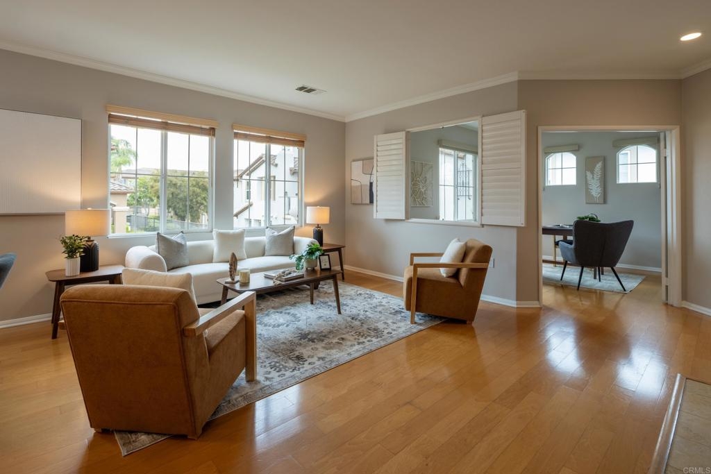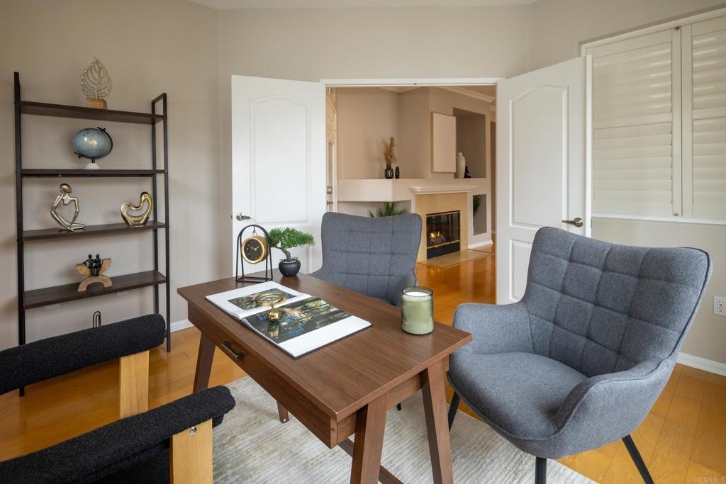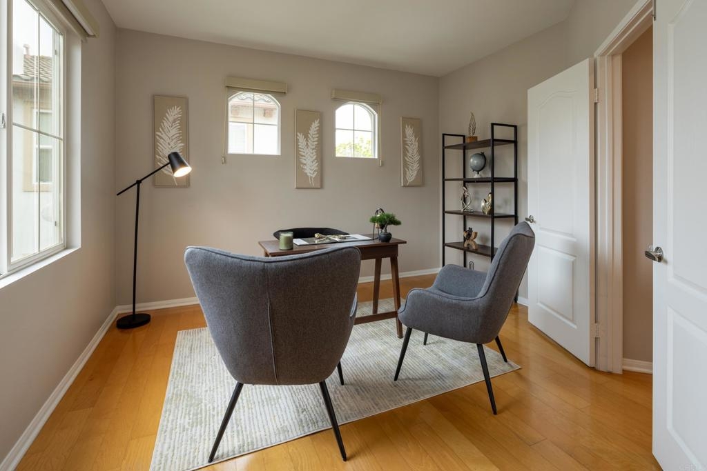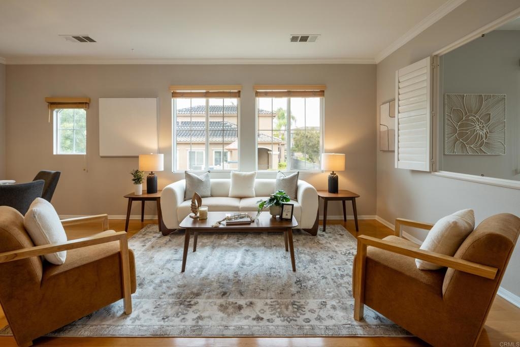 Offered at range $799,000 - $829,000 This light-filled, end-unit condo in Sabre Springs offers an open layout, resort-style amenities, and convenient access to everything San Diego has to offer. Featuring hardwood flooring and fireplace, the living room opens to the dining area and large covered balcony. The kitchen boasts granite countertops, stainless appliances, and breakfast bar. Spacious primary bedroom including walk-in closet and ensuite bath with dual vanity. An optional third bedroom, currently set up as an office, which is a perfect flexible space for a guest room, home gym, or nursery. Home is equipped with central AC and dual-pane windows. The attached two-car garage provides direct access into the home. Savannah Terrace community amenities include pool & spa, fitness center, sauna, tennis, basketball, clubhouse, and BBQ area. Set within the top-rated Poway Unified School District and close to hiking trails & parks. Within 20 minutes, enjoy Torrey Pines State Natural Reserve and some of the best beaches in San Diego.