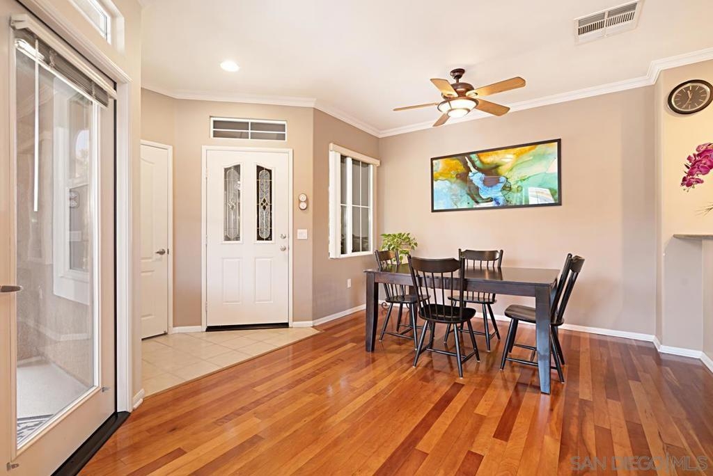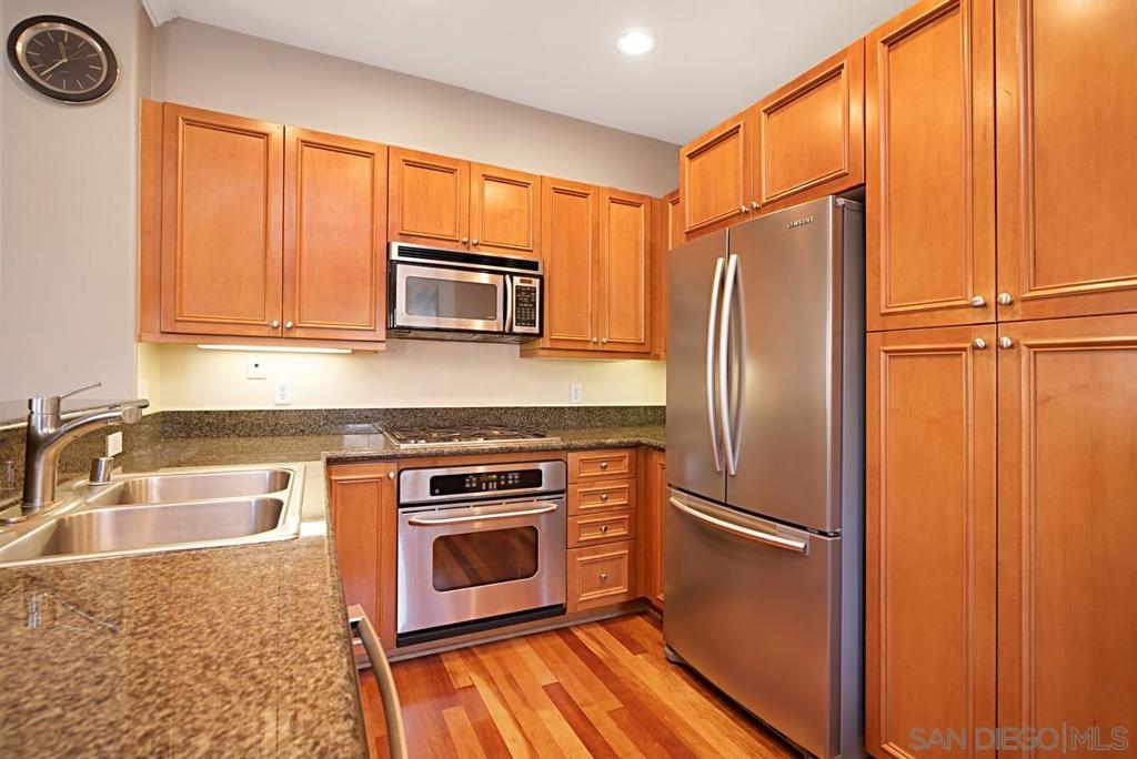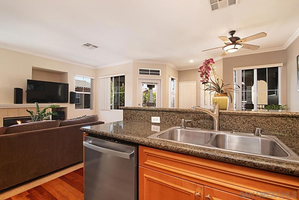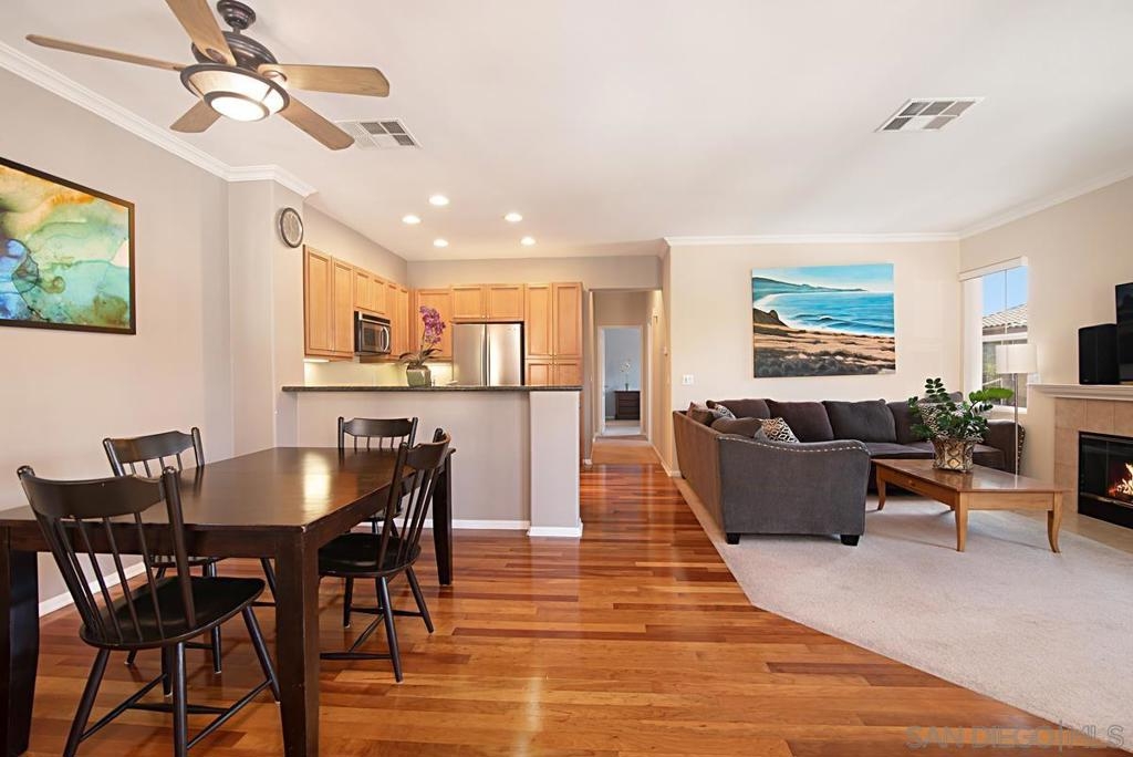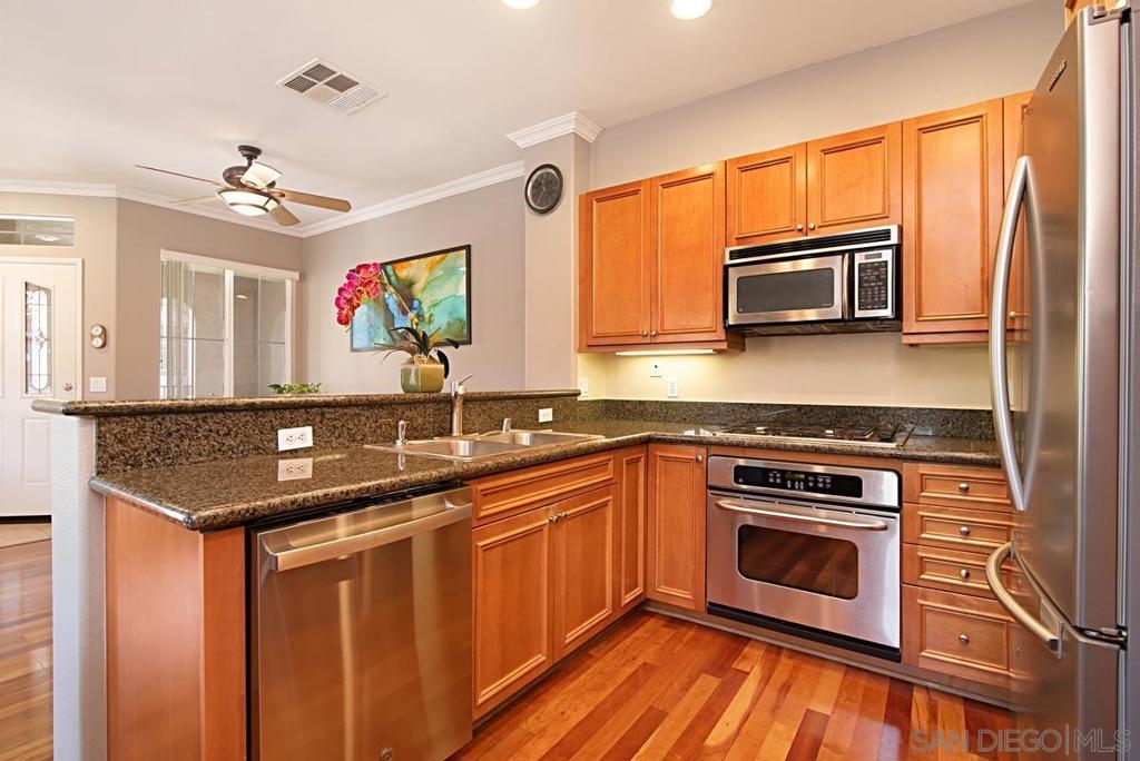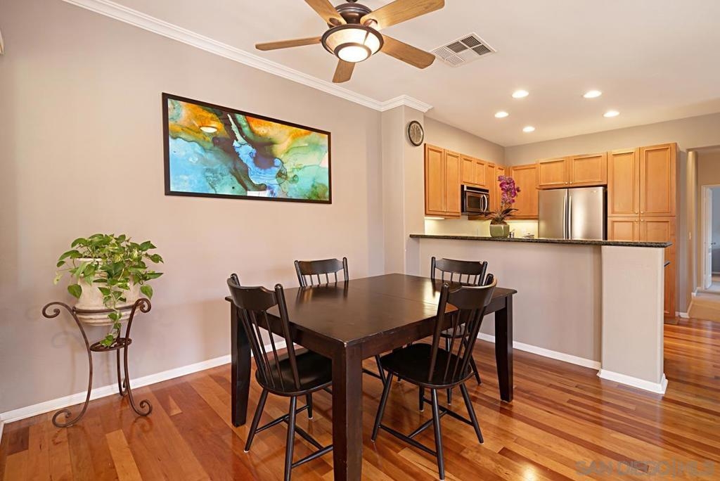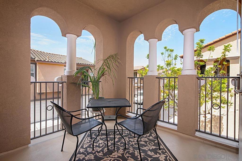 One of the best locations in Savannah Terrace. Two bedroom, two bath, in-unit washer and dryer with stainless steel appliances. Wood floors with a lot of storage and spacious closets. Large master bathroom with his and her sinks. Beautiful tree provides privacy on the balcony. The coveted Elisa Lane is the ideal location: quiet, situated between the club house amenities and neighborhood. A short 200 yards to Sabre Springs neighborhood park and ball fields, Van Dam Peak trail head for biking or hiking with ocean views, rare paved walking path along mountainside, across from Sabre Springs Market Place with Nutmeg Bakery. Unique amenities for a reasonable HOA: in the club house you get racquet ball court, gym, steam room, sauna, office, two large living rooms and outside you'll find basketball and tennis courts, spacious pool and hot tub, children's playground and a large grilling area with outdoor fireplace. There's even a guest suite you can rent so visitors don't cramp your style! With a short 6 minute drive, you're in PQ, Carmel Mountain, Scripps Ranch or Poway.
