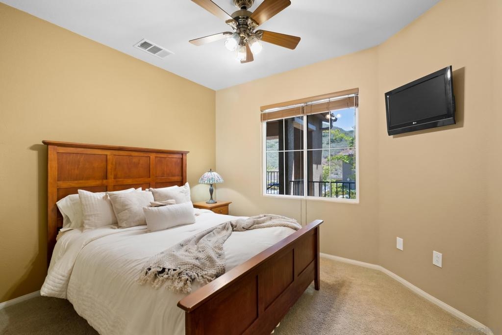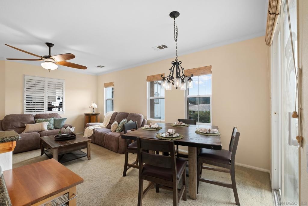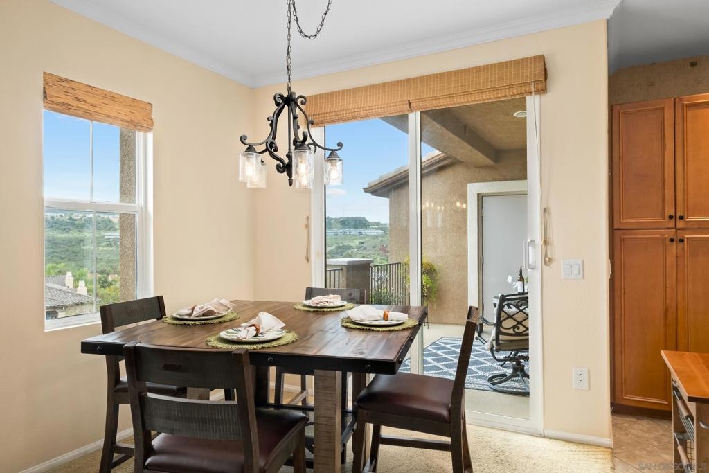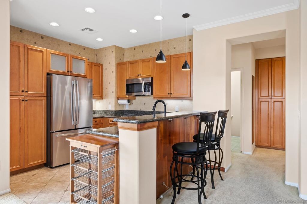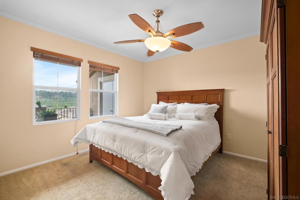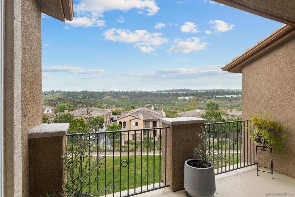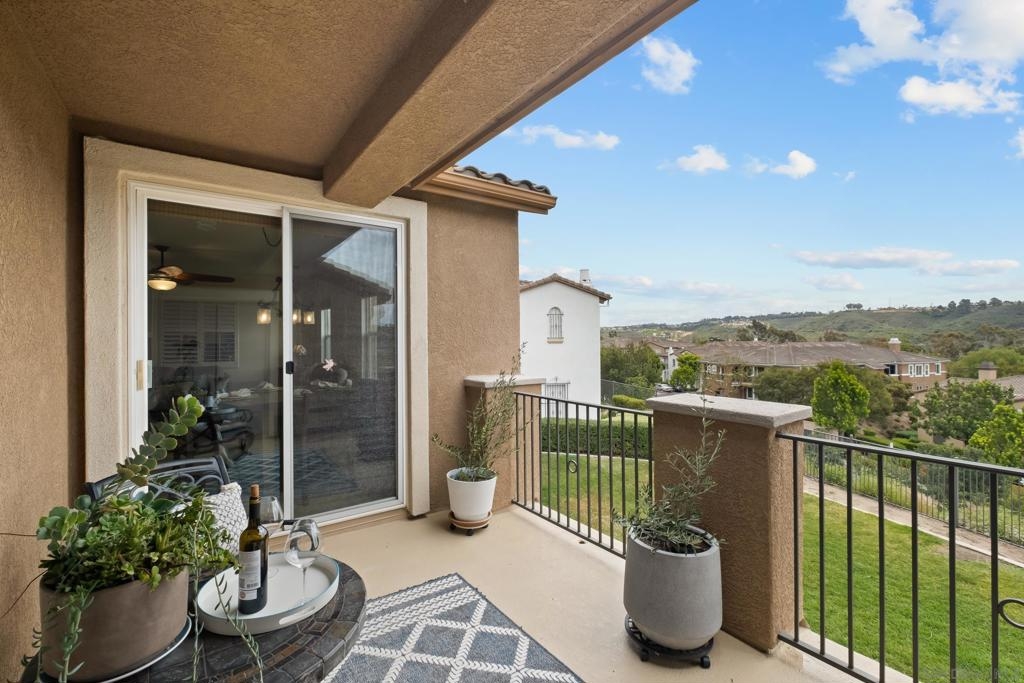 Welcome to Savannah Terrace at Sabre Springs! Bright and airy upper-level corner condo in a serene, tree-lined community. This 3-bedroom, 2-bath home offers 1,260 sq ft of refined living space, featuring elegant travertine floors, crown molding, and a gourmet kitchen with granite countertops and stainless steel appliances. Enjoy an open-concept layout that flows to a private balcony with tranquil hillside views—perfect for morning coffee or evening unwinding. The spacious primary suite boasts walk-in closet and an en-suite with double vanities. Additional highlights include a 2-car attached garage, brand-new AC (April 2025), and 2 additional bedrooms providing flexibility for family, guests or home office! Tucked on a cul-de-sac with no through traffic, this quiet community offers pickleball, basketball, and handball courts, along with a pool, spa, clubhouse, and greenbelts. All within the sought-after Poway Unified School District, with easy access to I-15, shopping, dining, and scenic trails.