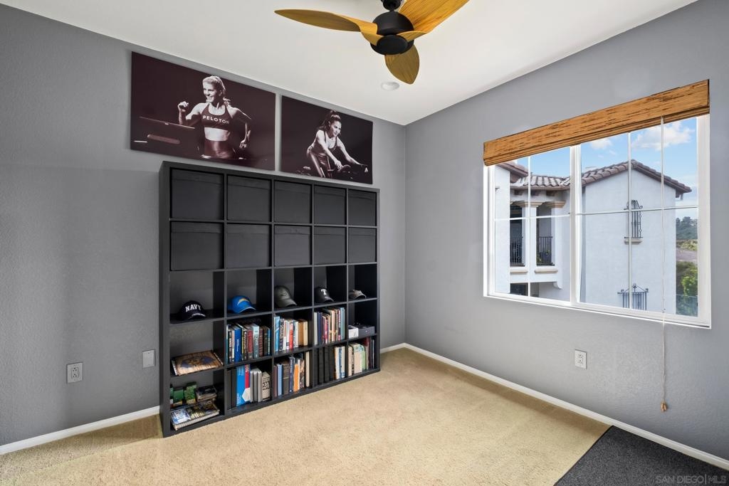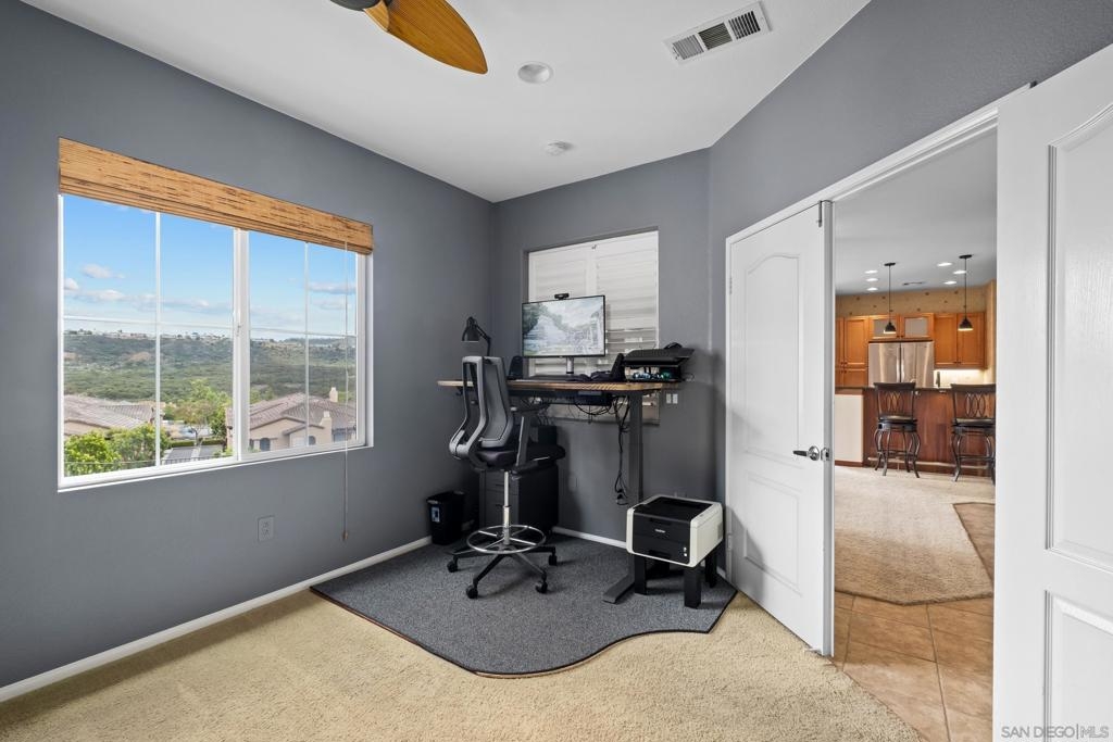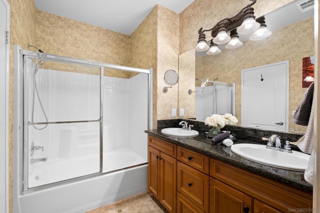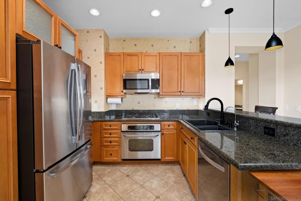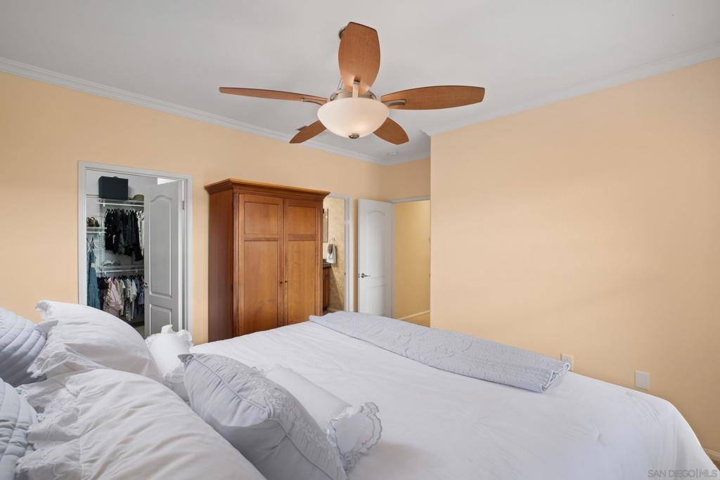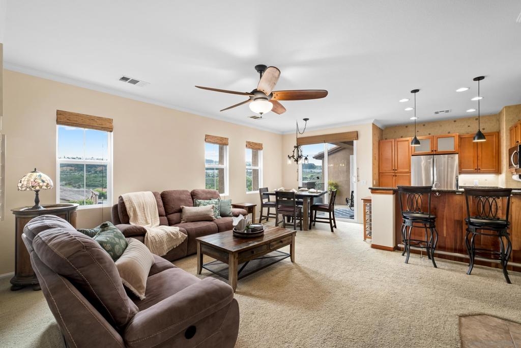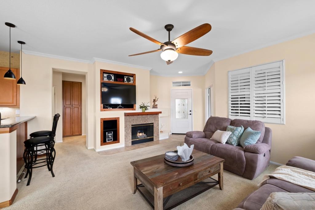 Welcome to Savannah Terrace at Sabre Springs! Bright and airy upper-level corner condo in a serene, tree-lined community. This 3-bedroom, 2-bath home offers 1,260 sq ft of refined living space, featuring elegant travertine floors, crown molding, and a gourmet kitchen with granite countertops and stainless steel appliances. Enjoy an open-concept layout that flows to a private balcony with tranquil hillside views—perfect for morning coffee or evening unwinding. The spacious primary suite boasts walk-in closet and an en-suite with double vanities. Additional highlights include a 2-car attached garage, brand-new AC (April 2025), and 2 additional bedrooms providing flexibility for family, guests or home office! Tucked on a cul-de-sac with no through traffic, this quiet community offers pickleball, basketball, and handball courts, along with a pool, spa, clubhouse, and greenbelts. All within the sought-after Poway Unified School District, with easy access to I-15, shopping, dining, and scenic trails.