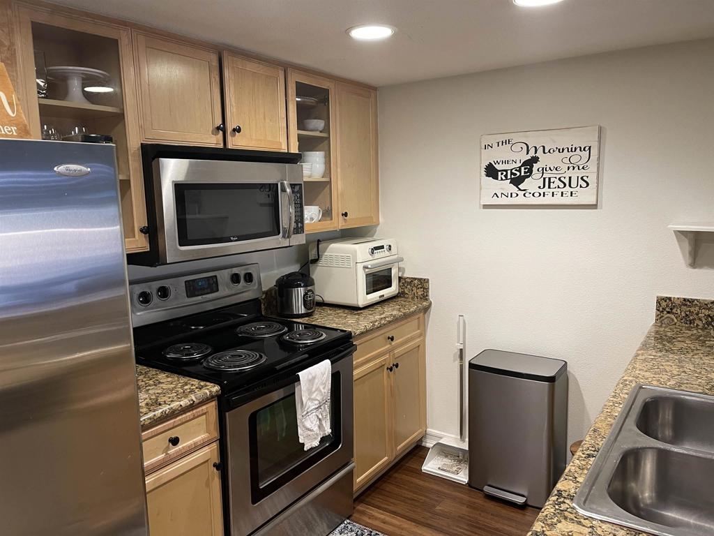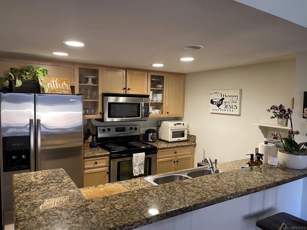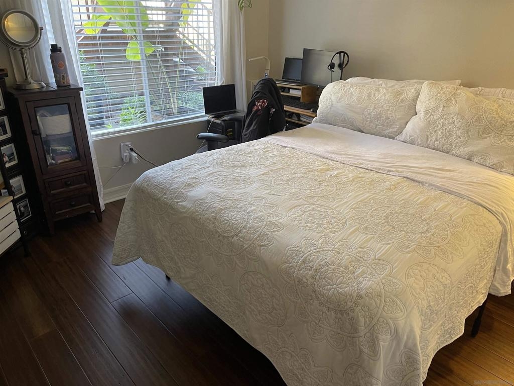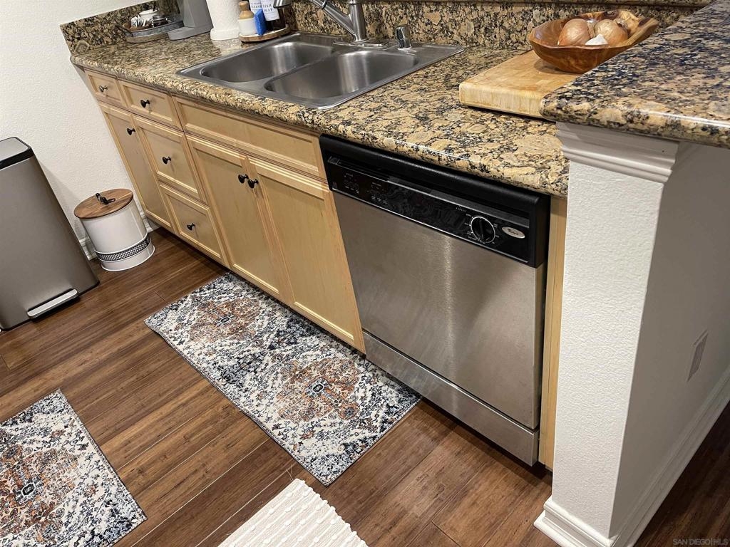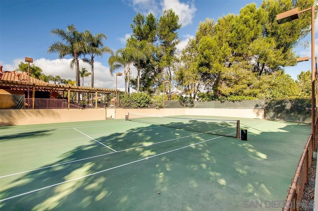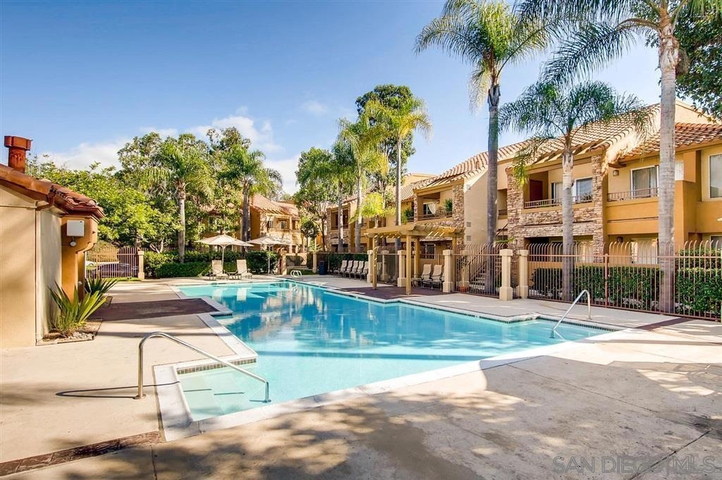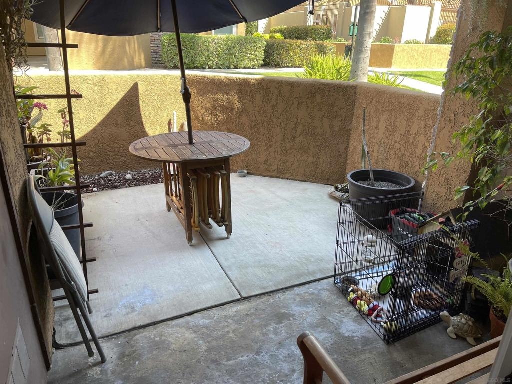 Centrally located 1 bedroom condo in Rancho Bernardo. Kitchen has beautiful granite countertops and updated cabinets, even has real wood bamboo flooring. This home has central air and heat and enjoy the large front partially enclosed patio for relaxing and room enough for a dog to play while you are BBQ'ing. The refrigerator, washer and dryer conveys with the property. Close to shopping and freeways. This complex has one of the lower HOA dues around and has a lot of amenities such as pool, spa, BBQ, gym, tennis court, clubhouse and playground. Home is wired for security with sensors and motion detectors.