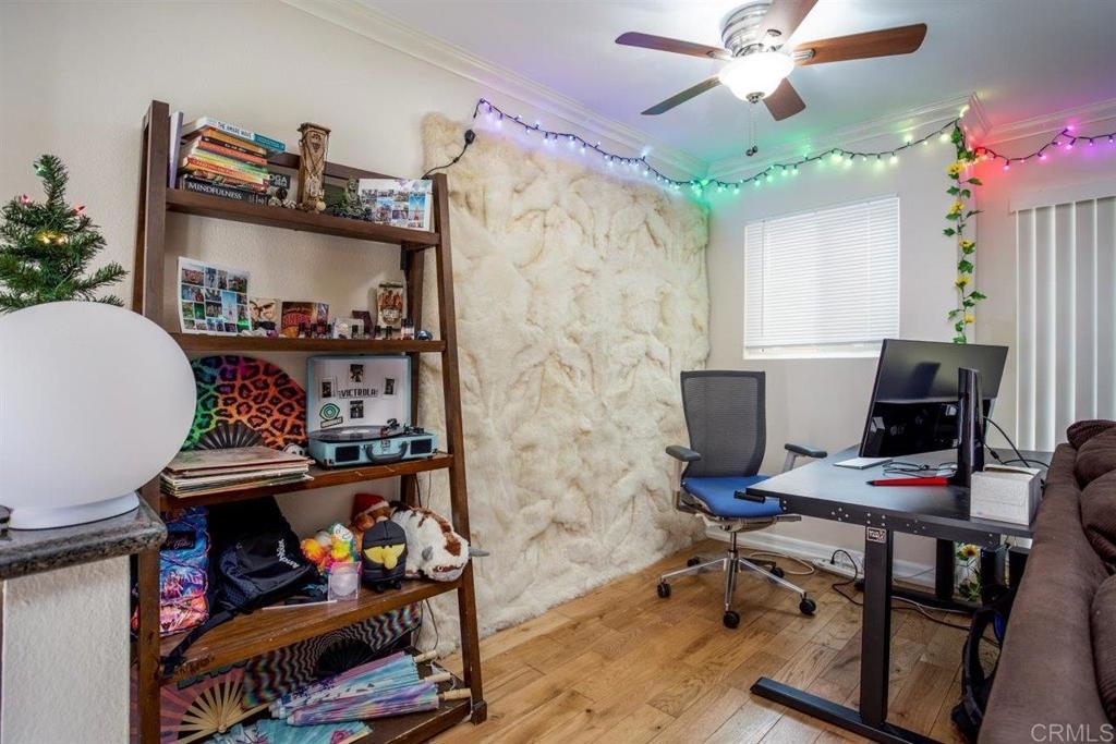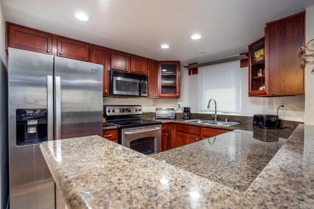 Topnotch Entry level End Home Opportunity! This one Bedroom Unit is Spacious and Bright with an Open Floor Plan, Hardwood Floors, Crown Molding, Very Nice Kitchen with SS appliances and plenty of Quality Cabinetry, Dual Pane Windows, Laundry Closet with Newer Washer and Dryer Units. Brand New Modern Bathroom, Large Bedroom has Walk in closet. Living area is Sizable that opens up to a Generous Patio for an Outdoor Garden/Sitting Space in a Private region of the complex. The Villa Taviana community offers Resort Style Living with Clubhouse, pool, BBQ, Tennis Courts, and a Fitness Center! Centrally located in San Diego to enjoy all our County has to offer. Poway School District!