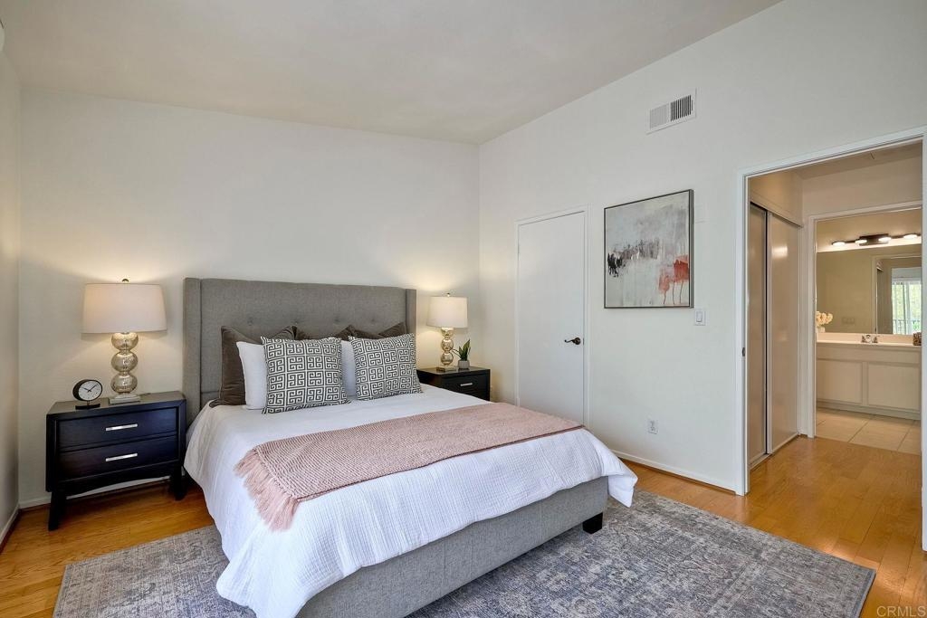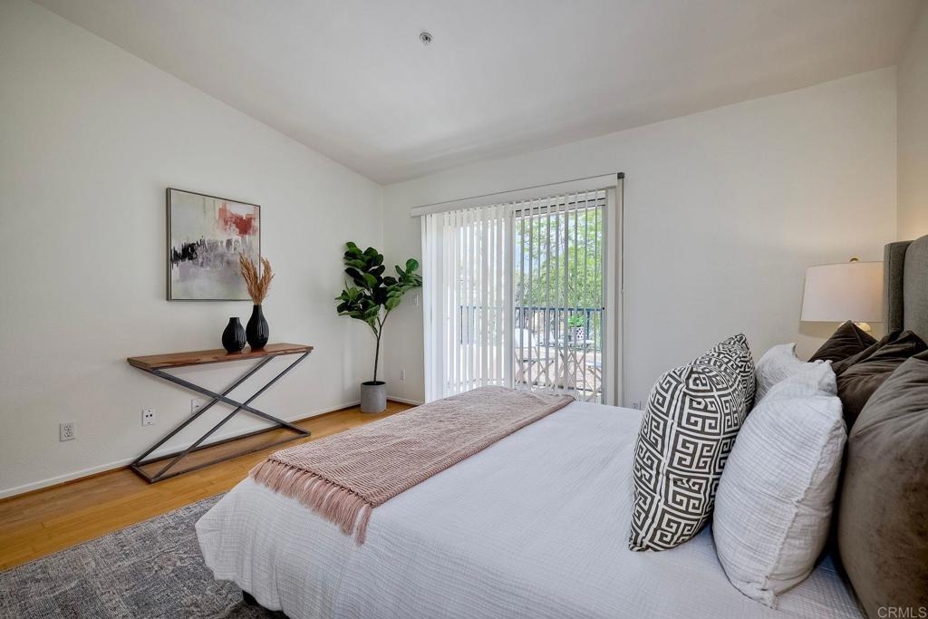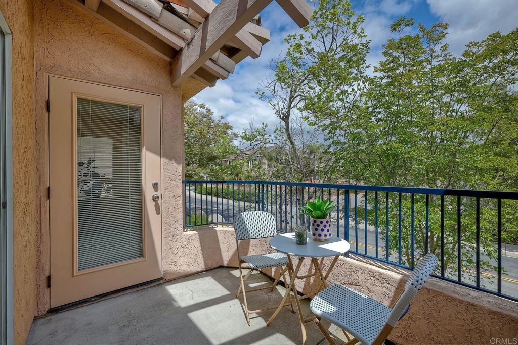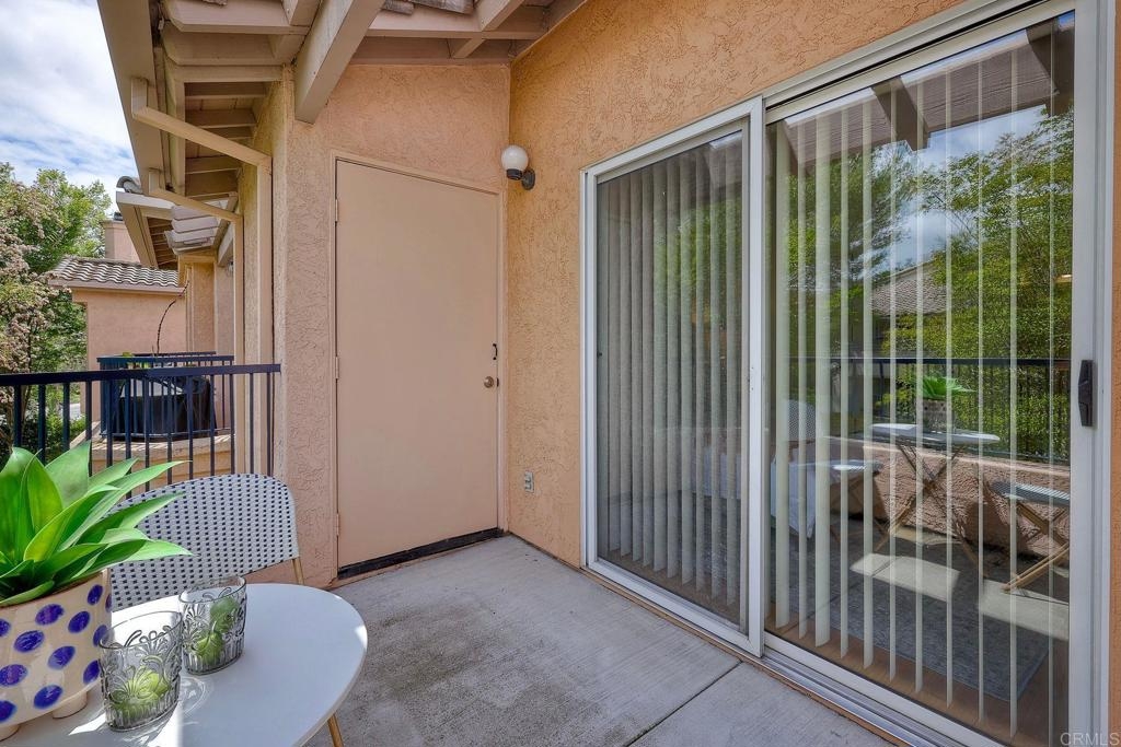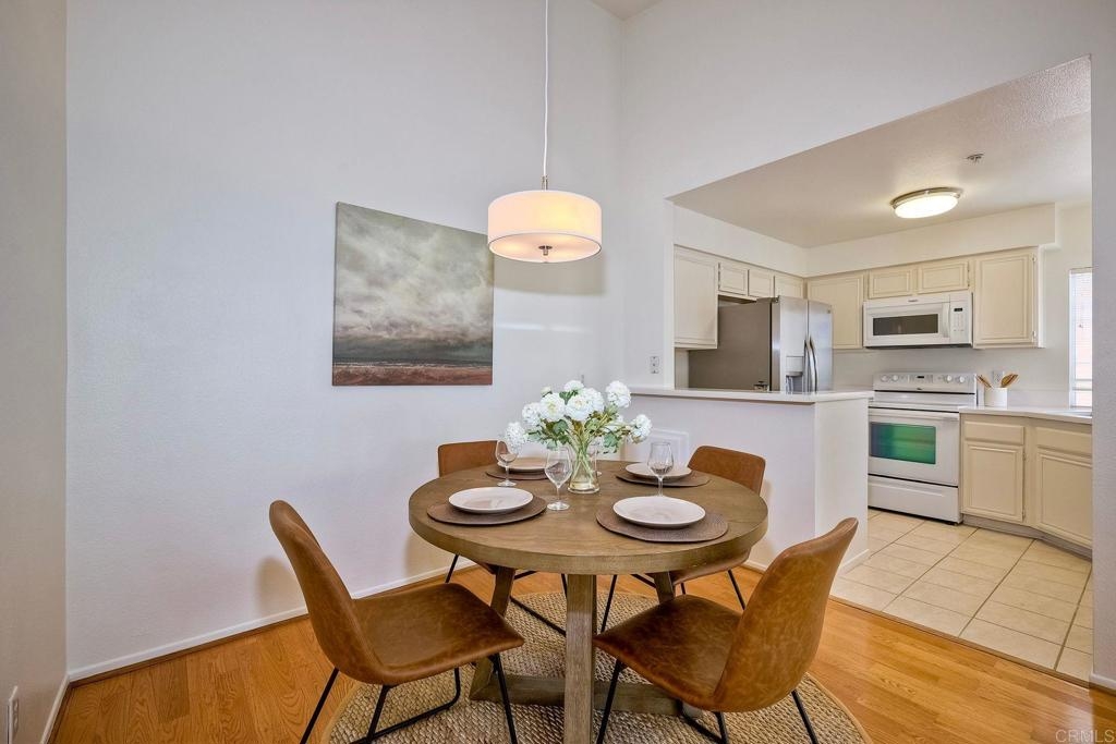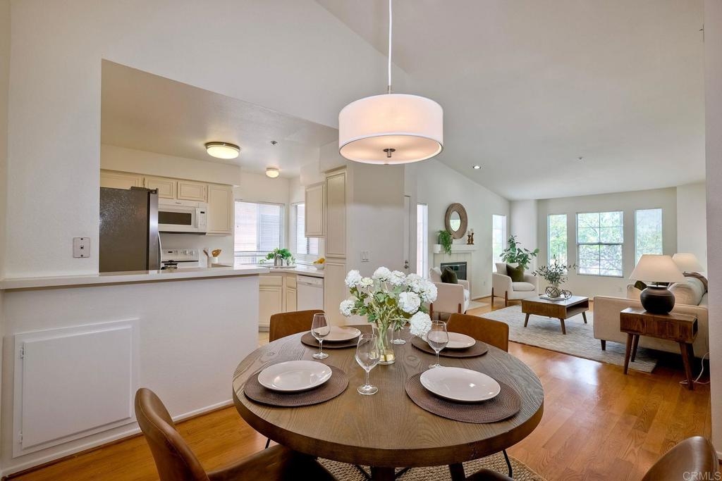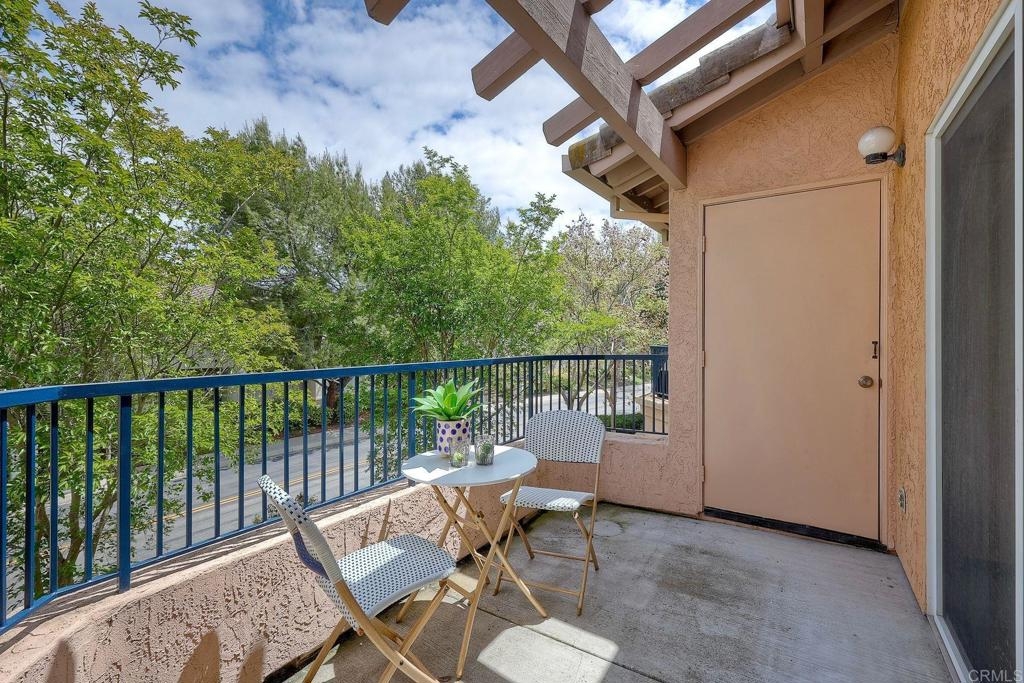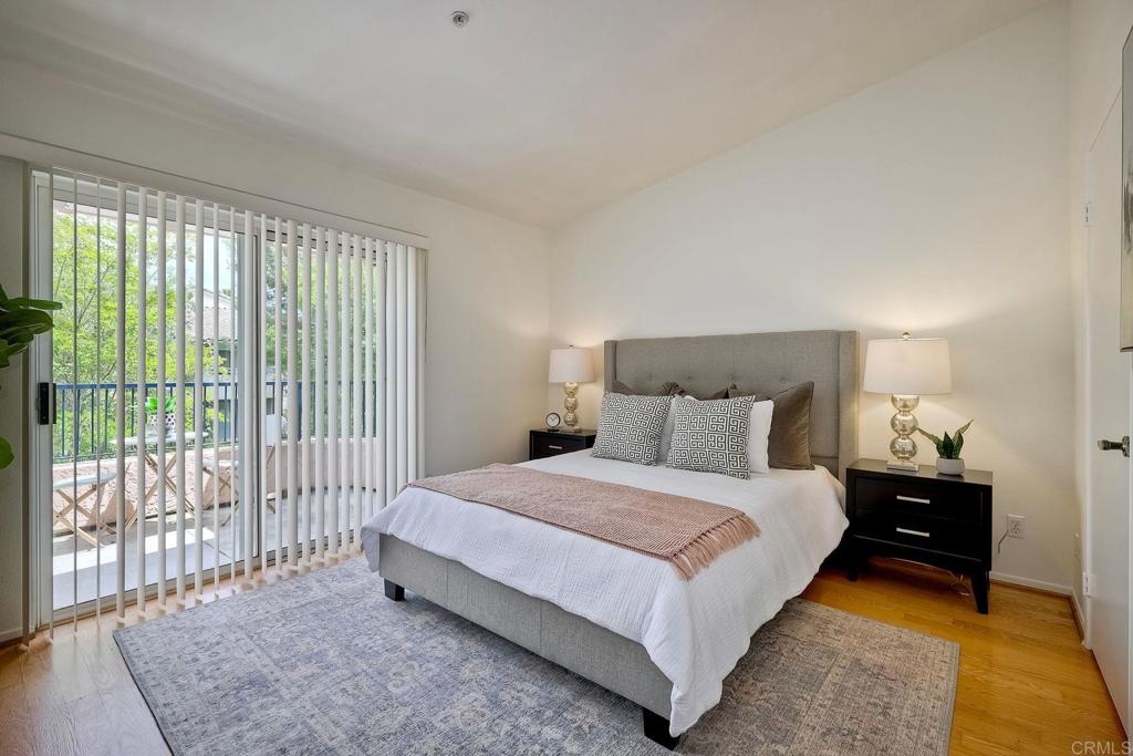 Enjoy resort-style living in beautiful home located in the desirable gated community of Bernardo Vista del Lago. Upstairs unit has expansive vaulted ceilings and tons of natural light! Gorgeous wood floors throughout the living room, dining area & spacious bedroom with walk-in closet. Access your private patio from the living room or your bedroom, and large storage closet on patio. In the hallway you'll find a full sized washer & dryer, and they convey along with the refrigerator. Interior of home was just repainted and new AC installed in 2022. Home includes an oversized private garage with extra space for storage, where many only have an assigned spot in the carport. Additionally there is ample guest parking. The amenities are stupendous with 2 pools, tennis courts, an exercise room, billiard room & clubhouse. Conveniently located just off I-15, and 1 exit from the Westfield Escondido Mall with great restaurants. Explore nearby biking & hiking trails of Lake Hodges. HOA includes water & trash, exterior maintenance & all amenities.