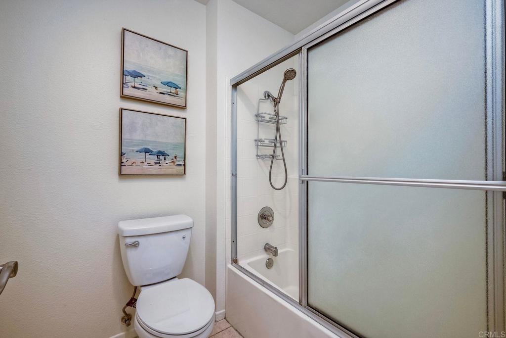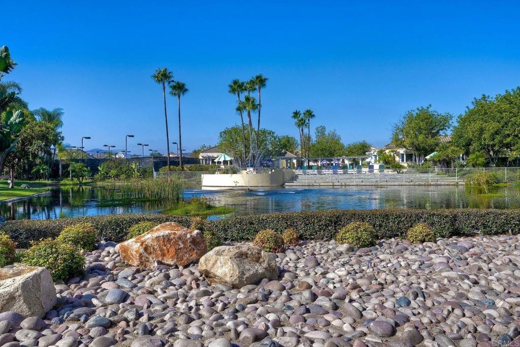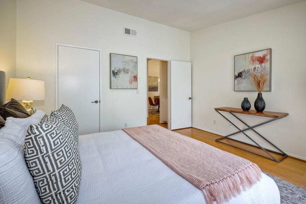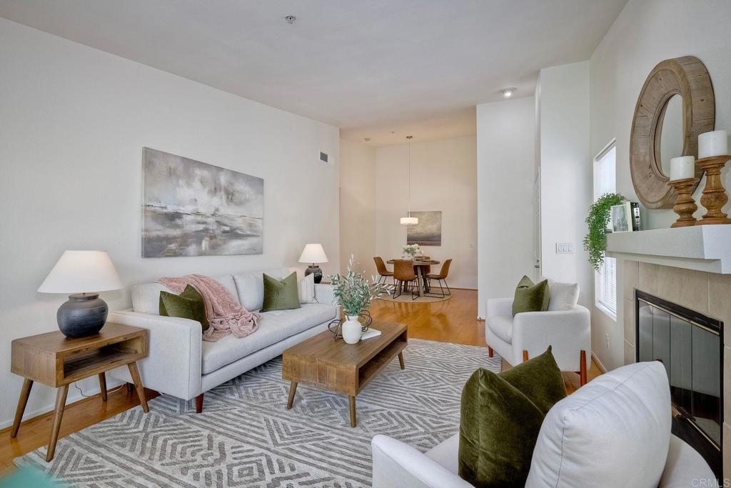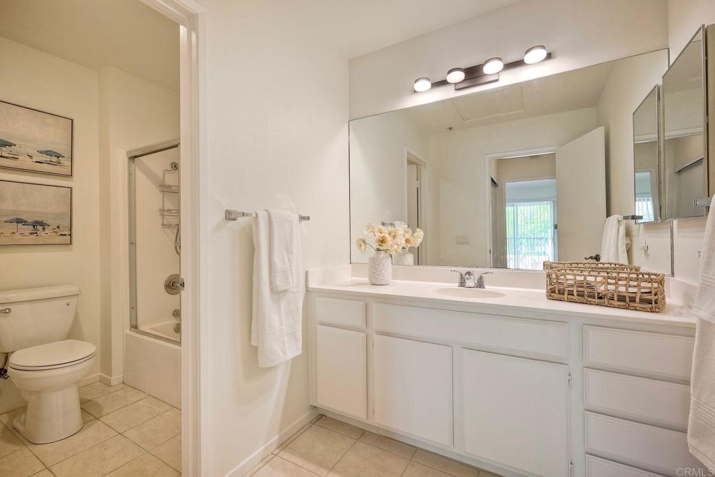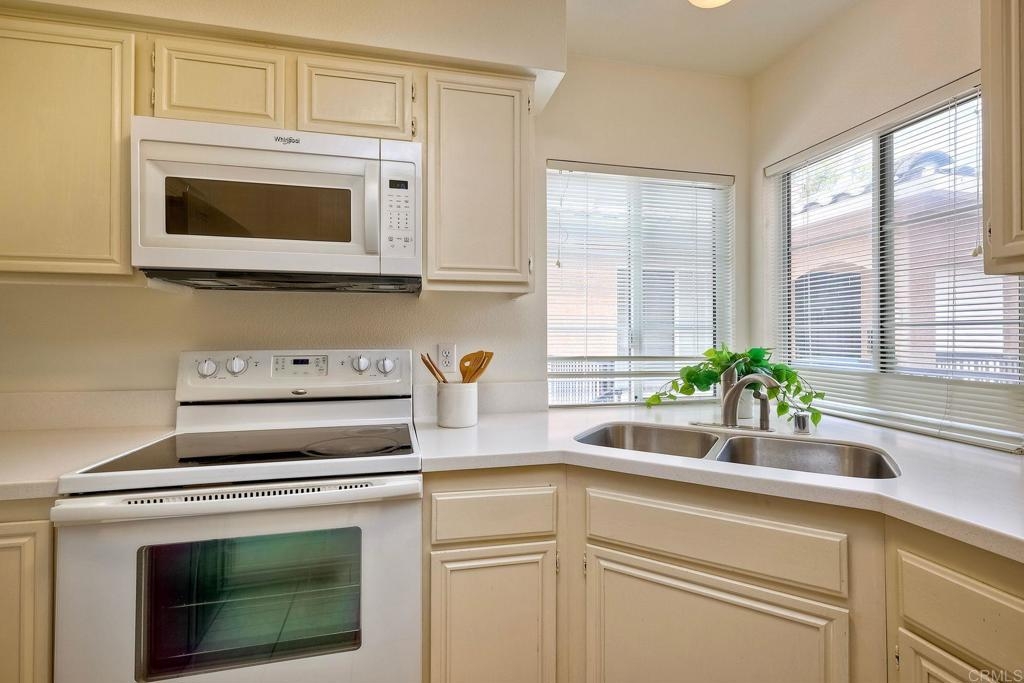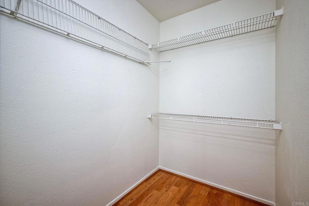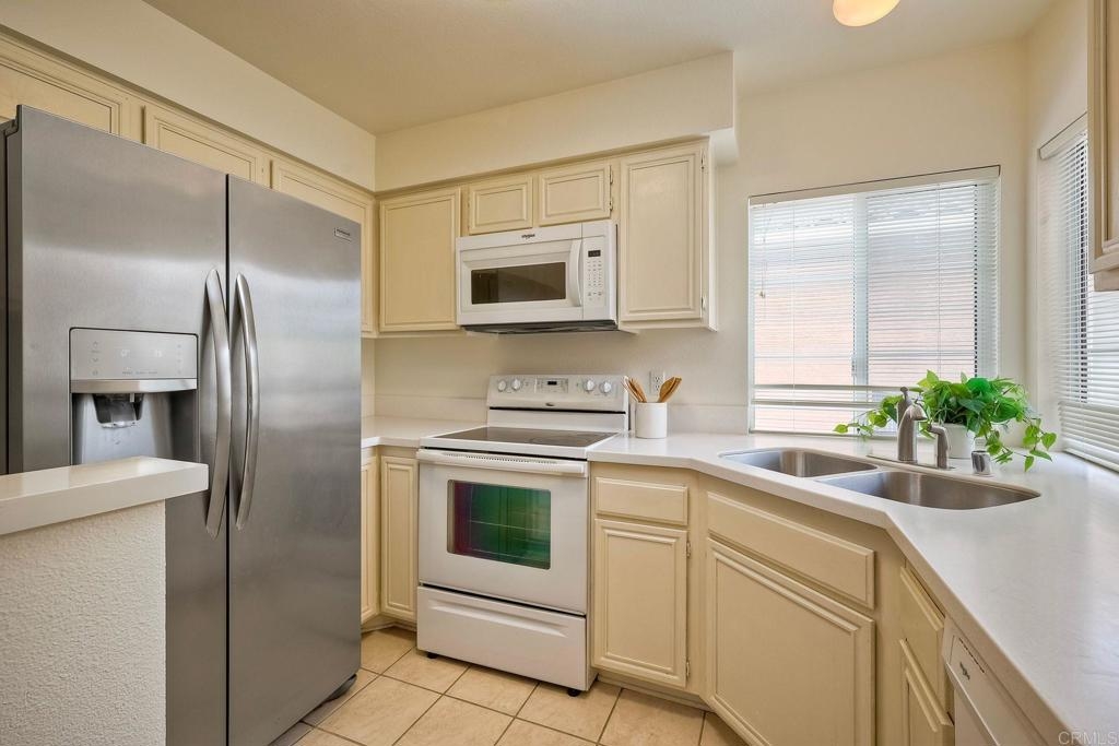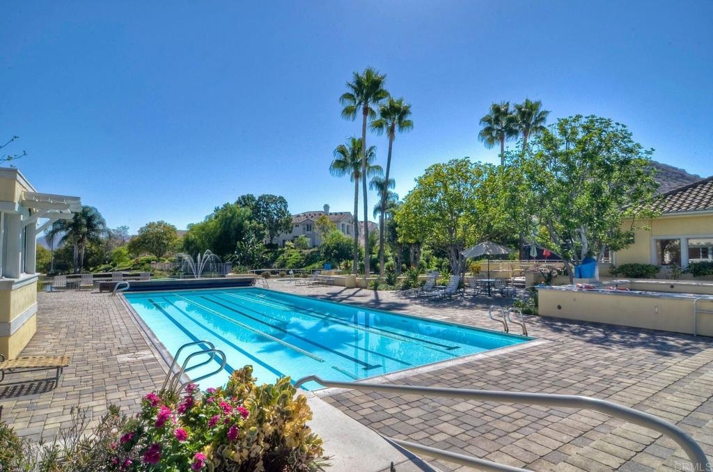 Enjoy resort-style living in beautiful home located in the desirable gated community of Bernardo Vista del Lago. Upstairs unit has expansive vaulted ceilings and tons of natural light! Gorgeous wood floors throughout the living room, dining area & spacious bedroom with walk-in closet. Access your private patio from the living room or your bedroom, and large storage closet on patio. In the hallway you'll find a full sized washer & dryer, and they convey along with the refrigerator. Interior of home was just repainted and new AC installed in 2022. Home includes an oversized private garage with extra space for storage, where many only have an assigned spot in the carport. Additionally there is ample guest parking. The amenities are stupendous with 2 pools, tennis courts, an exercise room, billiard room & clubhouse. Conveniently located just off I-15, and 1 exit from the Westfield Escondido Mall with great restaurants. Explore nearby biking & hiking trails of Lake Hodges. HOA includes water & trash, exterior maintenance & all amenities.