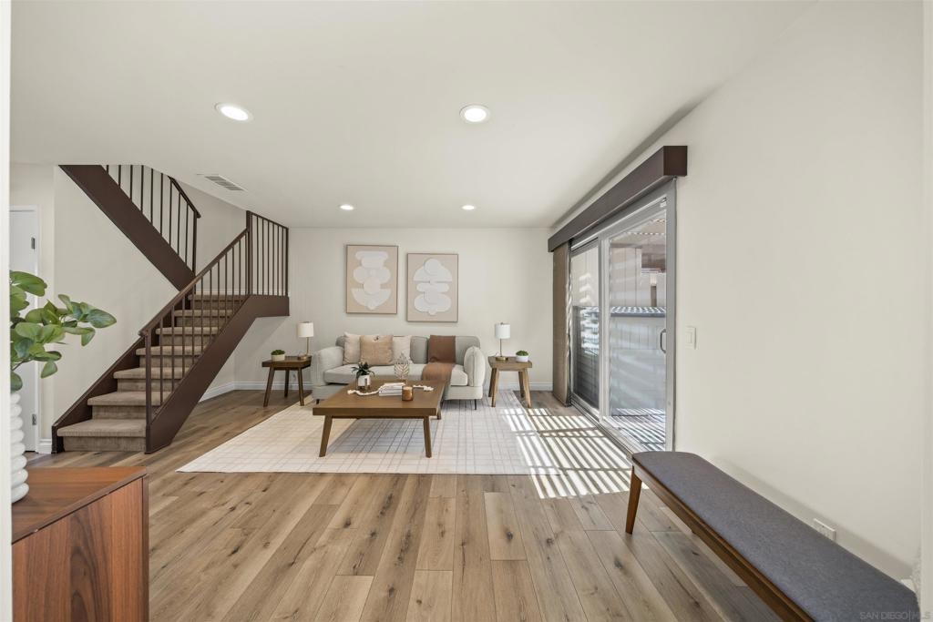 Beautiful home with tons of natural lighting & stunning views. Complete with 3 bed, 2.5 bath and sophisticated finishes: wood flooring downstairs, carpet upstairs, recessed lighting throughout, freshly painted home. Upon entrance into the gate, you are greeted by a private patio great for entertaining and safe space for kids to play. Then entering into the home, you are greeted by a large living room, kitchen with stainless steel appliances, newer fridge, granite countertops, large cabinets. Newer washer & dryer in its own enclosed area, large enough for additional storage - leading to the 1/2 bath. Going up the stairs are all the bedrooms and full baths. Large primary bedroom with expansive closets (his & hers) and bathtub shower. Home also offers:newer AC and water heater. HOA includes water, community pool, tennis courts! Conveniently located right off freeways, highly rated and desirable schools in the Poway Unified school district, restaurants, shopping, parks & much more.