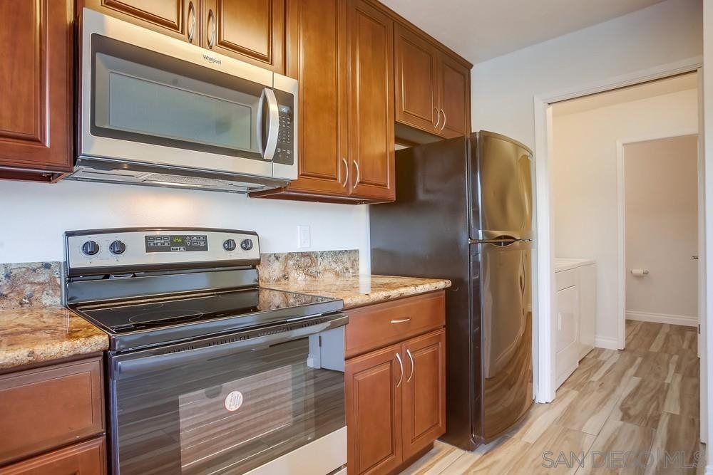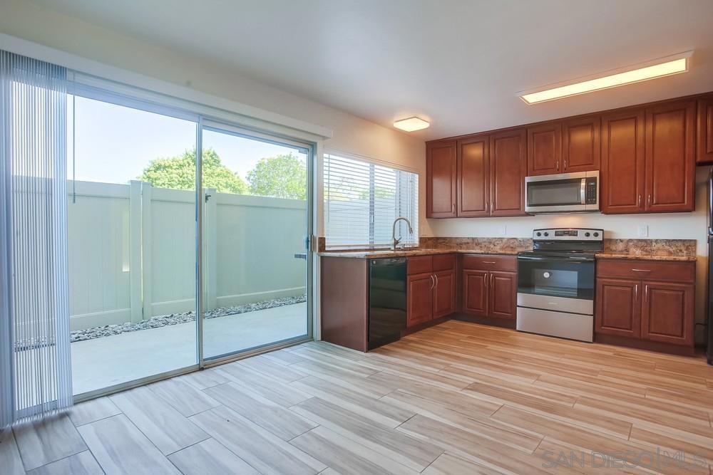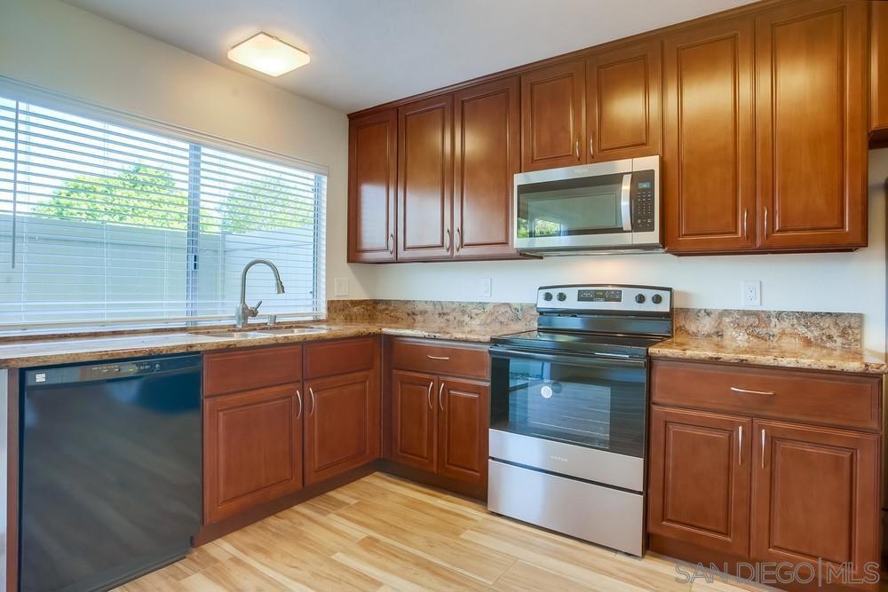 Bright and open with large windows and fresh interior paint, this well maintained two story unit has hard flooring throughout. Kitchen boasts granite counters, new stove and built in microwave, with plenty of storage. Both upstairs bedrooms have mirrored closet doors. Cool A/C plus wall unit. Convenient laundry room with overhead cabinets, private patio and detached garage.