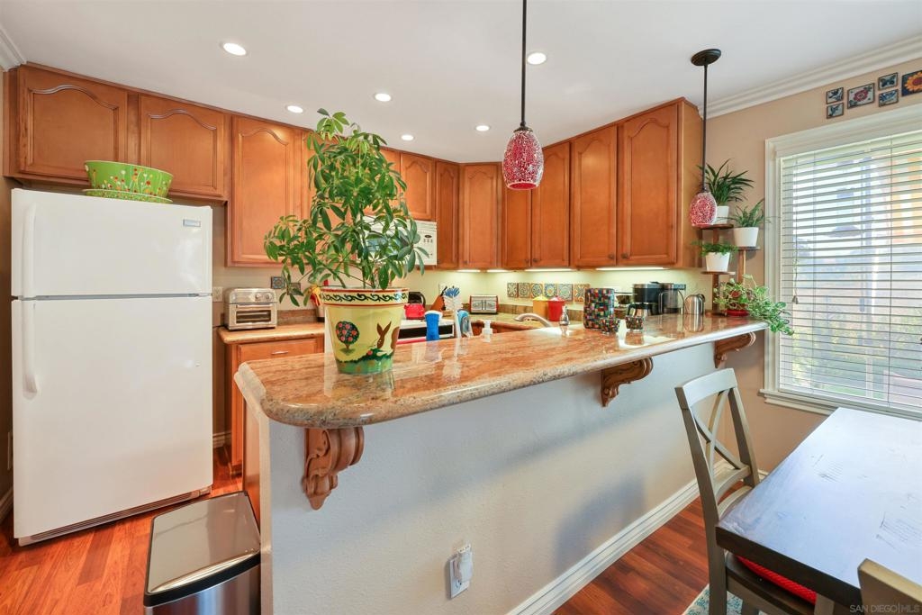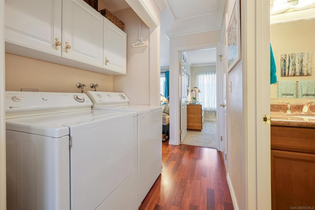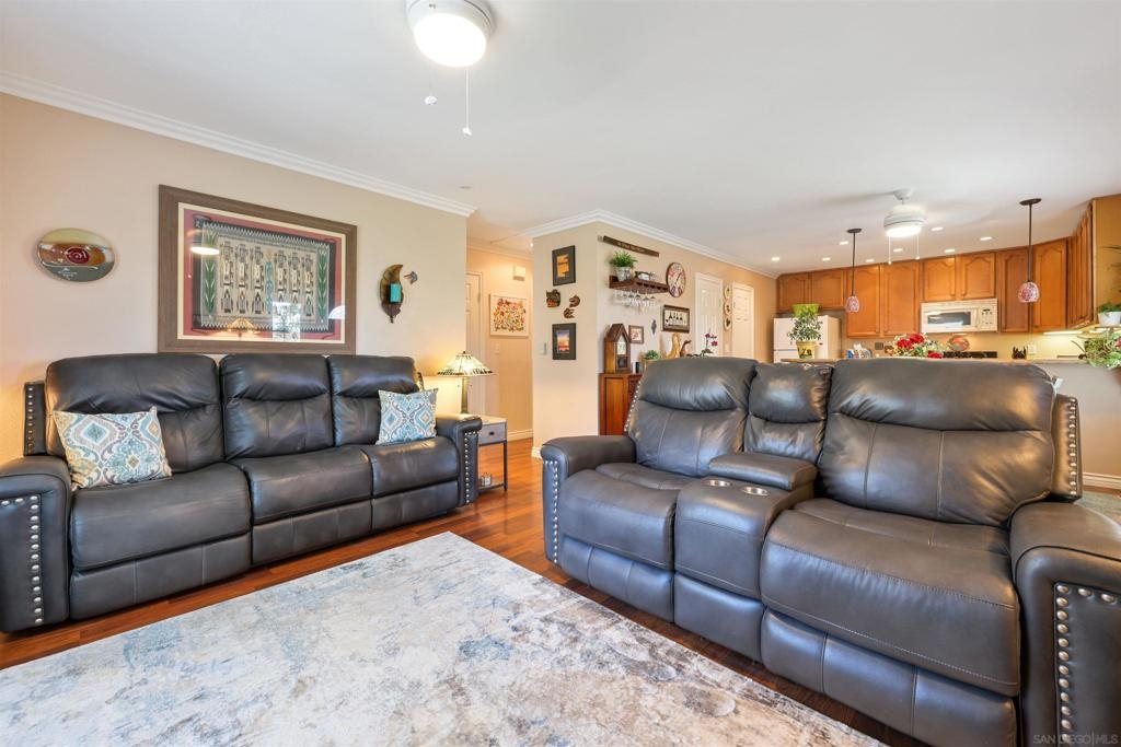 Welcome to this extremely RARE single story end unit in the Poway Unified School District! This move in ready condo has in-unit washer/dryer, garage parking, and private front yard area perfect for dogs or relaxing. Upgrades to this property include new ceiling fans, recessed lighting, crown molding, soft close drawers, laminate flooring, and more! Complex is conveniently located close to local shopping, freeways, and the highly rated schools. Here's your opportunity! VA Approved. Equipment: Dryer,Garage Door Opener, Washer Sewer: Sewer Connected Topography: ,LL