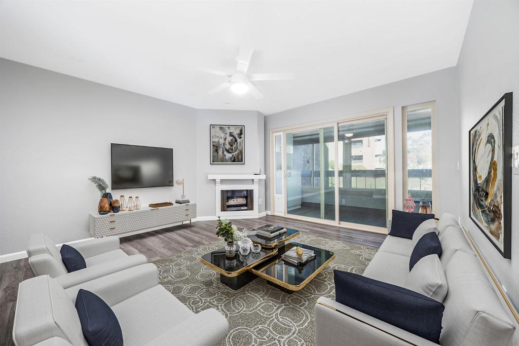 Completely upgraded 2 BR condo at Mission Ridge in Mission Valley. . Custom Kitchen with Corian counters, tile backsplash, beautiful cabinetry with lots of pull outs and many extra cabinets. Lots of counter space. Stainless steel appliances, pendant and recessed lighting. Large living room w/fireplace that leads to an enclosed balcony w/custom lighting and built ins overlooking the greenbelt. Living Room with gas fire place, ceiling fan/light. Bathrooms with custom showers, custom lighting, pedestal sinks. Vinyl Plank Flooring throughout. No expense spared. Nice sized bedrooms with plantation shutters, overlooking the greenbelt. Extra storage cabinets built in under the windows. Partially carpeted bedrooms, and vinyl plank floors. Master closet with built ins and a second closet too. Inside laundry and common laundry room. Covered assigned parking. Complex features tennis, pool, fitness room. Centrally located. Close to Snapdragon Stadium, shopping, Restaurants. Minutes to the I-8, and I-15 freeways. Minutes to the trolley, easy commute downtown, 15 minutes to the beach. When you show this unit, you and your clients will be very impressed with the upgrades.