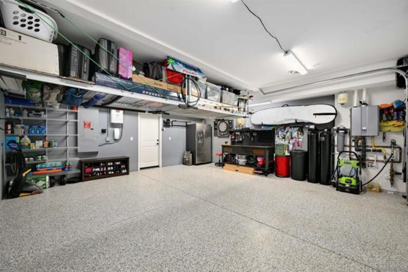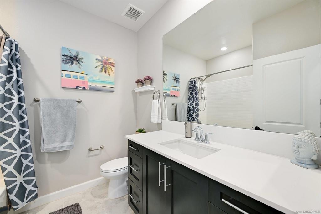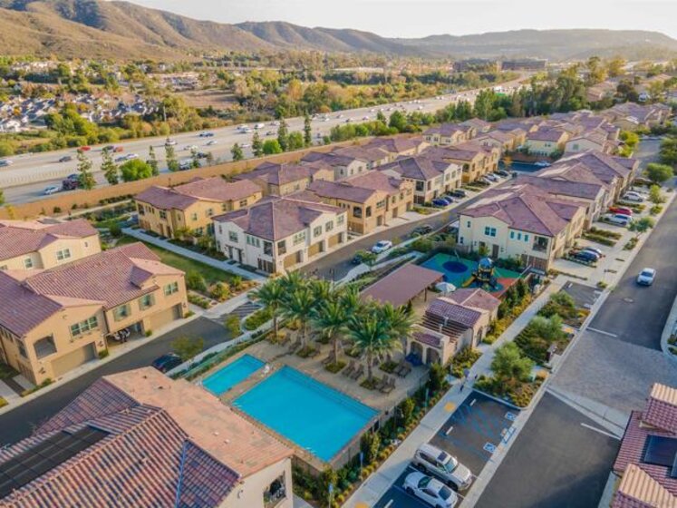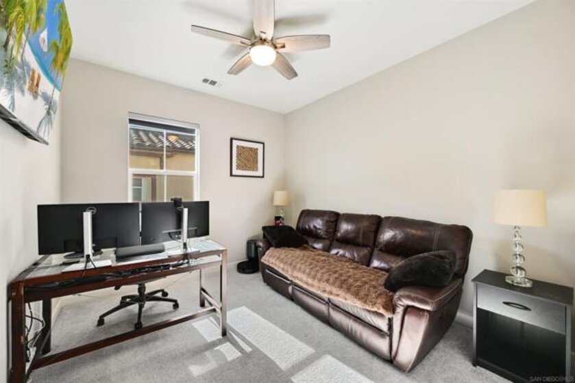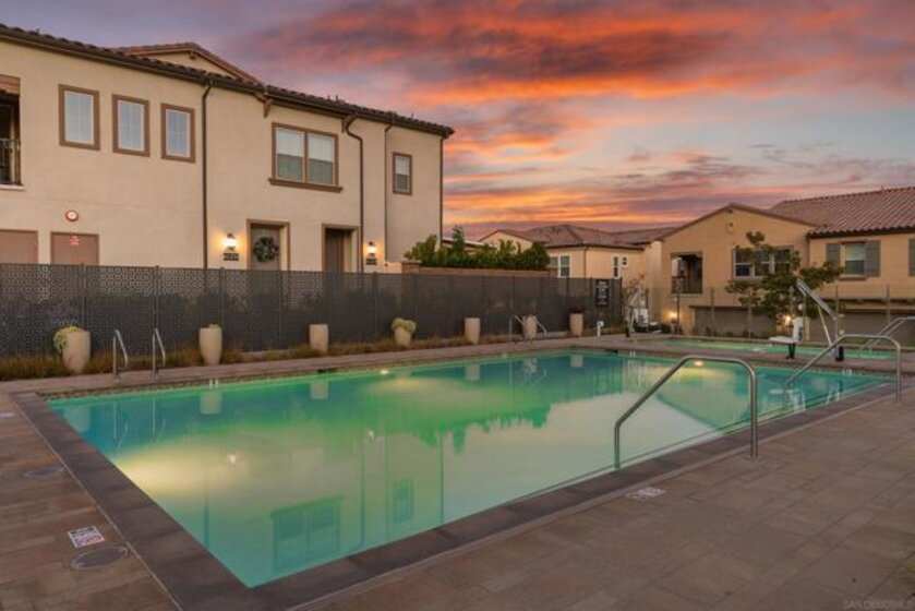 Enjoy outstanding long-term savings with 16 fully paid-off solar panels, no Mello-Roos, and a low property tax rate—rare financial advantages paired with luxury living in this beautifully upgraded 2019 townhome located in the highly desirable Pavilion development of Pacific Village. Designed for efficiency and comfort, the home also includes a tankless Rinnai water heater, dual Tesla Wall Connectors, full-house water softener, and reverse osmosis drinking water system. Situated on one of the community’s best lots, this quiet interior location offers no road or highway noise and sits just steps from the resort-style pool, spa, playground, and oversized community fire ring. Unlike most units, the backyard has no neighbor directly behind—separated by Blake Way—creating an open feel with scenic mountain views and exceptional privacy. A full private driveway and desirable two-story floor plan give this home the feel of a detached residence. Inside, the bright great-room layout features spacious living and dining areas flowing into the chef’s kitchen with quartz countertops, stainless steel appliances, upgraded cabinetry, and a large center island—perfect for entertaining. High-end finishes include soaring 10-foot ceilings, premium luxury vinyl plank flooring, and plush designer carpet. The primary suite showcases a custom barn door, with thoughtful upgrades throughout. Smart-home features include Lutron switches, automated blinds, motion sensors, Alexa integration, Ecobee thermostat, smart appliances, and a Ruckus Wi-Fi mesh system with CAT-6A wiring in every room. The finished garage offers epoxy floors, overhead storage, and a smart LiftMaster opener with battery backup. The private backyard is a true retreat with gazebo, artificial turf, custom pavers, and low-maintenance landscaping—ideal for relaxing or entertaining. Ideally located near shopping, dining, freeways, and highly regarded Poway schools, this home delivers exceptional value, privacy, and modern convenience.