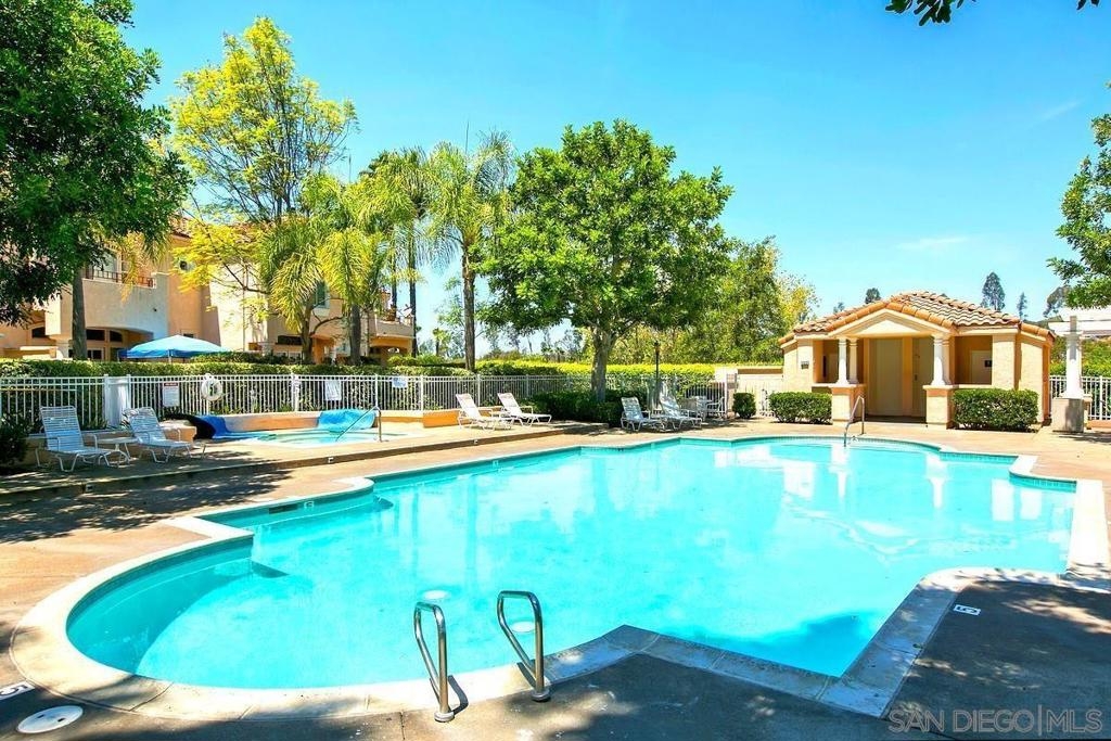 Bright and inviting 2-bedroom, 2-bath first-floor home in Belsera with 10’ ceilings and solid-surface floors through much of the space. Living room offers a cozy fireplace and smooth flow into dining area and updated kitchen with brand-new stainless appliances. Primary bedroom includes a walk-in closet and en-suite bath with double-sink vanity. Second bedroom works well for guests or a home office. Updated kitchen and main bath add to the move-in-ready feel. Attached 1-car garage, assigned parking space, and nearby guest parking provide convenience. Belsera amenities include pools, spas, volleyball court, and BBQ areas. Walking trails, nearby shops, and local restaurants support an easy outdoor lifestyle in Tierrasanta.