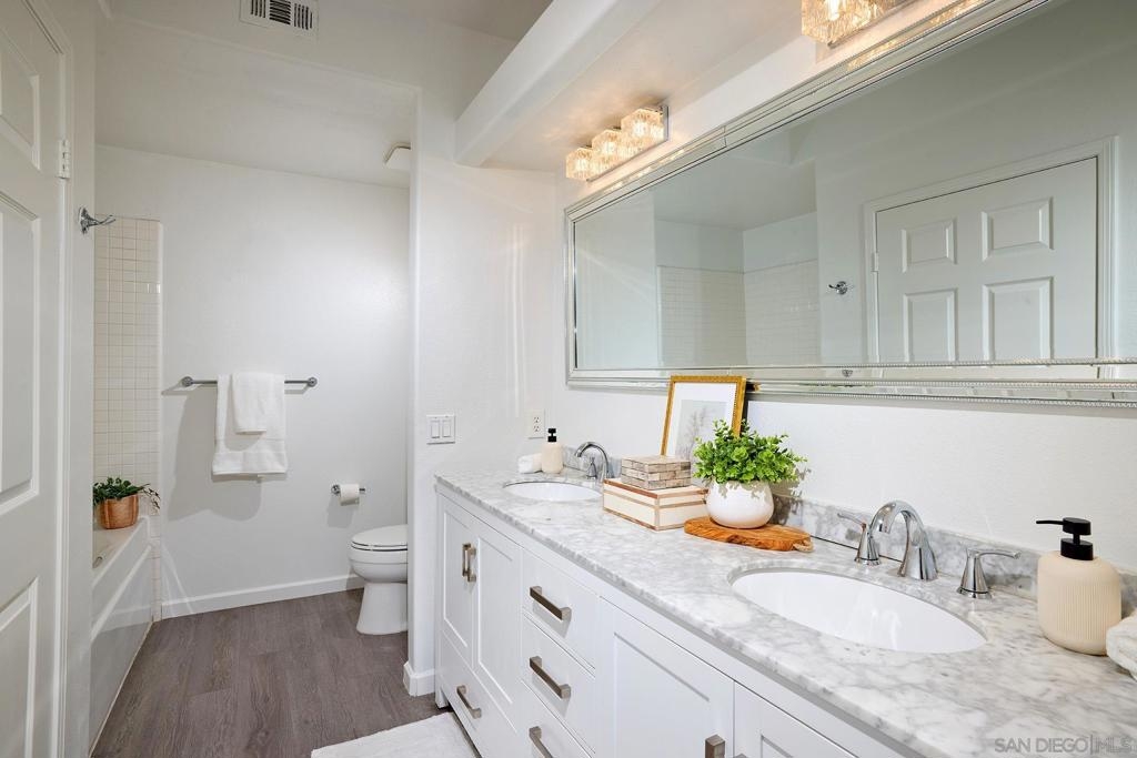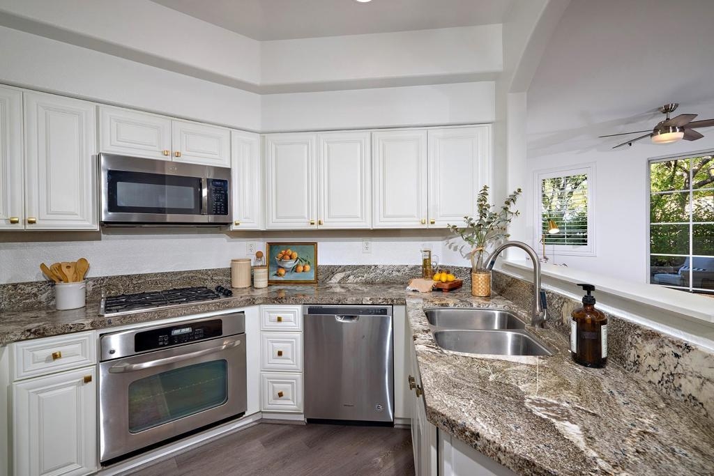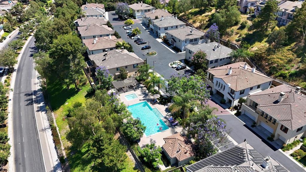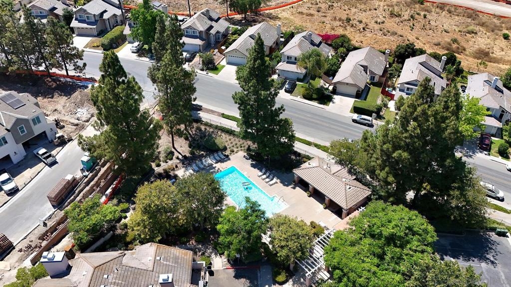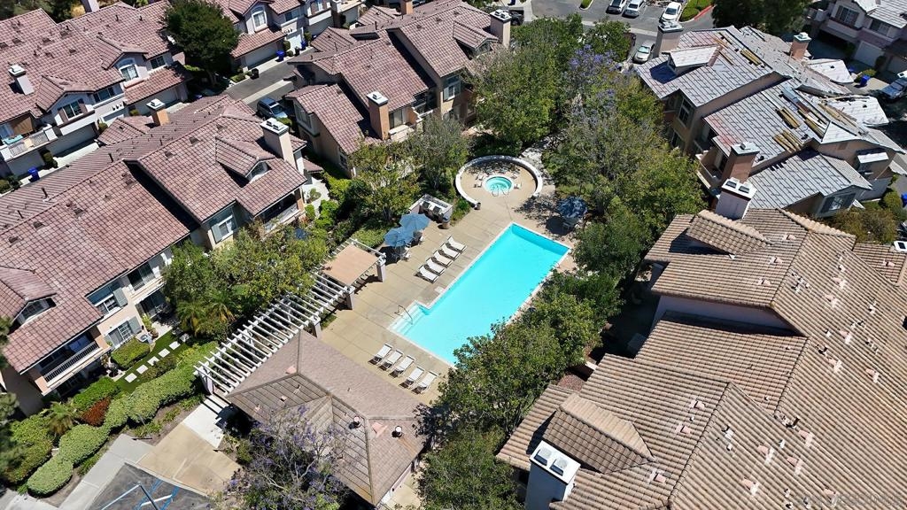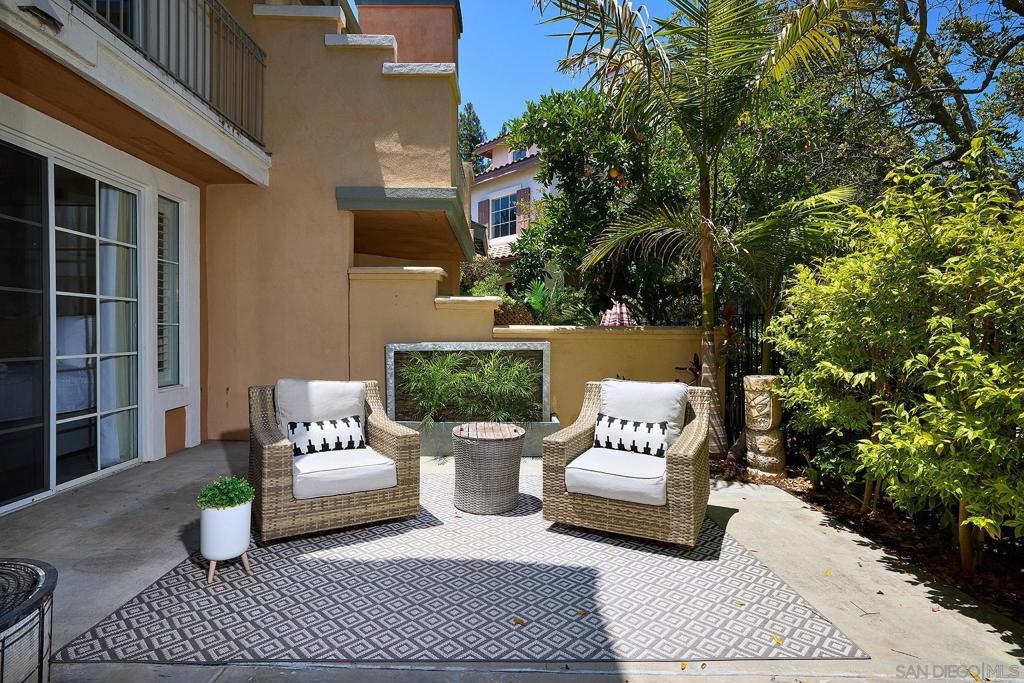 A new look! Freshly painted interior! Move-in ready! Stylish and chic 2 bed, 2 bath gem in Collage of Carmel Mountain Ranch. Step into 1076 sq ft of comfort featuring newer luxury vinyl plank flooring and updated baths. Living room boasts a fireplace with stacked stone facade and slider to private outdoor patio. Need to beat the heat? No problem with central air conditioning! Private 1-car garage and interior, full-size laundry. But the real showstopper? An expansive, private patio area for gathering or relaxing! Poway Unified Schools. The outdoor space is perfect for al fresco dining or your morning coffee. Enjoy the convenience of indoor laundry. And when it's time to unwind, take a dip in the community pool. This home is a rare find – stylish, functional and just waiting for you to make it yours. See floor plan in documents section below photos.
