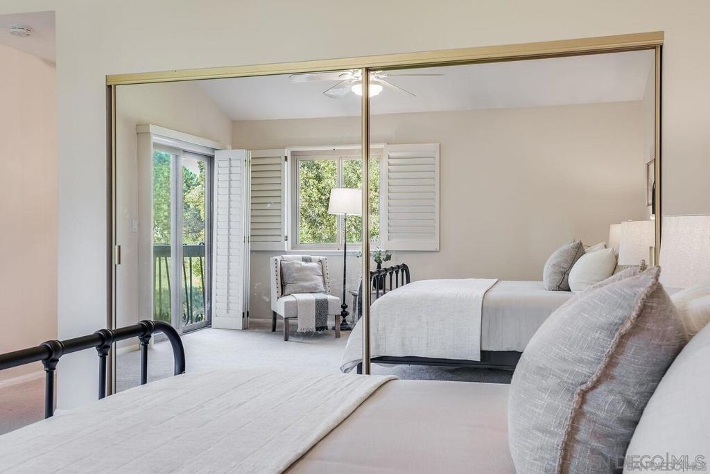 Welcome to 12058 Caminito Campana, a stunning upper-level condo perfectly situated overlooking the 16th hole tee box of the renowned Rancho Bernardo Inn Golf Course. This beautiful 3br, 2ba residence features a spacious, thoughtfully designed layout enhanced by vaulted ceilings, creating an open and airy atmosphere that ensures comfort and convenience at every turn. As you enter, you’ll appreciate the seamless flow of the all-on-one-level living space—a difference you can truly feel—enhanced by ample overhead lighting in every room. The pride of ownership is evident throughout, from the dual-pane windows to the plantation shutters that adorn each window, providing both style and energy efficiency. The galley kitchen is a chef’s delight, equipped with high-end KitchenAid stainless steel appliances, including a refrigerator with a convenient water filtration system—no more Brita struggles! Organized storage is a breeze with two convenient drawers beneath the range—no more searching for pots and pans! The kitchen can easily be closed off to guests, children, or pets via two doors, making it perfect for entertaining. Beautiful tile flooring flows through the entryway, kitchen, and bathrooms, while plush carpet in the living areas provides a cozy feel that welcomes you the moment your bare feet touch the floor. For added convenience, the unit includes an in-unit laundry area equipped with an industrial-grade Speed Queen washer and dryer, making laundry day a breeze. This exceptional condo is the perfect retreat for those seeking a blend of comfort, style, & a vibrant community! Enjoy the convenience of stepping onto your balcony from either the master or dining area, where you can watch golfers and soak in the serene atmosphere—creating an ideal escape for everyone, from remote workers and stay-at-home parents to busy professionals and pet parents. It’s a perfect spot to unwind and enjoy the peaceful surroundings! Storage is abundant throughout the condo, with well-designed spaces in the kitchen, closets, pantry, and hall. The large attic, easily accessible from the master bedroom, and a spacious outdoor closet are ideal for keeping your home organized and clutter-free. Parking is convenient, with one designated spot and plenty of additional parking available; the prior owners never had trouble finding a space. Guest parking is also easily accessible, and there are several electric charging stations within the complex for added convenience. With one of the lowest HOA fees around, residents of Campana Villas enjoy access to the recently renovated RB Swim and Tennis Club, which offers a full gym, pools, a jacuzzi, tennis courts, a playground, and options for pickleball—providing ample opportunities for recreation and relaxation. Families will appreciate that this condo falls within the highly sought-after Poway Unified School District, ensuring excellent educational opportunities for children. Convenience is at your doorstep, with Vons and numerous shops within walking distance, as well as two Target locations just a short drive away. Plus, enjoy quick access to the freeway for easy commuting and exploring the surrounding area. You’ll also be close to the Rancho Bernardo tech hub, home to major companies like Apple's new SD hub, Teradata and Sony PlayStation, along with various defense contractors. While our pictures may capture its beauty, the true charm of this home is an experience you need to feel. So come visit! Don’t miss your chance to make this beautiful residence your home!