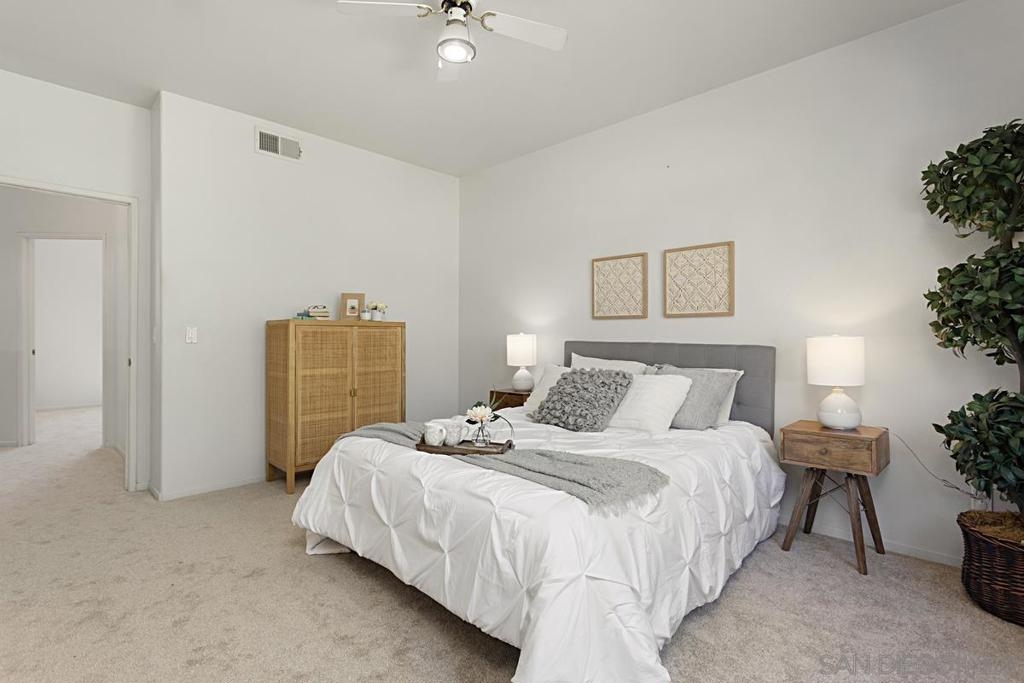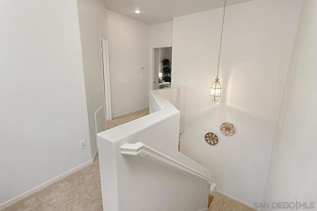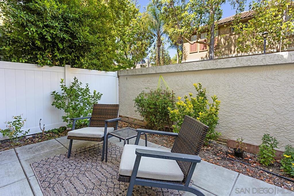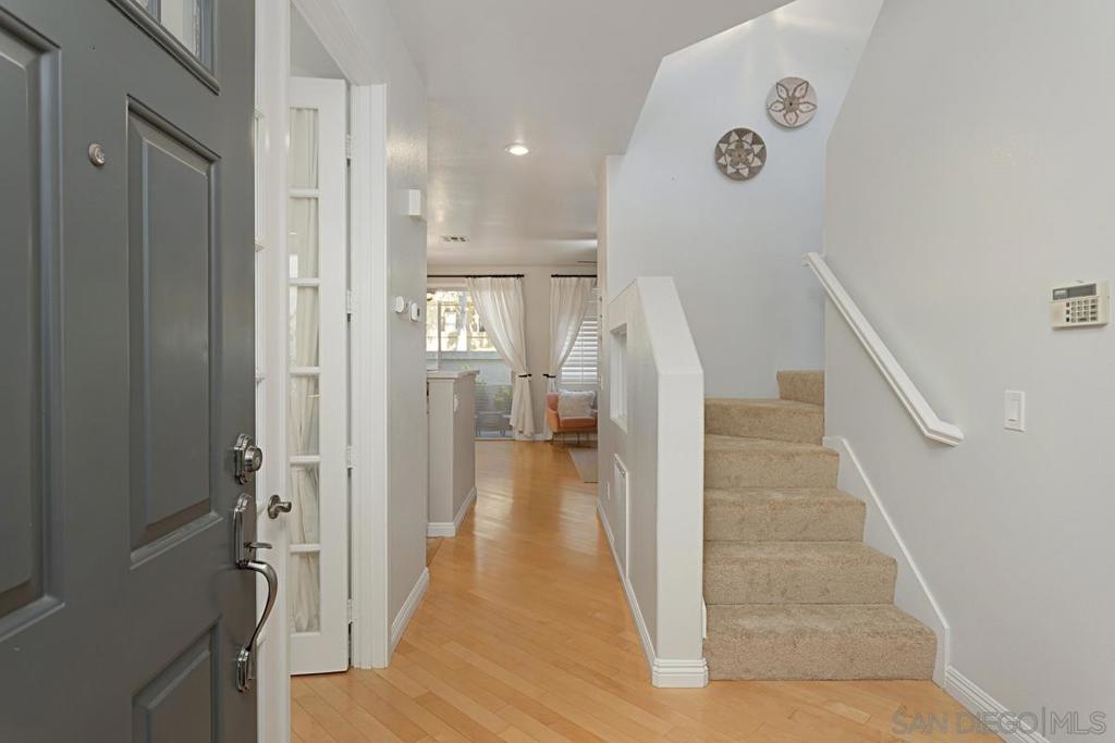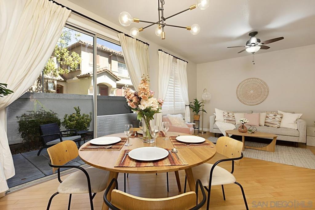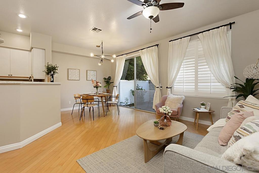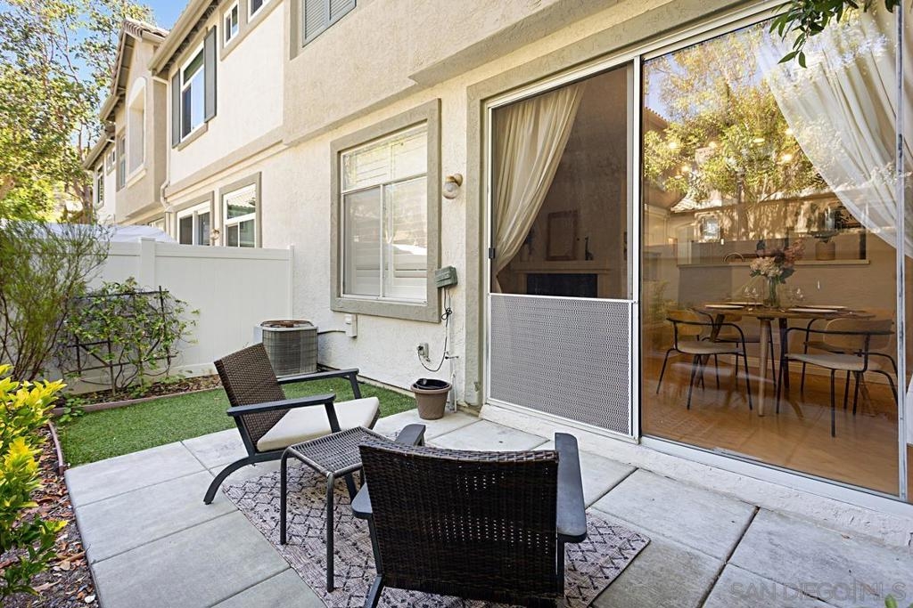 Welcome to this move-in ready gem in Sabre Springs! This east-facing condo/townhome boasts an abundance of natural light and features an open layout connecting the kitchen, dining, and living areas. The optional full bedroom downstairs is a big plus. Recent updates include brand-new carpet upstairs, fresh paint downstairs, a new dishwasher, water heater, and newer Quartz kitchen countertops. Downstairs boasts hardwood flooring. Upstairs, two comfortable bedrooms each have their own full bathroom. The upgraded master bath includes a double vanity and standing shower. Parking is ample with a one-car garage, a driveway, and one assigned uncovered spot. HOA COVERS WATER, TRASH, POOL, GYM, AND EXTERIORS OF THE HOUSE! Outside, a private patio sets the stage for outdoor gatherings and entertaining. The location offers a safe environment, creating the perfect space for kids to play freely. Being just a stone's throw away from the I-15 freeway, restaurants, and shops ensures that everything you need is within easy reach. Don't miss out on this wonderful opportunity to call this place your new home!