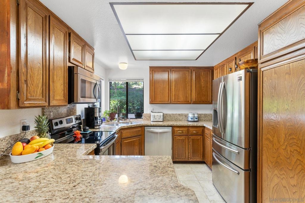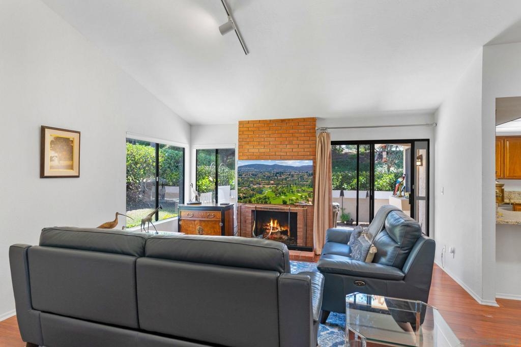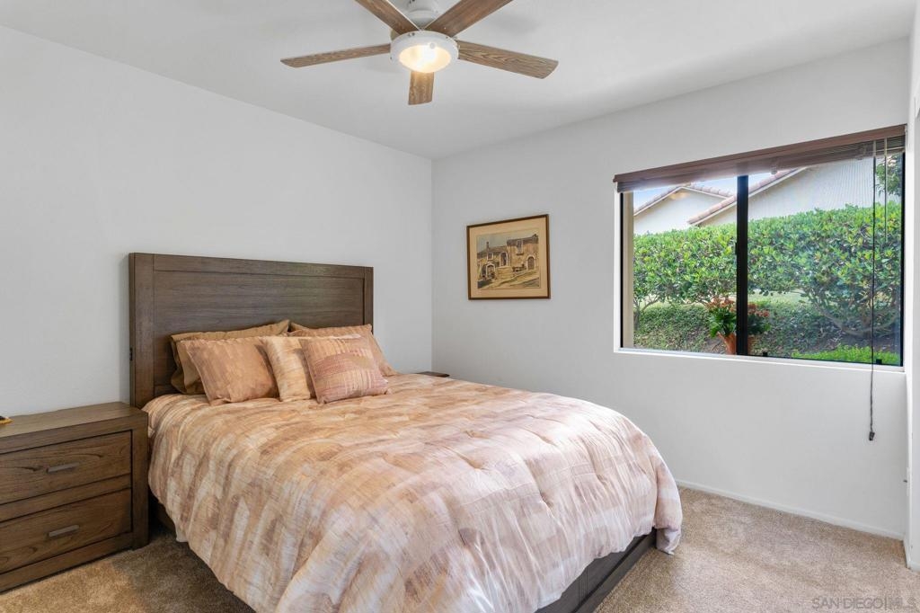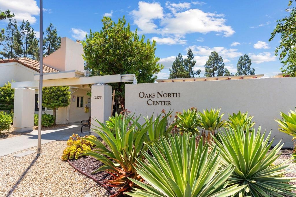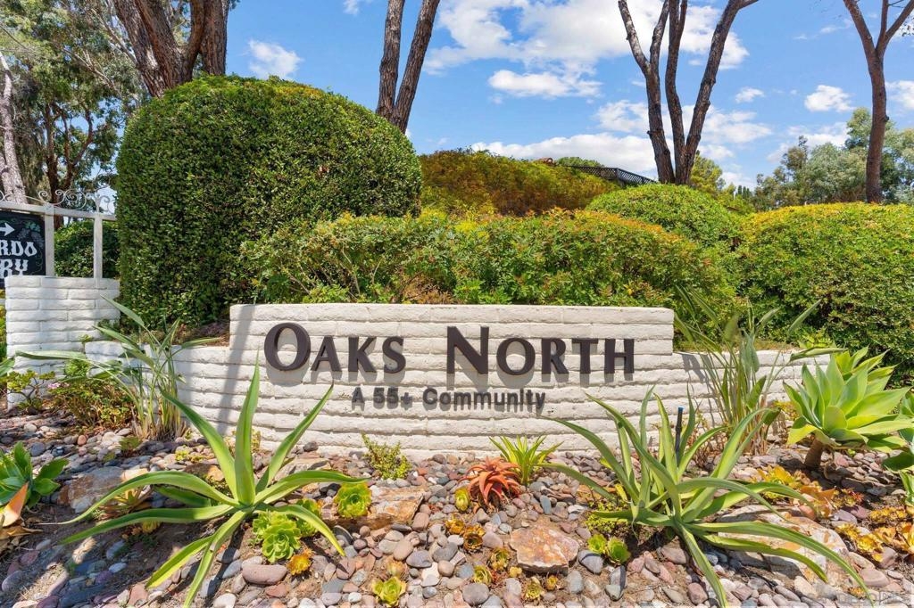 Price Reduced! Welcome to Oaks North, the epitome of a 55+ Active Adult Community! Discover the charm of this single-level 3-bedroom, 2-bath end-unit home with 1 car garage, meticulously cared for and ready for you to move in. As you step inside, you'll be greeted by a bright and open living room with vaulted ceilings, laminate flooring, cozy carpeting, and a welcoming fireplace, creating the perfect ambiance for relaxation. The functional kitchen boasts wood cabinets and granite countertops, providing ample space for all your culinary adventures. The spacious main bedroom features vaulted ceilings, a large walk-in closet, and a door leading to a private front patio, offering a serene retreat. The bathroom is enhanced with vanity, mirror, and light fixture, adding a touch of elegance to your daily routine. The open third bedroom presents a versatile option for your home office, ensuring you have the perfect space for productivity. Step outside to the back patio and immerse yourself in a park-like setting with mature trees providing shade and picturesque views of the community grassy area. Oaks North is not just a home; it's a lifestyle. The community boasts a clubhouse, exercise room, pool and spa, tennis, pickleball, and lawn bowling courts. With various classes offered to cater to all interests, you'll never run out of things to do. Conveniently located approximately one mile east of the Rancho Bernardo Winery and one mile south of the Oaks North Golf Course, you'll have easy access to local attractions. This home is a rare find and won't last long.