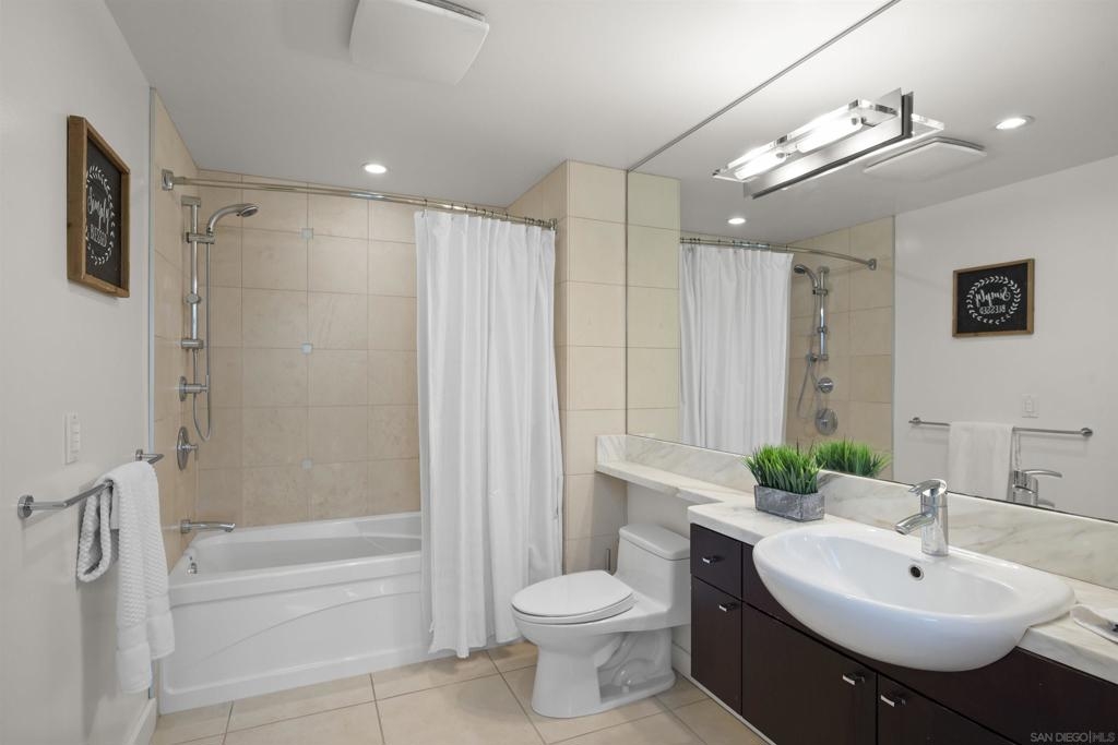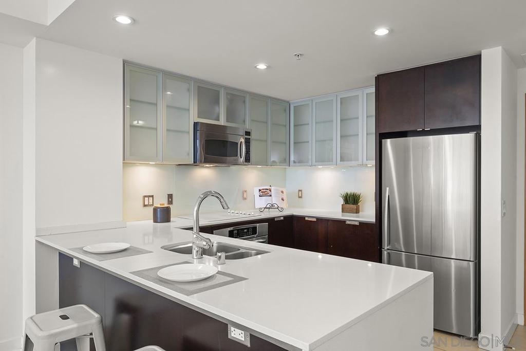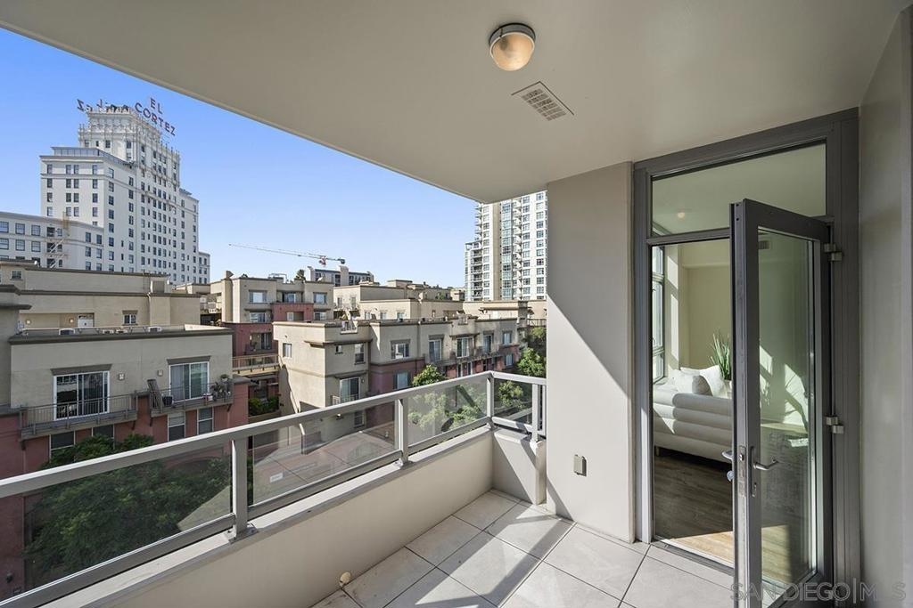 Capture the best of Downtown San Diego living in this 6th-floor, west-facing Aria residence. Enjoy city views and sunset skies from your private balcony. Inside, this spacious one-bedroom features modern "Woodacres Oak" luxury vinyl flooring, abundant natural light, and an open layout ideal for both relaxation and entertaining. The kitchen impresses with stainless appliances, recessed lighting, quartz counters and a stylish eat-at bar with a waterfall edge that is perfect for casual dining. The bedroom offers comfort and privacy with an ensuite bathroom and generous closet space. Added conveniences include in-unit stackable washer/dryer and a secured parking space. Perched in the highly sought-after Cortez Hill neighborhood, residents enjoy a serene, residential atmosphere just minutes from Downtown San Diego’s premier dining, shopping, cultural attractions, and the vibrant Gaslamp Quarter. Discover modern luxury living in one of Downtown’s most charming and well-connected communities. Located atop Cortez Hill, the highest point in San Diego, Aria was completed in 2008 and comprises 137 units. This prime location is set away from the city's hustle and bustle, offering both tranquility and convenience. Residents can enjoy a short stroll or drive to Balboa Park and the vibrant offerings of Downtown San Diego, coupled with excellent freeway access for broader travels. Aria residences boast spacious outdoor balconies and terraces, enhancing the living experience with modern comforts and stunning views of the bay, Balboa Park, and the city skyline. The building's amenities include a fitness center, lap pool and spa, club room with a catering kitchen and wet bar, all designed to elevate the quality of life for its residents.