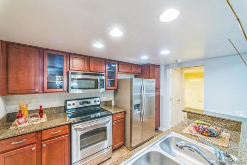 Well-maintained light & bright lower level 1-bedroom condo in a great community! Step inside to laminate wood floors & an updated kitchen with gleaming wood cabinetry, granite counters, & SS appliances. The spacious bedroom features laminate wood floors along with mirrored closet doors. The private patio area extends the living space of this fantastic condo. Located in the desirable Villa Taviana complex, resort-style amenities include two pools, a clubhouse, a fitness center, a tennis court, BBQs, & electric car hookups! Ideal Rancho Bernardo location close to shopping, dining, world-class golf courses, Poway School District, & the I-15 freeway.